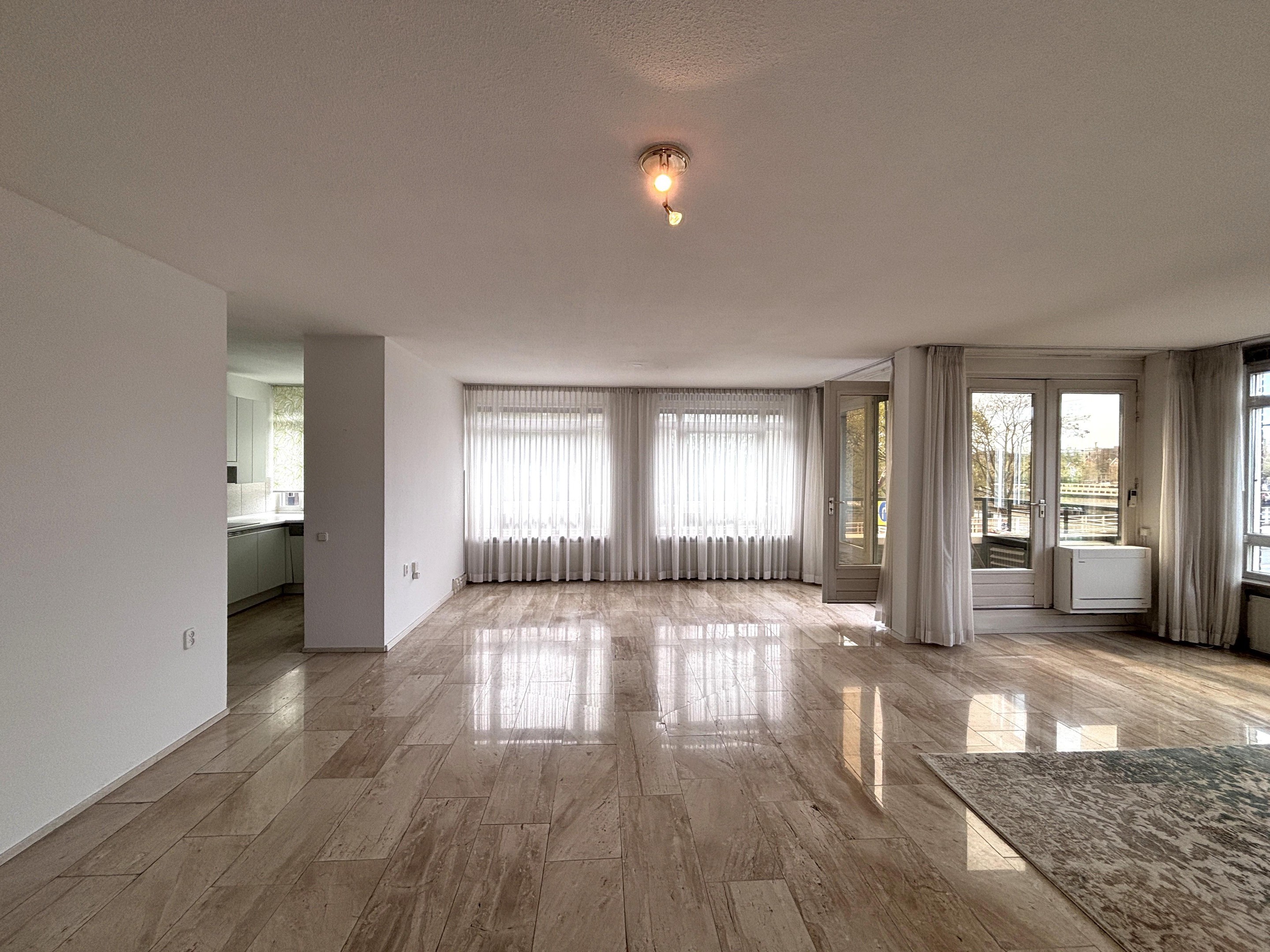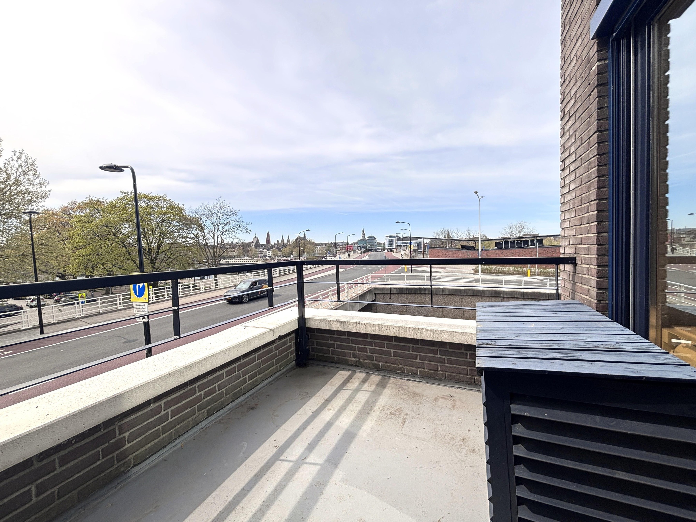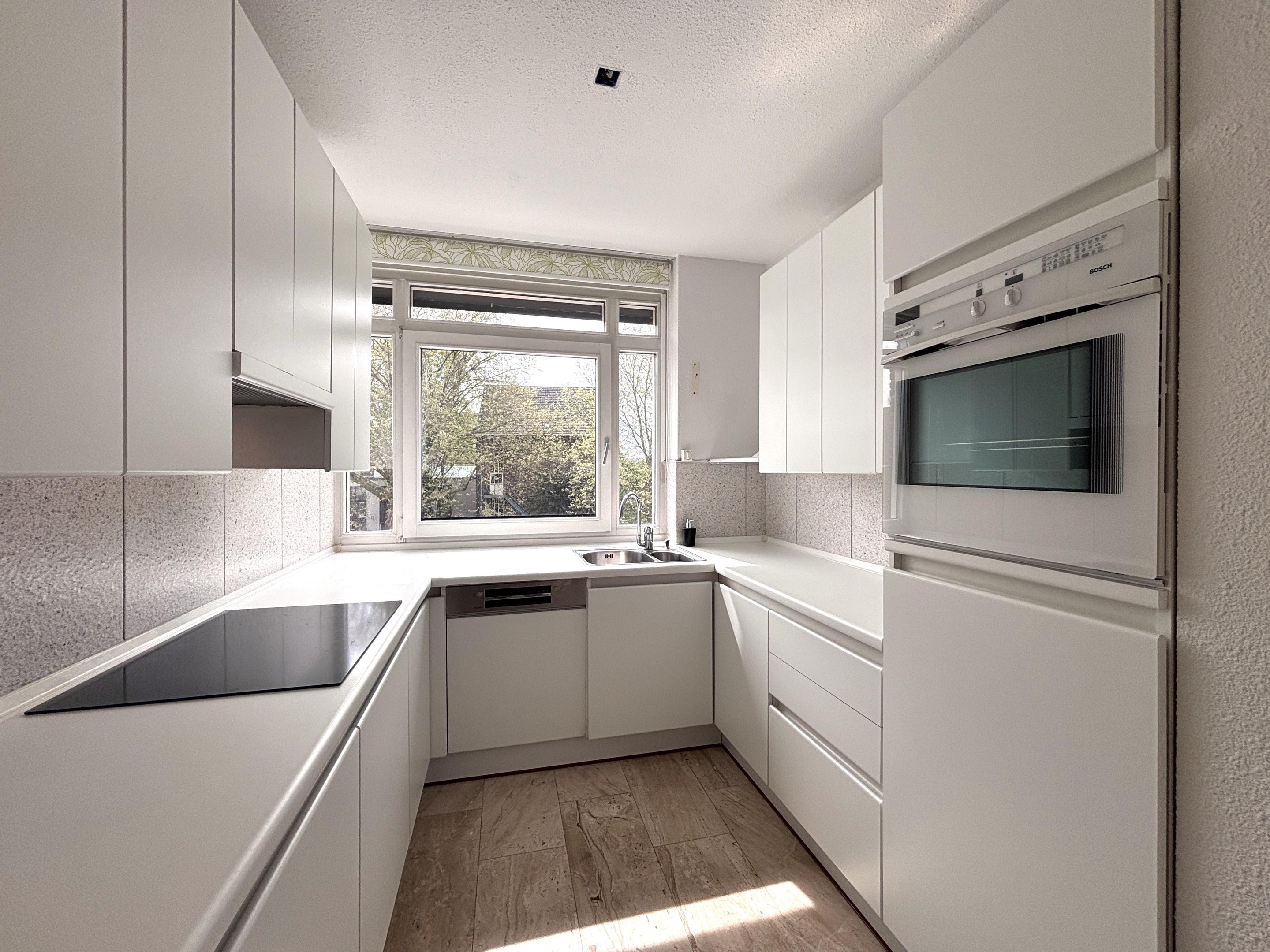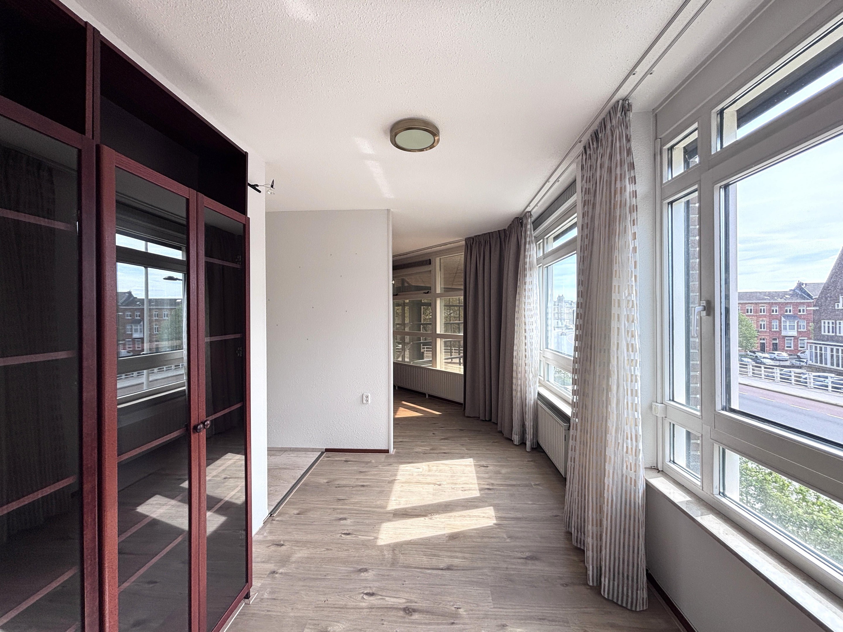 De woonkamer is royaal opgezet en valt direct op door de grote raampartijen. Deze zorgen niet alleen voor een prettige, open sfeer, maar ook voor een overvloed aan natuurlijk licht. Vanuit de woonkamer is er bovendien een fraai uitzicht over de Wilhelminabrug, wat bijdraagt aan de beleving van de ruimte. Daarnaast biedt de woonkamer directe toegang tot het balkon, waar men heerlijk buiten kan zitten en kan genieten van de omgeving. De open keuken sluit naadloos aan op de woonkamer en is modern ingericht. De keuken is voorzien van diverse inbouwapparatuur, waaronder een 4-pits inductiekookplaat, afzuigkap, spoelbak, vaatwasser, oven en koelkast. Aansluitend aan de keuken bevindt zich een aparte wasruimte. Hier is een aansluiting voor de wasmachine aanwezig en is er voldoende ruimte voor extra opslag.