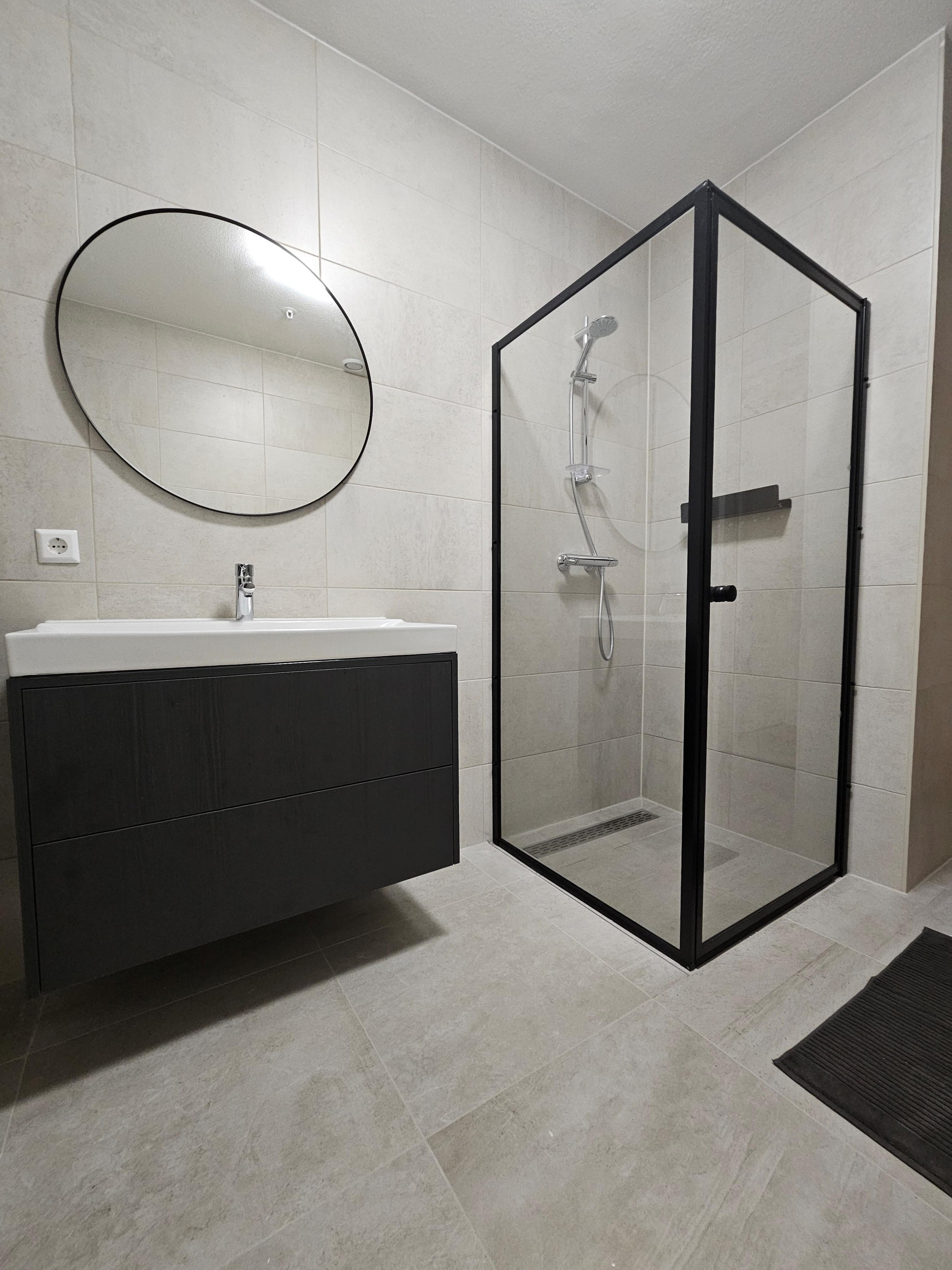 The apartment features a spacious hallway leading to a separate toilet and a spacious and luxurious bathroom with a walk-in shower, a beautiful XL vanity with vanity, and a laundry room with a washer and dryer.