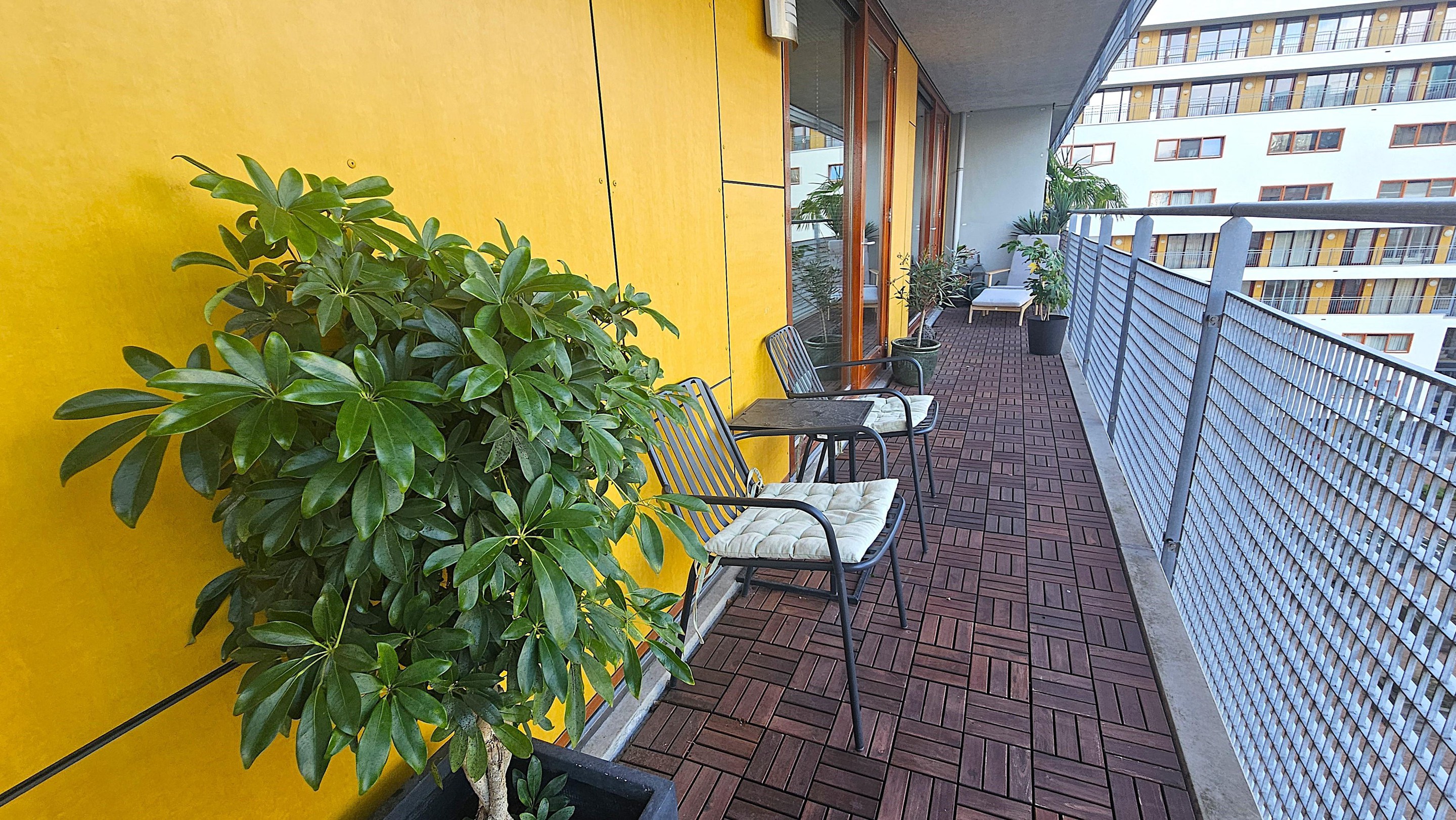 The apartment features one spacious bedroom with a stylish wardrobe and a separate office/study, ideal for those working from home or having guests. Both rooms open onto the balcony, allowing you to enjoy the view and fresh air from there as well.