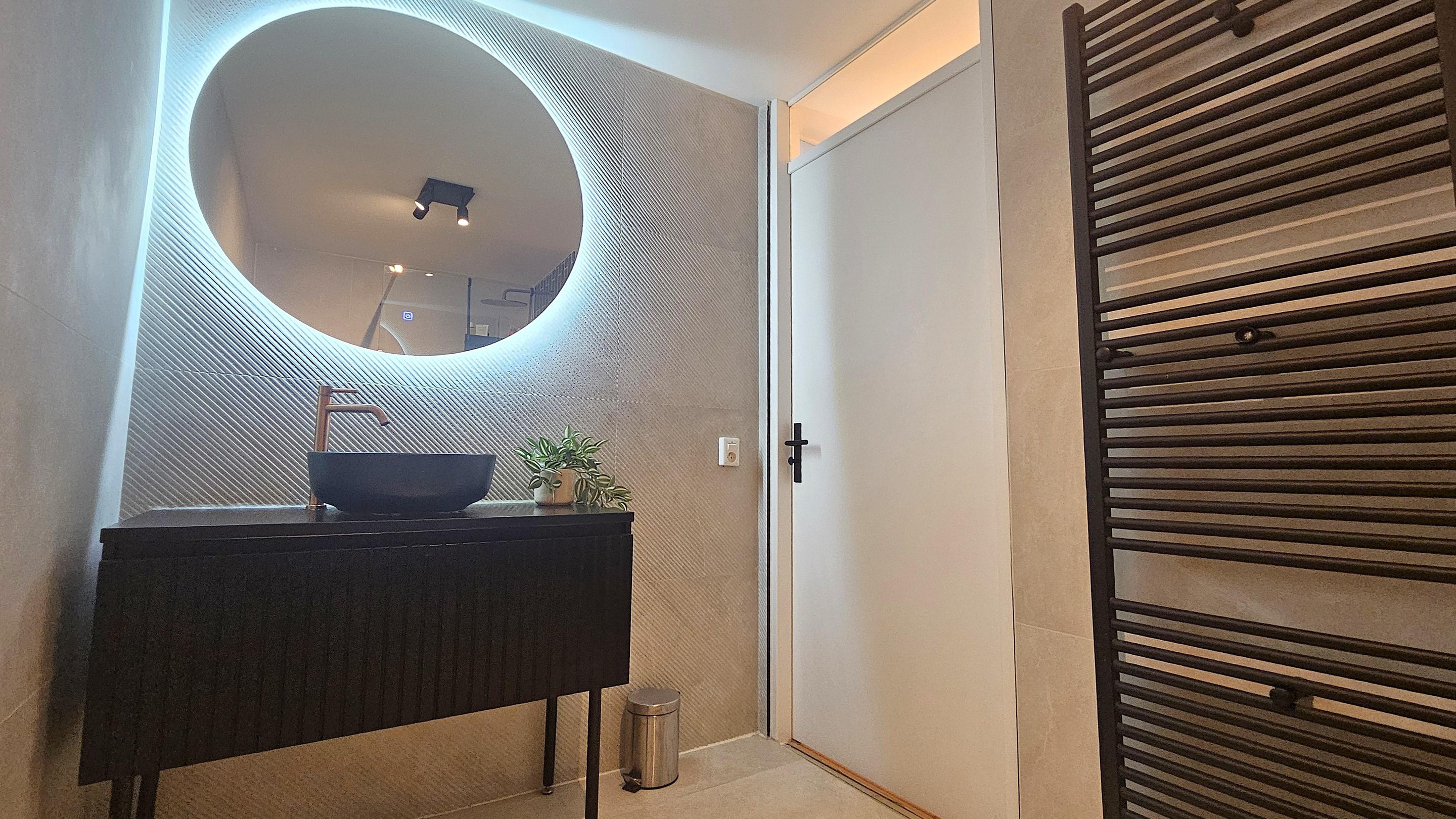 De luxe badkamer straalt rust en kwaliteit uit, voorzien van een ruime inloop regendouche en een strak vormgegeven wastafelmeubel. Daarnaast is er een separaat toilet en een aparte wasruimte met wasmachine en droger.