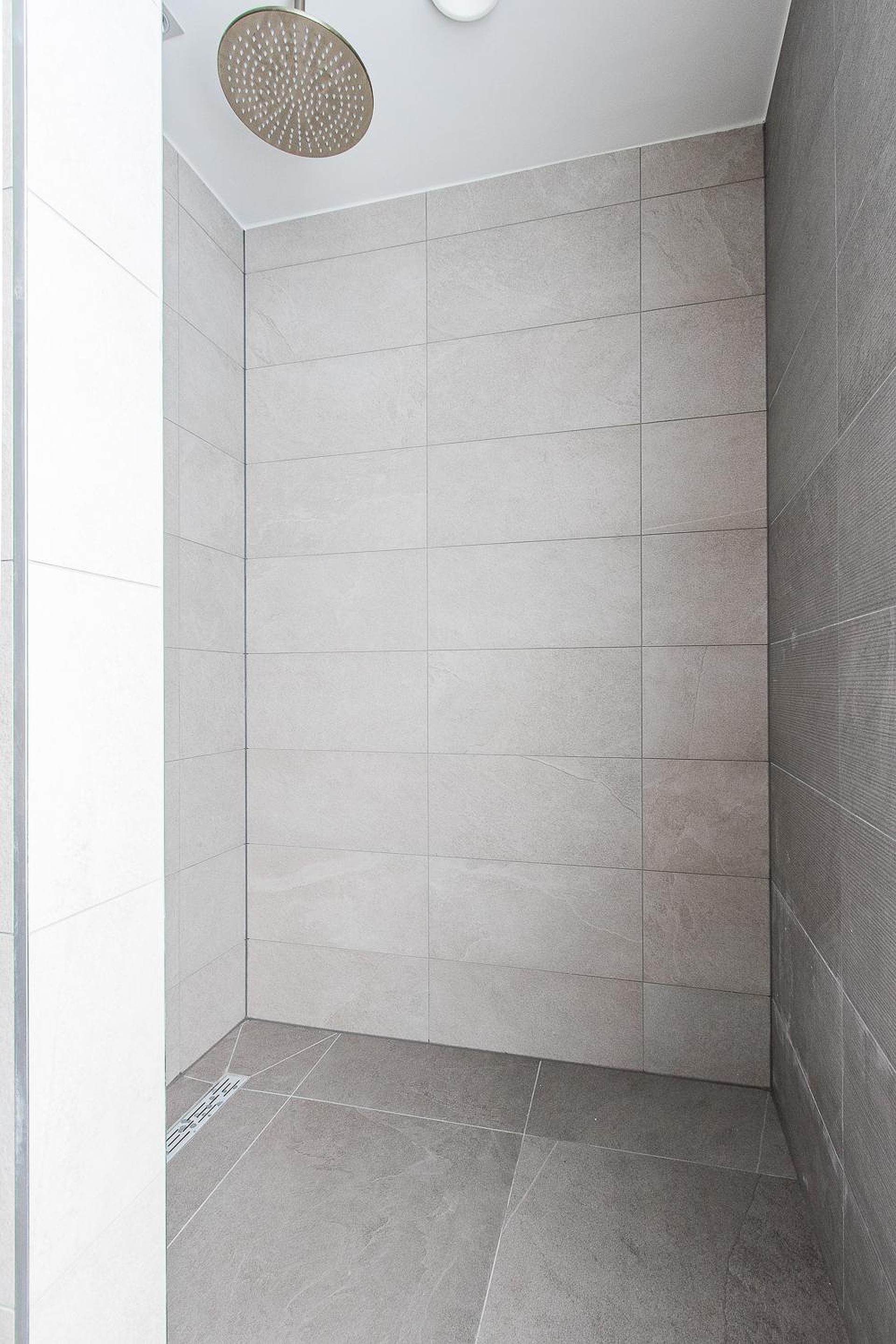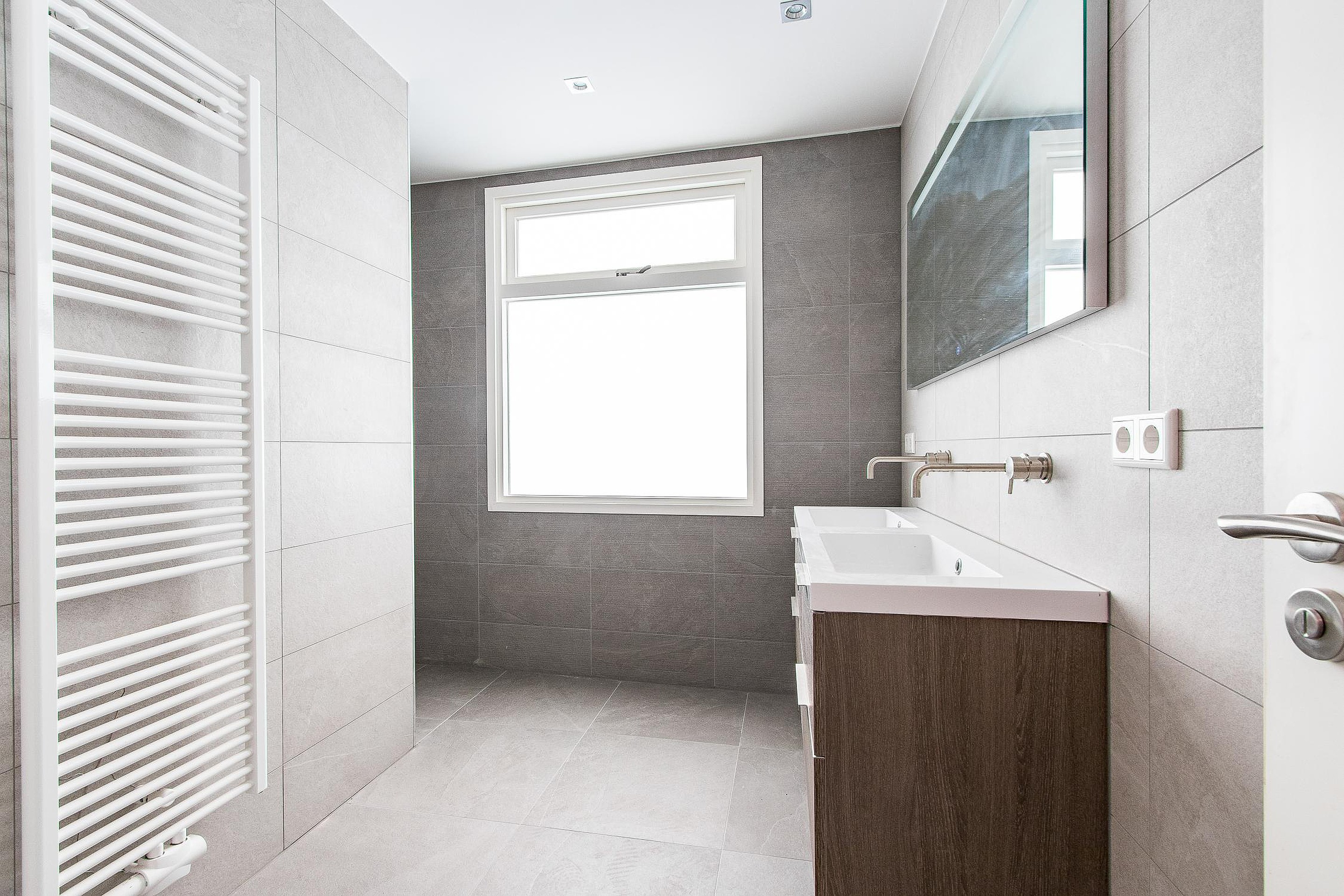 Een slaapkamer van 14,5m2 en directe toegang naar de luxe badkamer met inloopdouche en meubel.