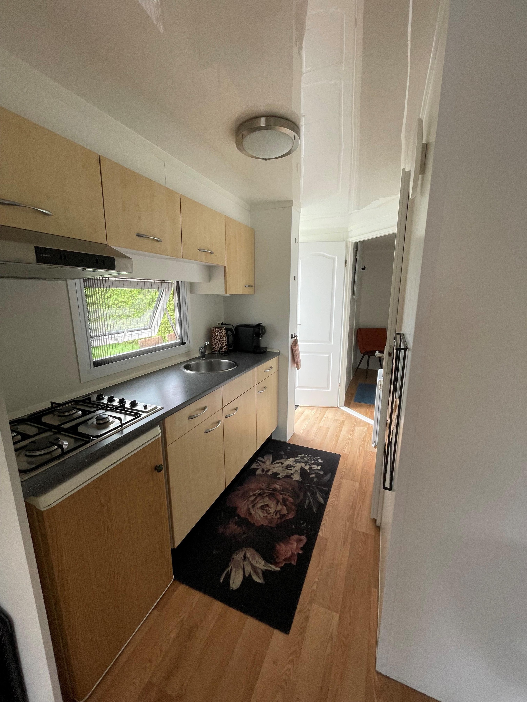 De keuken is voorzien van een koelkast met vriesvak, oven, gaskookplaat en afzuigkap