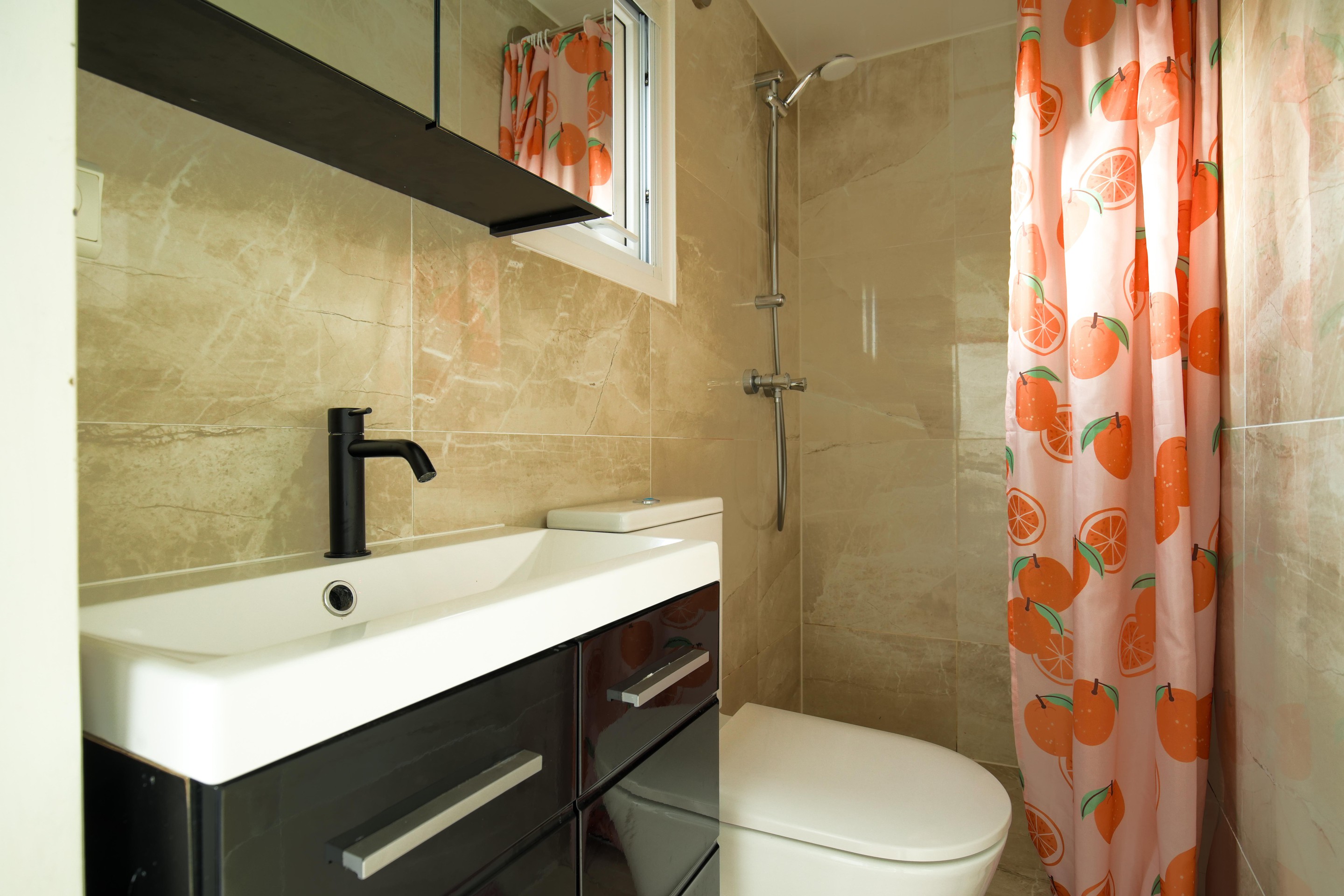 De badkamer is voorzien van een douche, wastafel + meubel en toilet