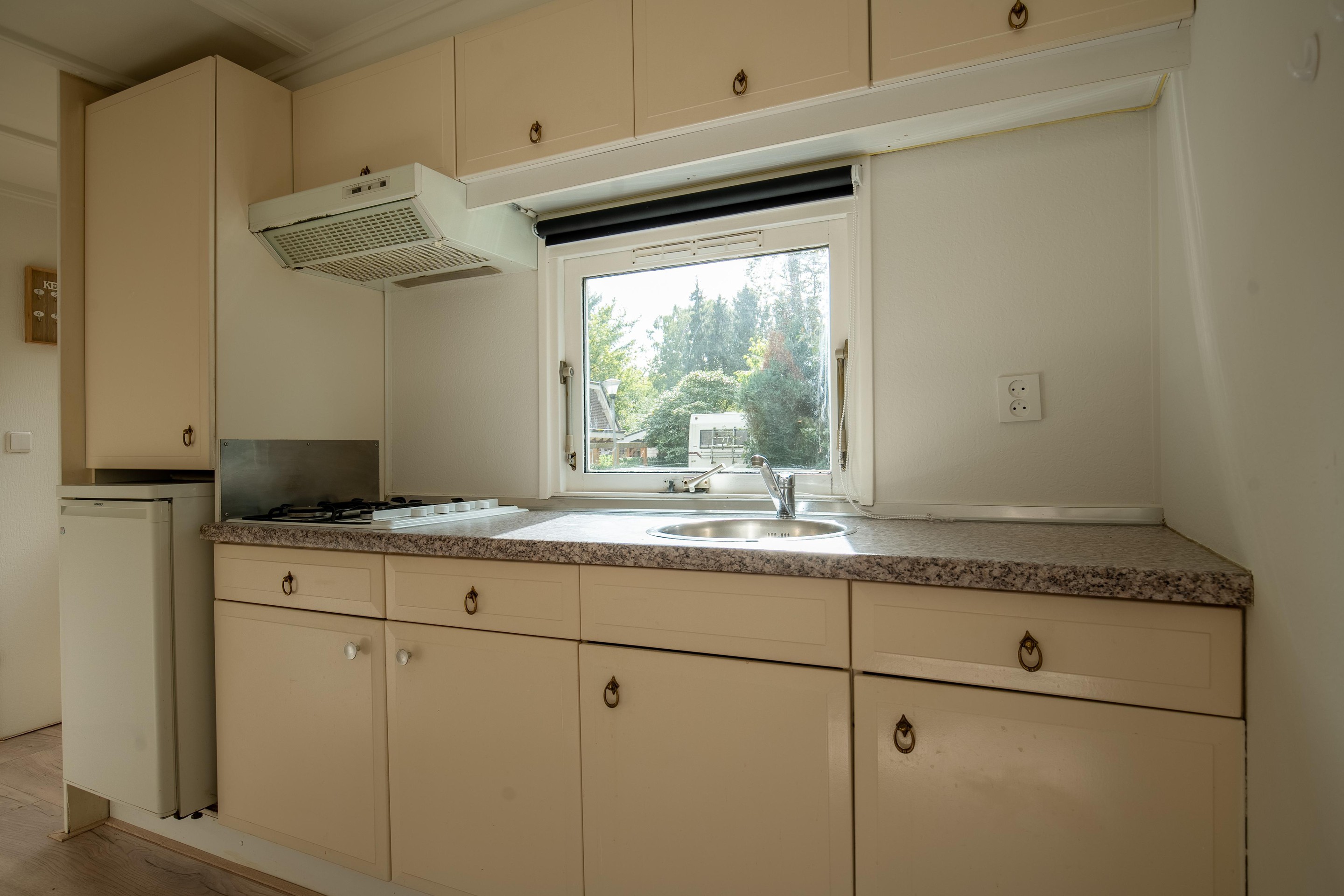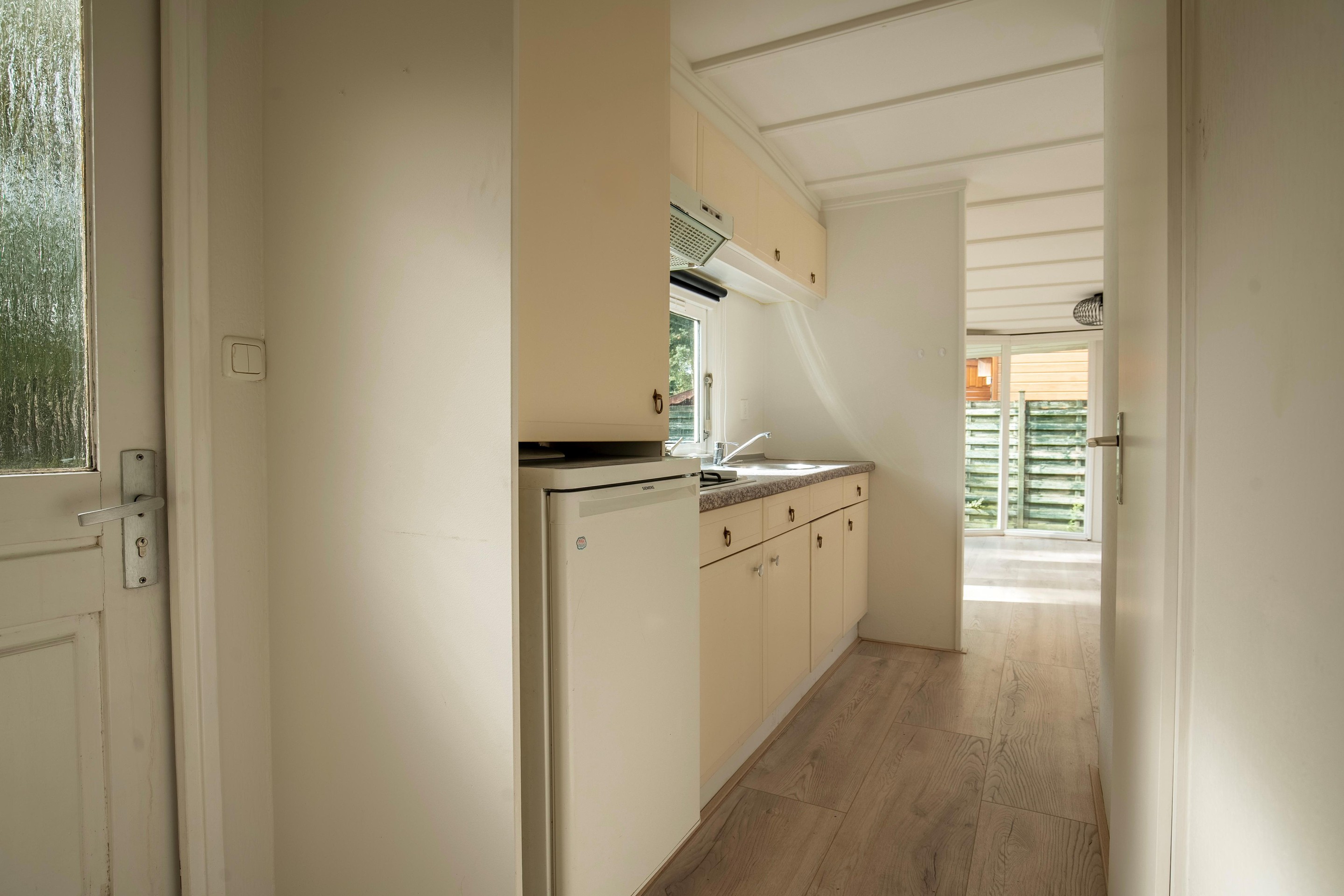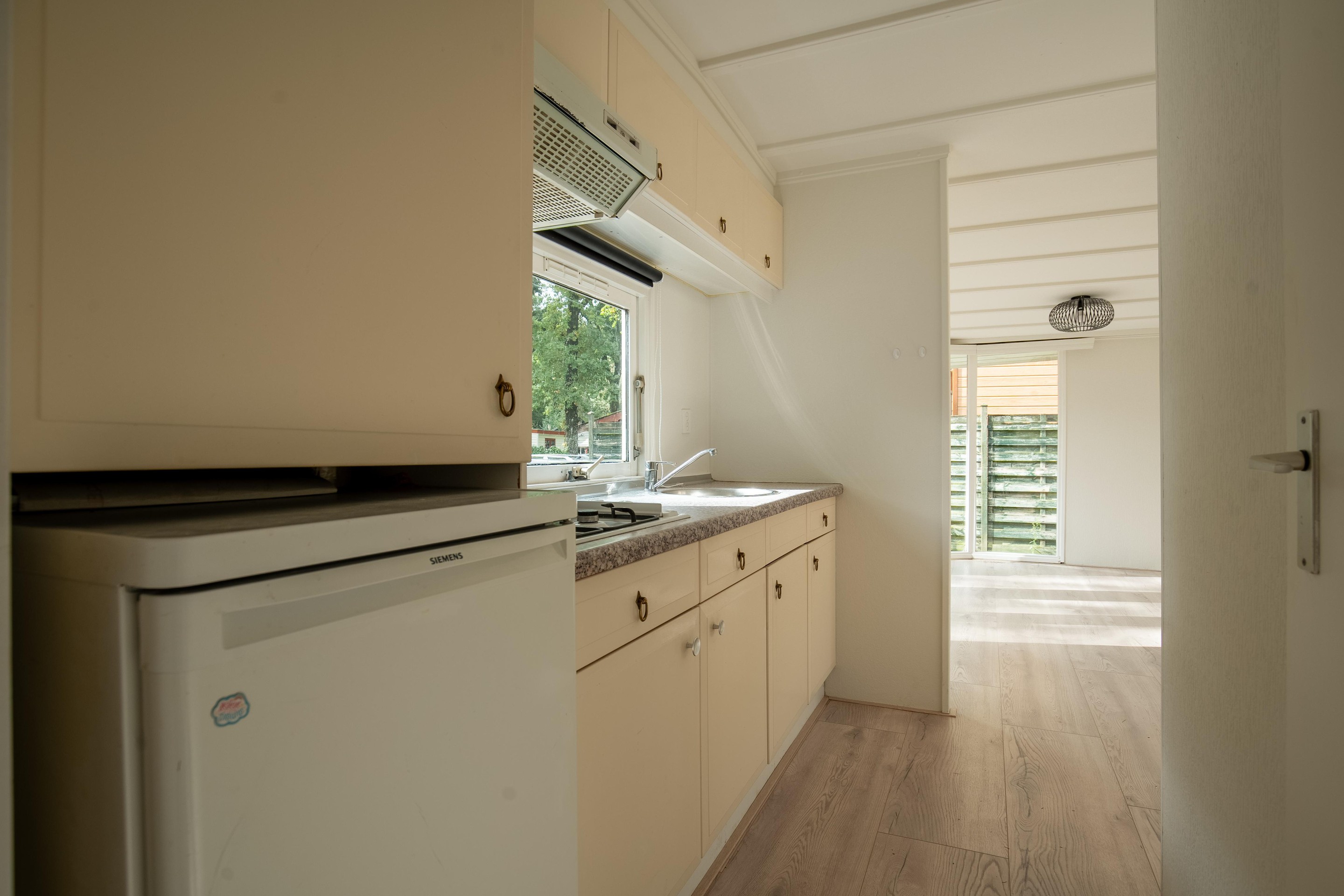 De half open keuken is voorzien van een koelkast met vriesvakje en gaskookplaat met afzuigkap.