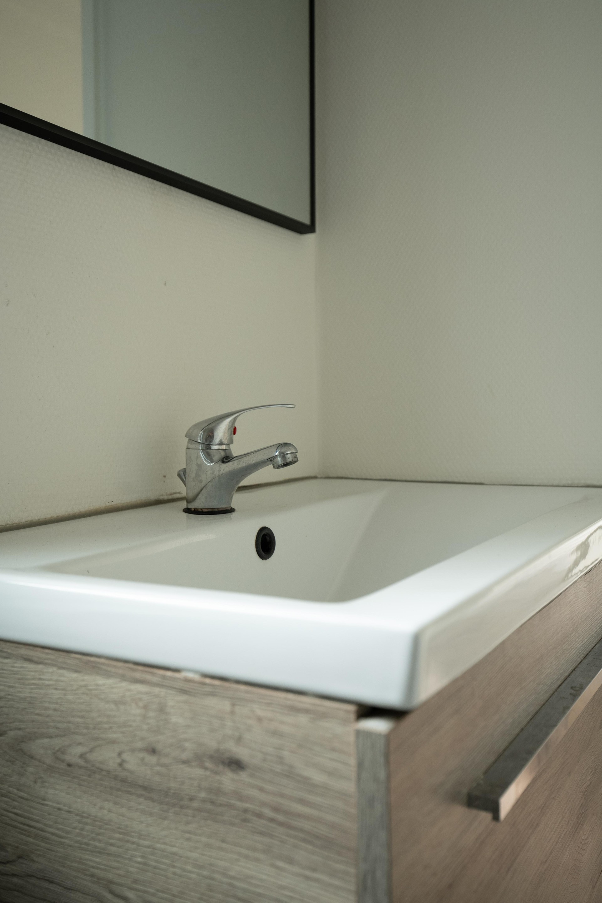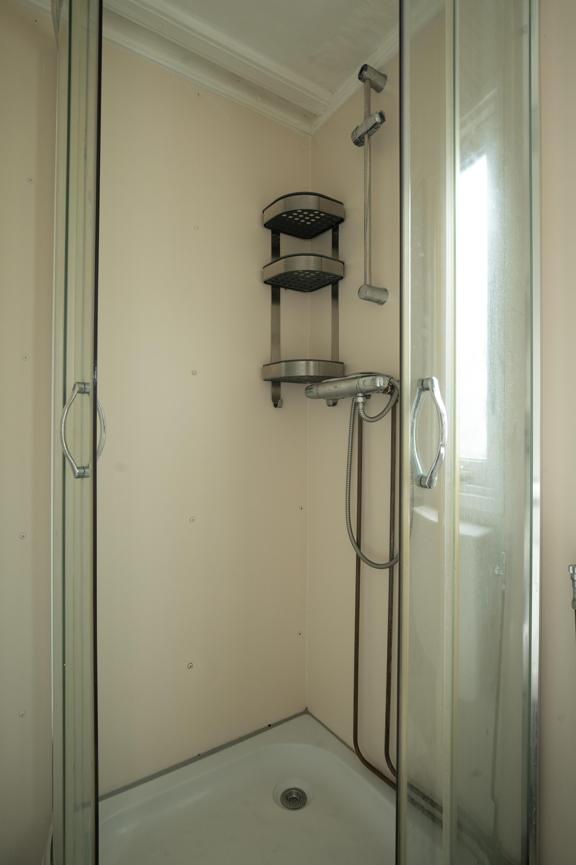 De badkamer is voorzien van een hoekdouche, wastafel + meubel en toilet.