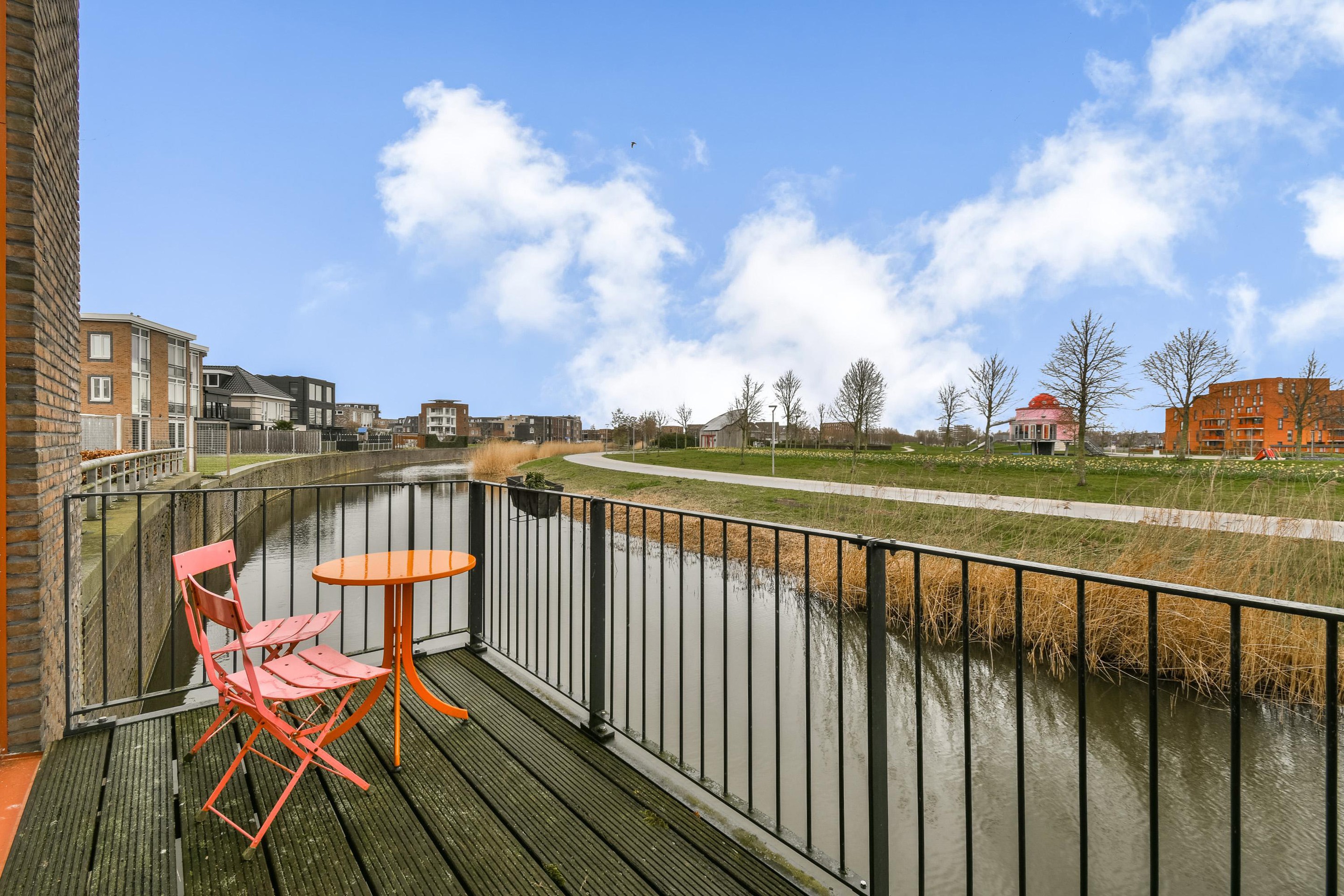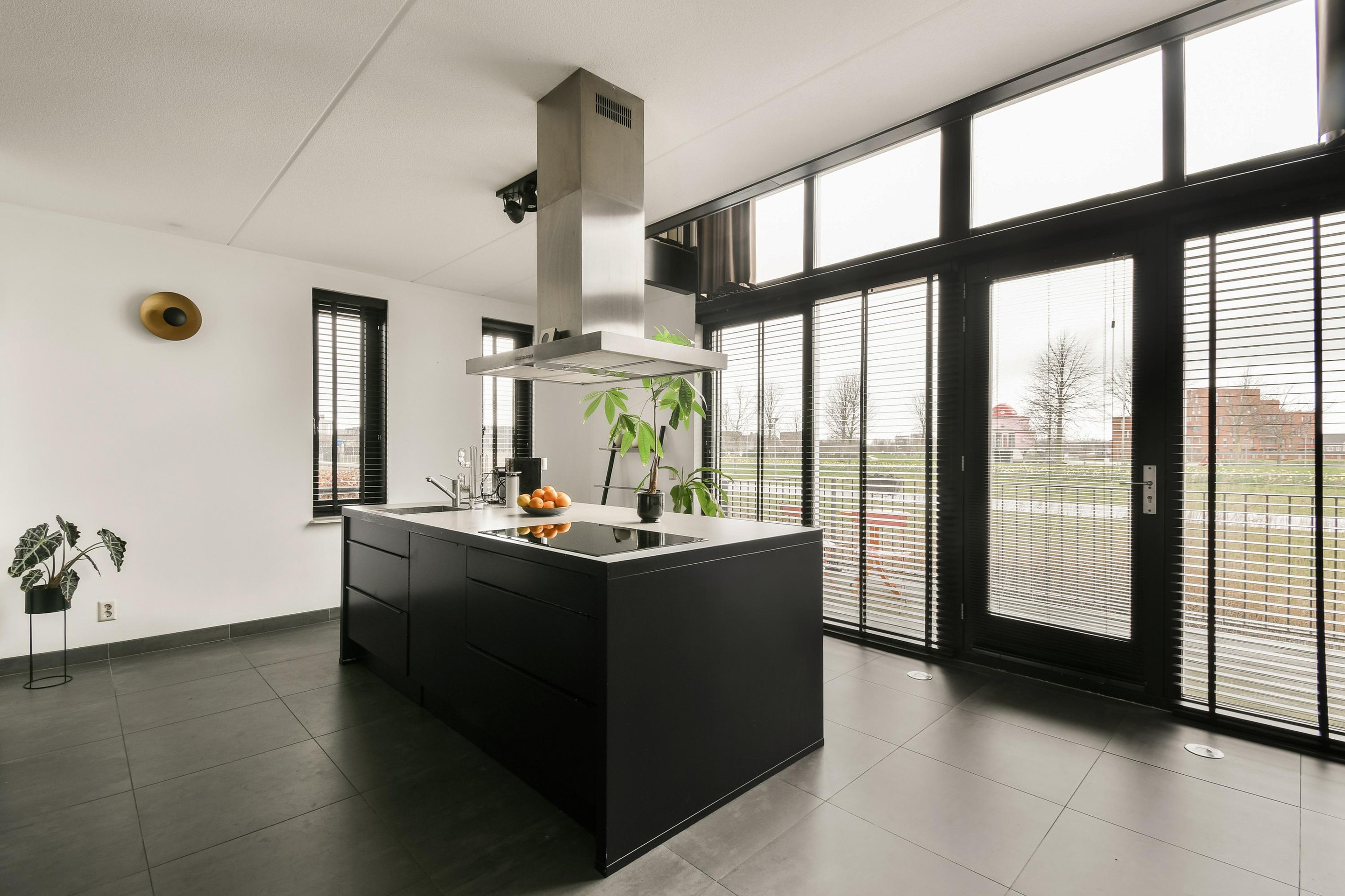 Thanks to the large windows and the partially double-height ceiling (approx. 5 meters) in the kitchen, a bright and open living space is created with an impressive sense of volume. The property features a light-filled kitchen with cooking island, a spacious living room, and both a balcony and a generous roof terrace. Both outdoor spaces offer unobstructed views over the water and surrounding greenery, creating a peaceful and pleasant living environment.