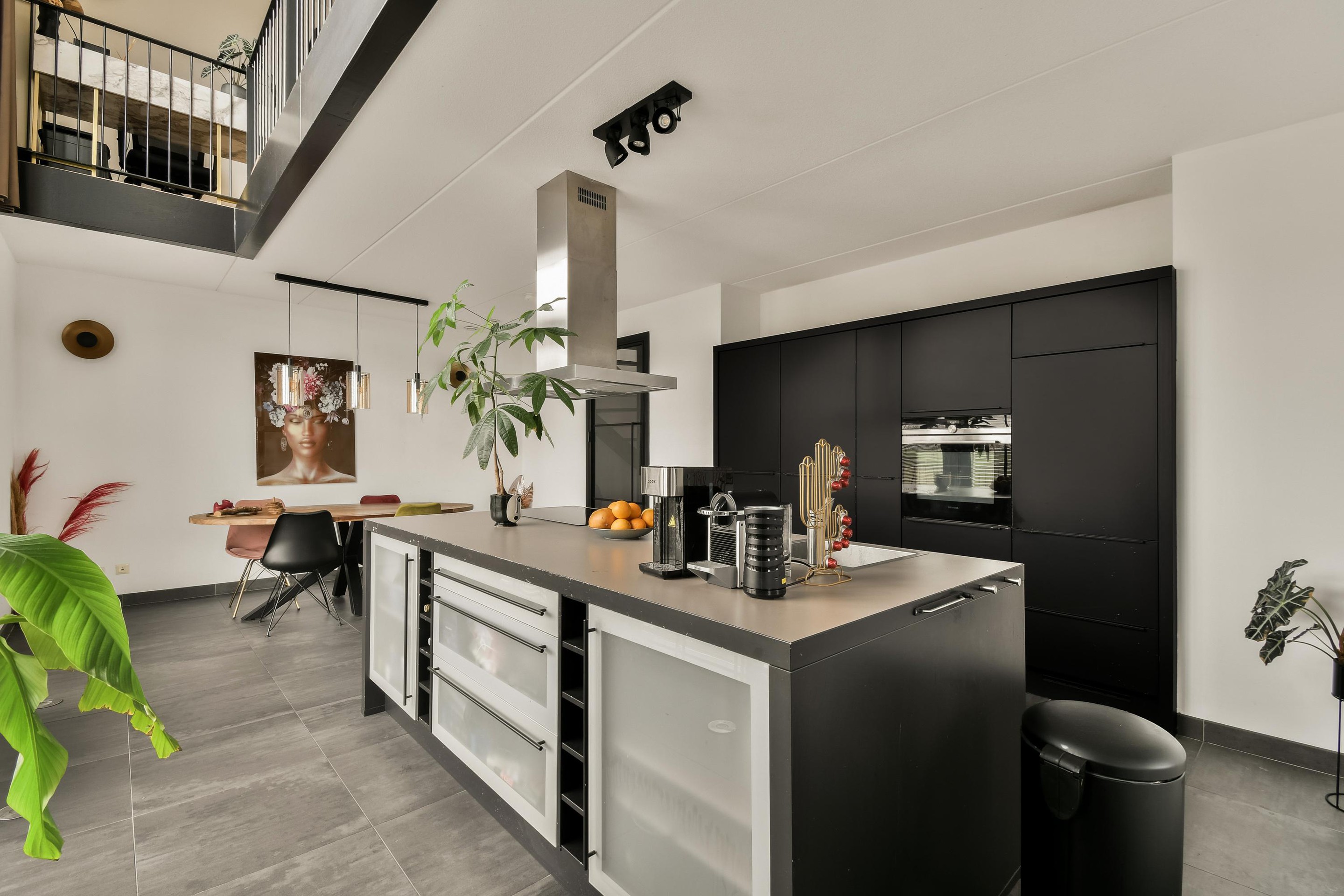 At the rear, you will find the spacious kitchen with cooking island, equipped with Siemens built-in appliances including a fridge, freezer, dishwasher, oven with steam function, induction cooktop and stainless steel extractor hood. The kitchen stands out due to its impressive ceiling height, enhanced by the large windows and mezzanine, creating a bright and open atmosphere. From the kitchen, there is direct access to the balcony with unobstructed views over the water and greenery