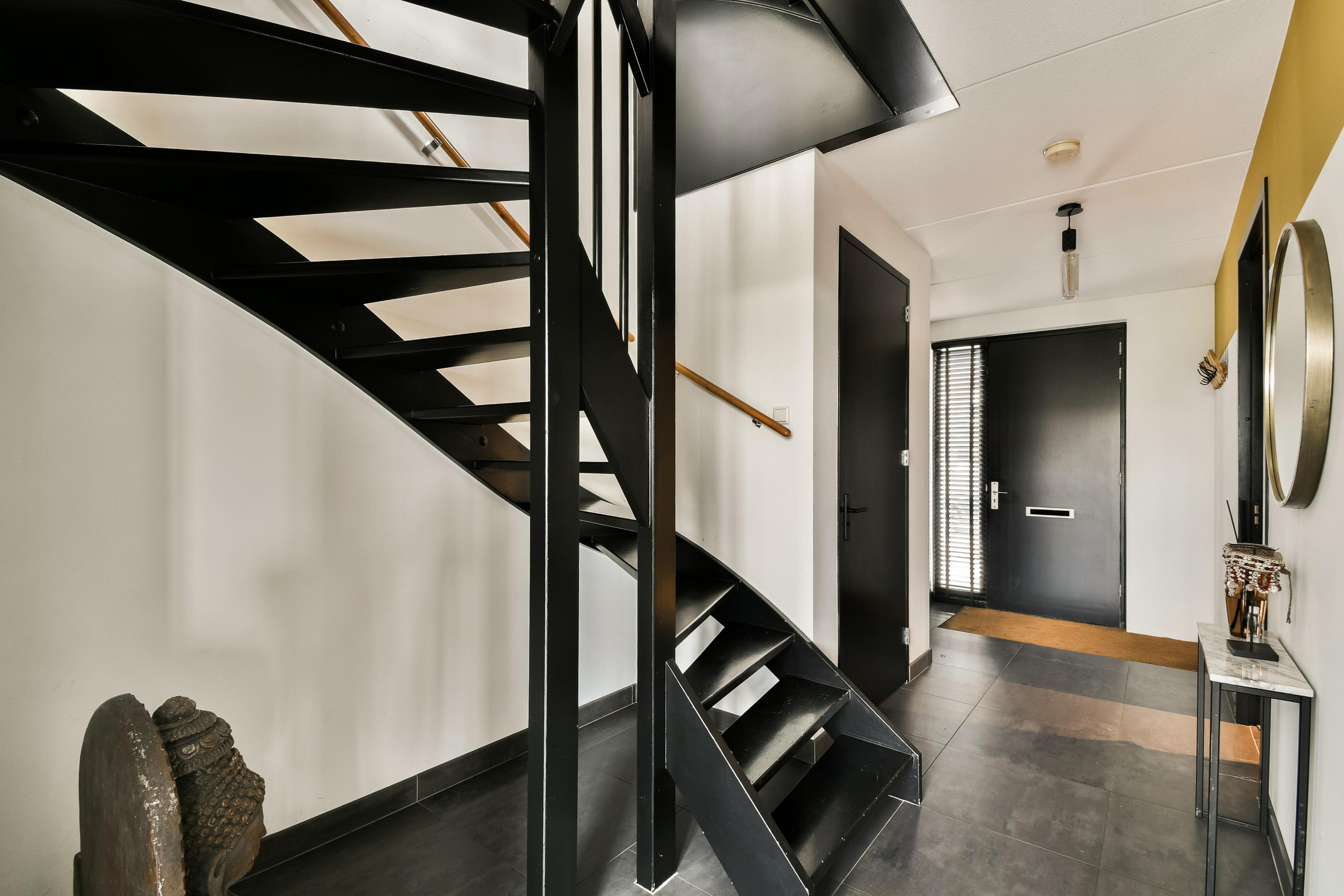 The open quarter-turn staircase is a stylish design feature and leads to the upper floor.
