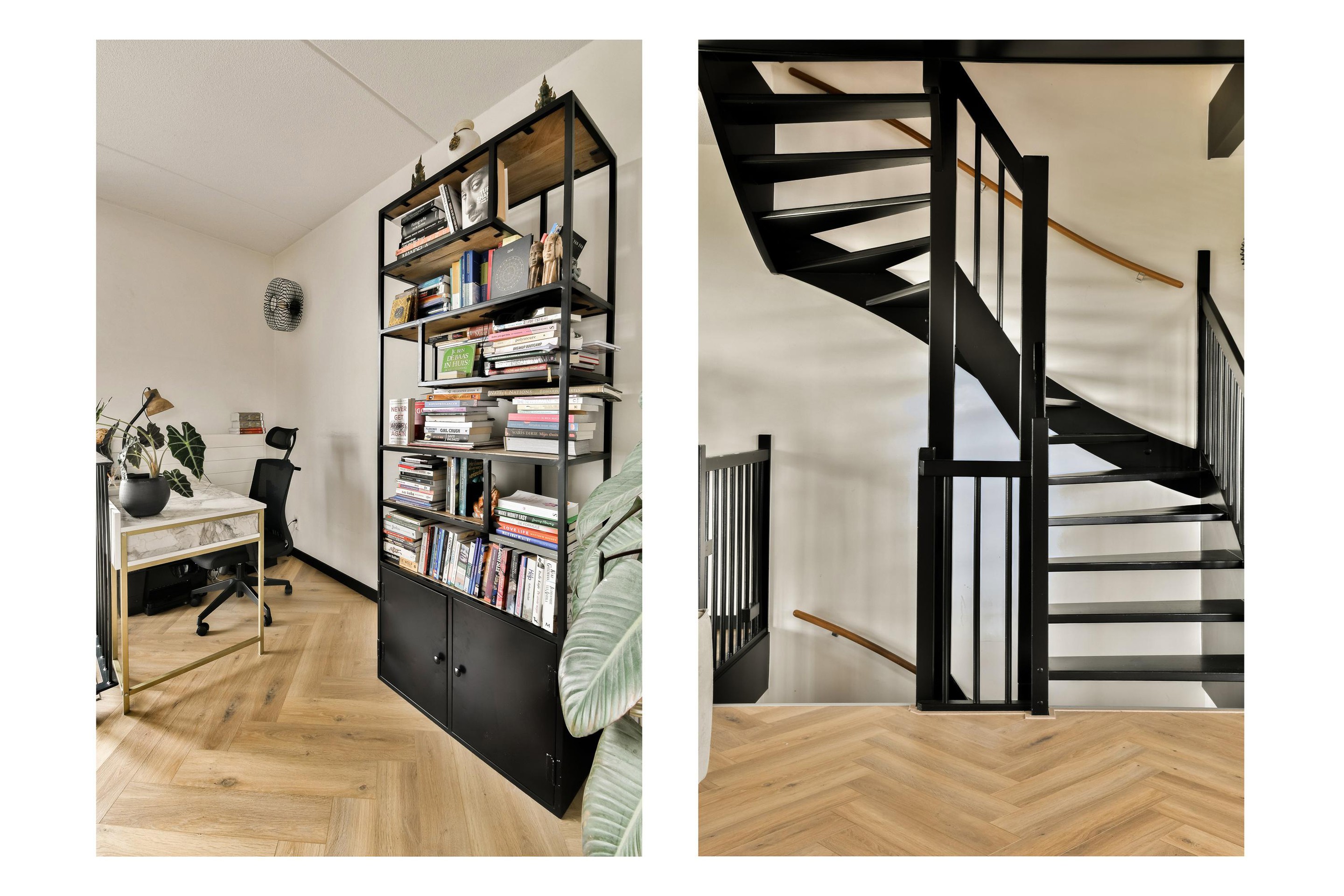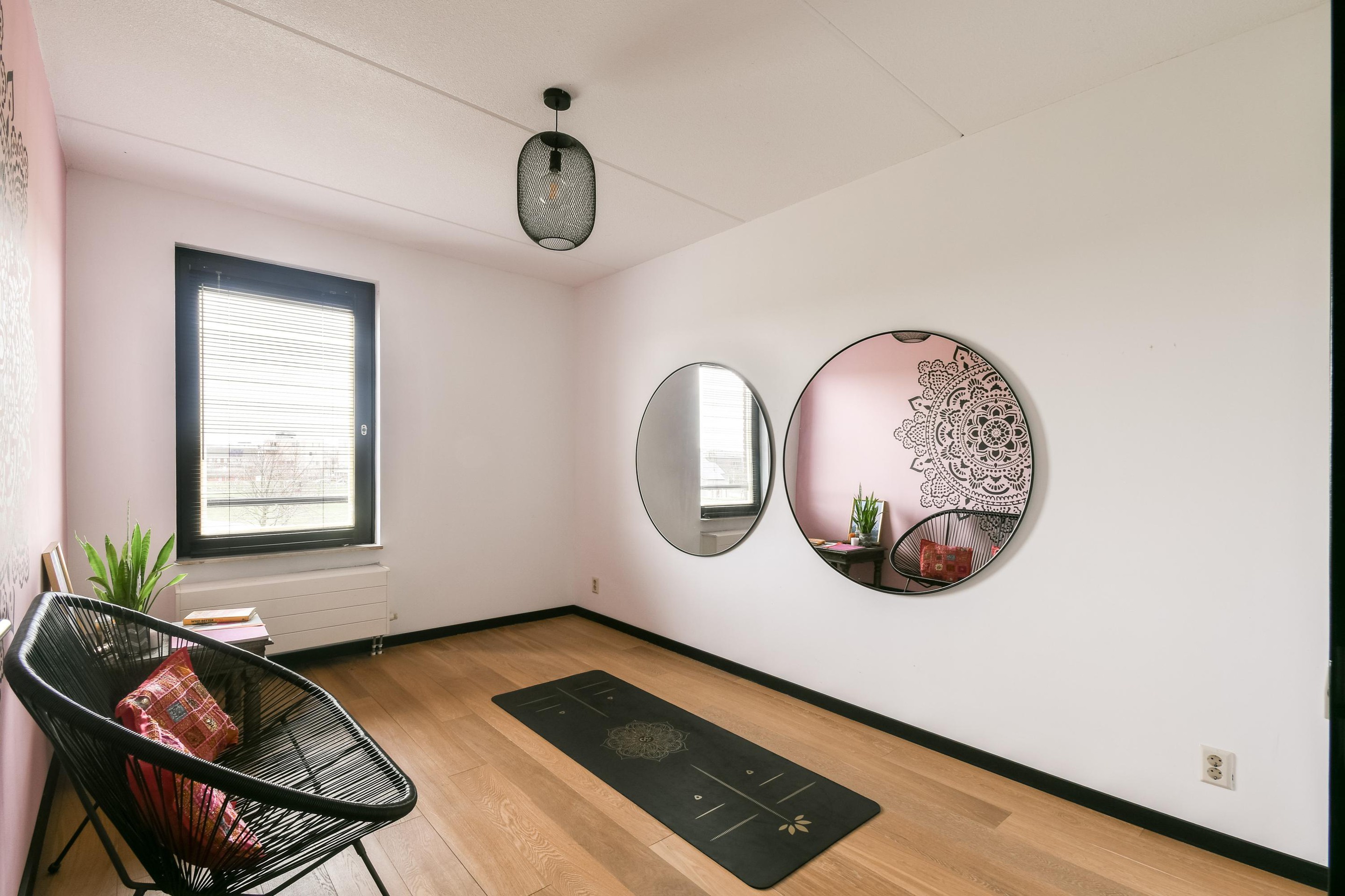 Landing with access to one master bedroom and an additional room. One bedroom is fitted with a double bed, while the other is currently used as a hobby or fitness room. At the front, there is a separate walk-in closet. The flooring on this level is finished with engineered wood flooring.