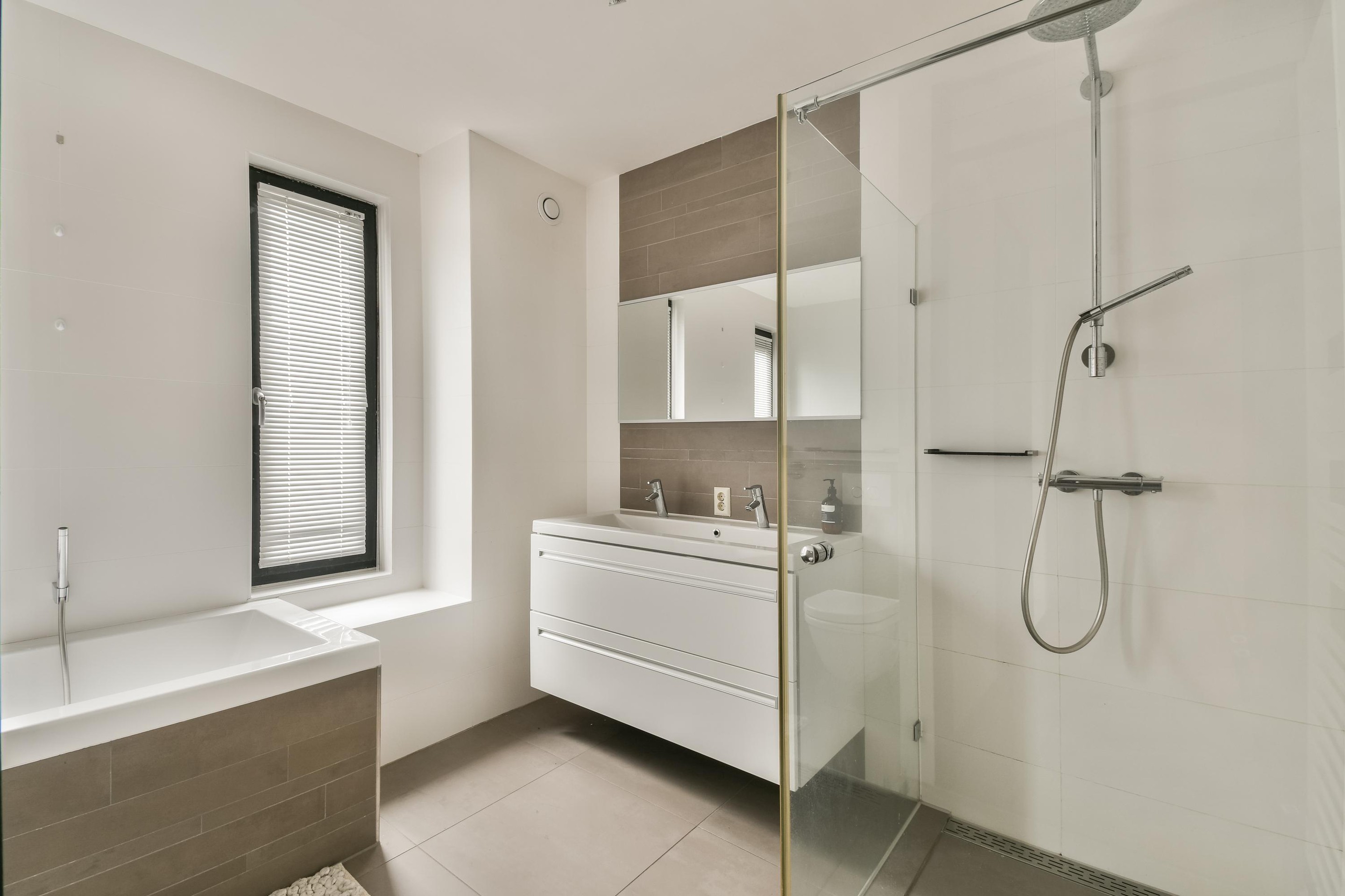 The luxury bathroom, also located at the front, features a bathtub, rain shower, double washbasin, and wall-mounted toilet. The floor is finished with luxurious taupe Mosa tiles.