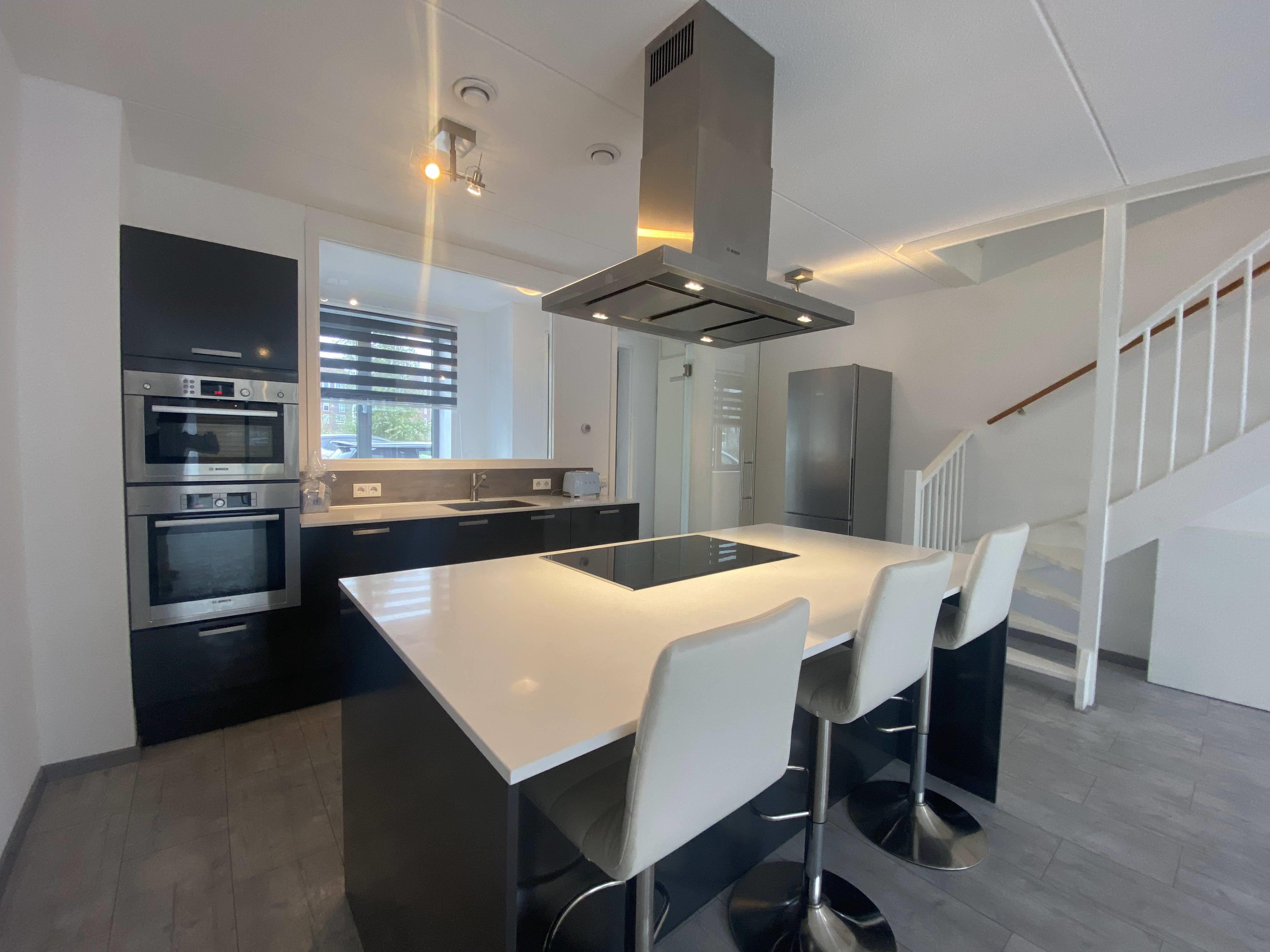 Luxe open keuken met kookeiland, voorzien van alle gemakken: oven, magnetron, inductiekookplaat, vaatwasser en een royale koel-/vriescombinatie.