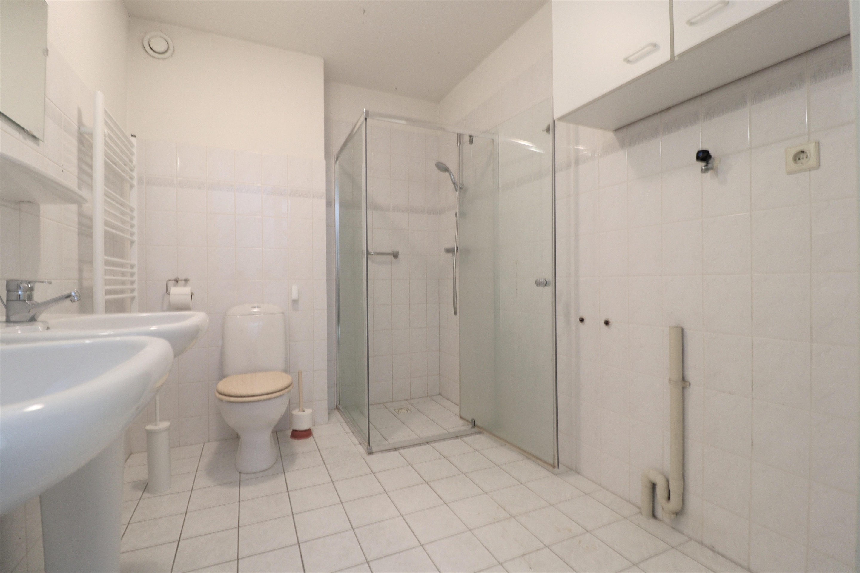 - Bathroom with shower and two sinks