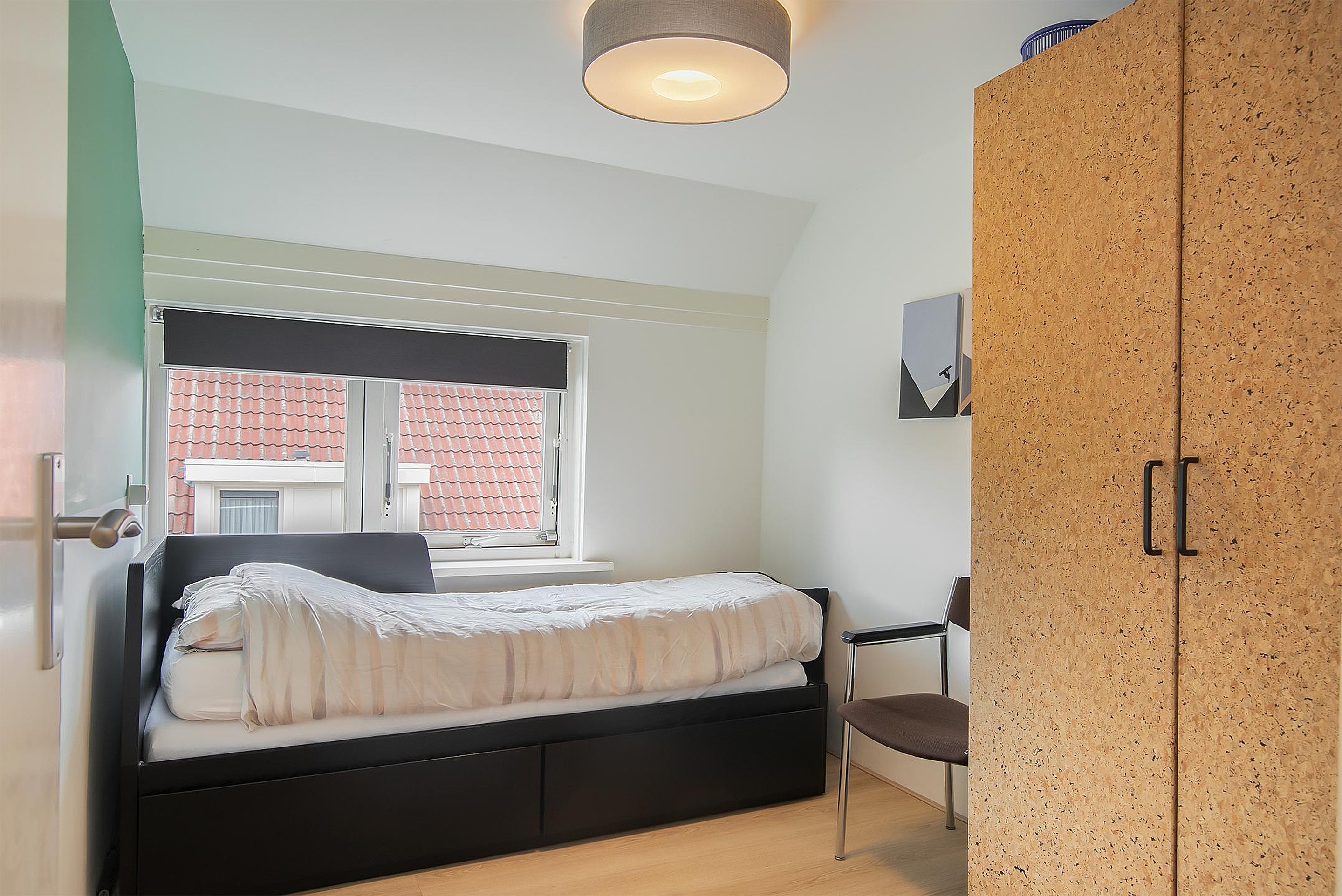 Op de eerste verdieping bevinden zich twee slaapkamers, geschikt als master-bedroom en logeer- of werkkamer. De badkamer is functioneel ingericht met een douche en wastafel.