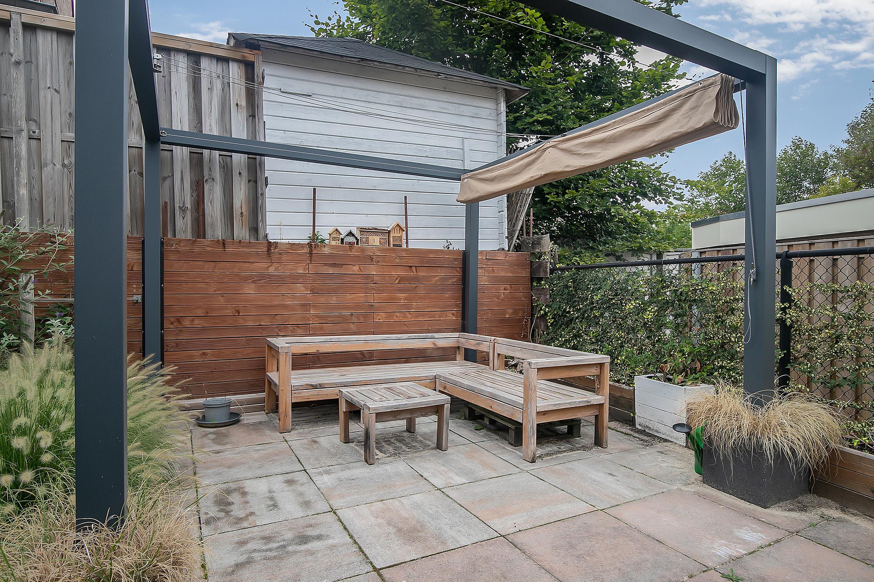Binnenkomst is in de lichte woonkamer, voorzien van airconditioning – ideaal voor warme zomerdagen. De open keuken is praktisch ingericht en biedt direct toegang tot de ruime, fraai aangelegde tuin met handige berging; perfect voor het opbergen van fietsen en tuinspullen of om gewoon lekker van de buitenruimte te genieten.