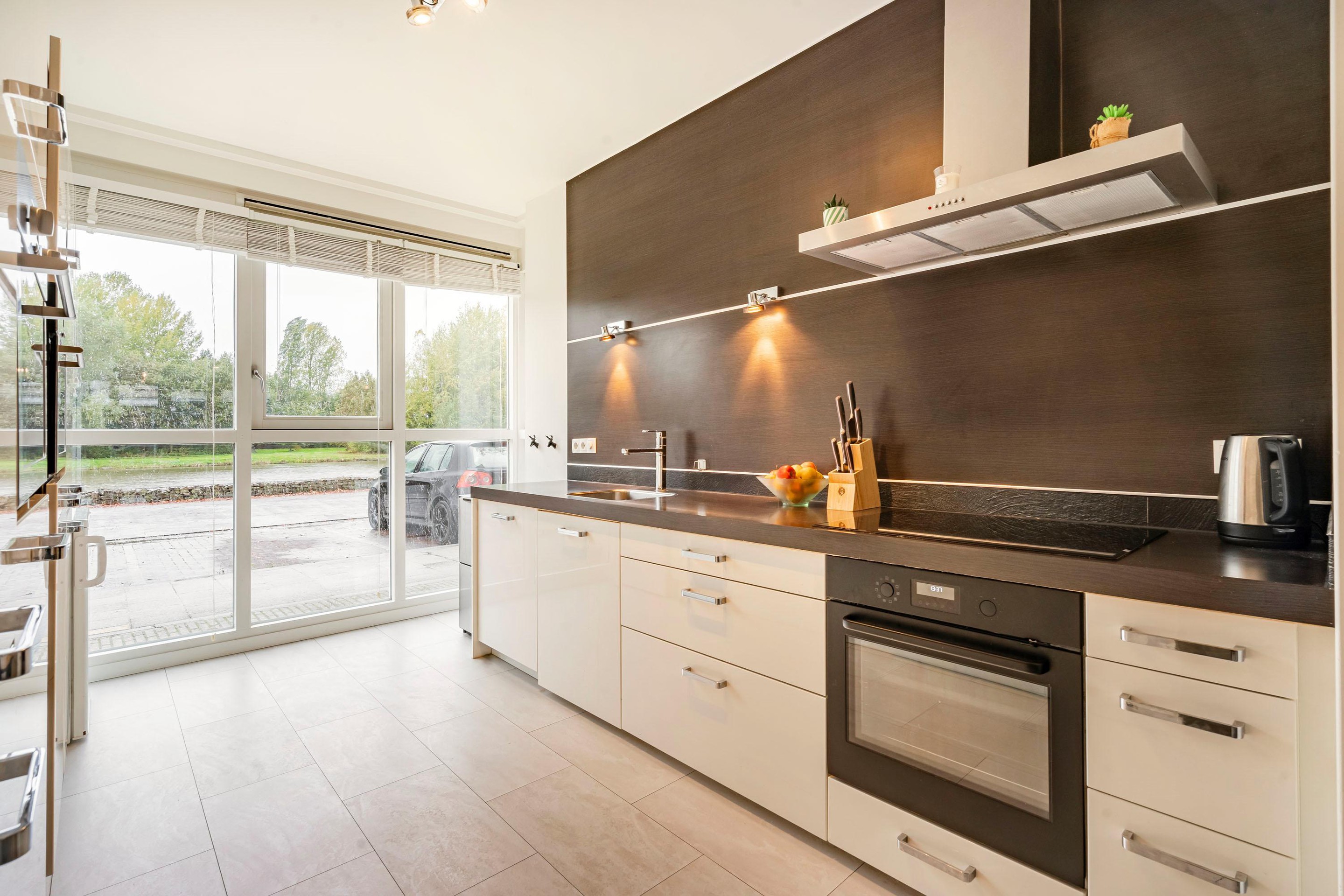 Luxe open keuken aan de voorzijde met o.a. vaatwasser, inductiekookplaat, combi-oven, magnetron, koelkast, vriezer en volop bergruimte