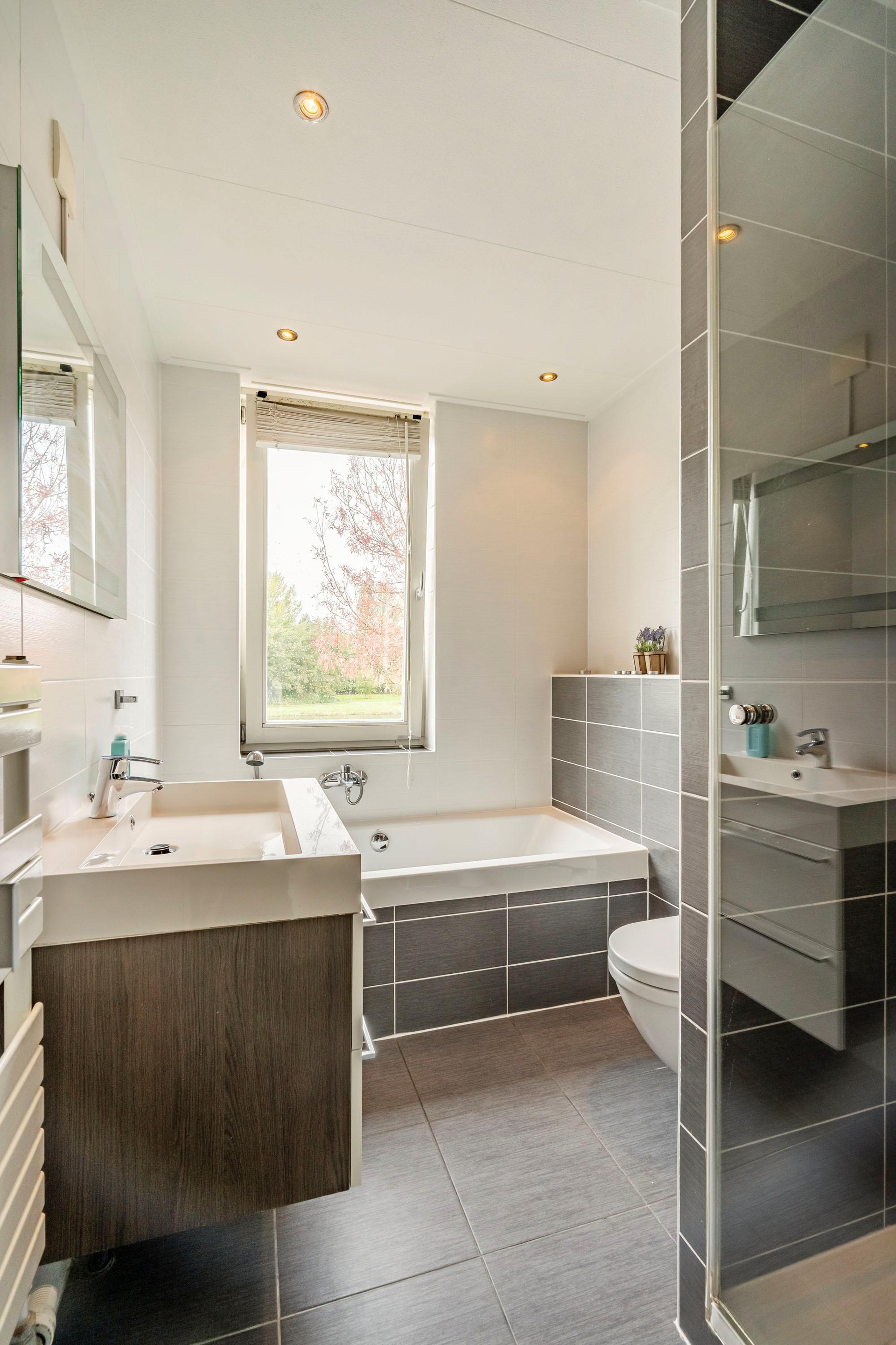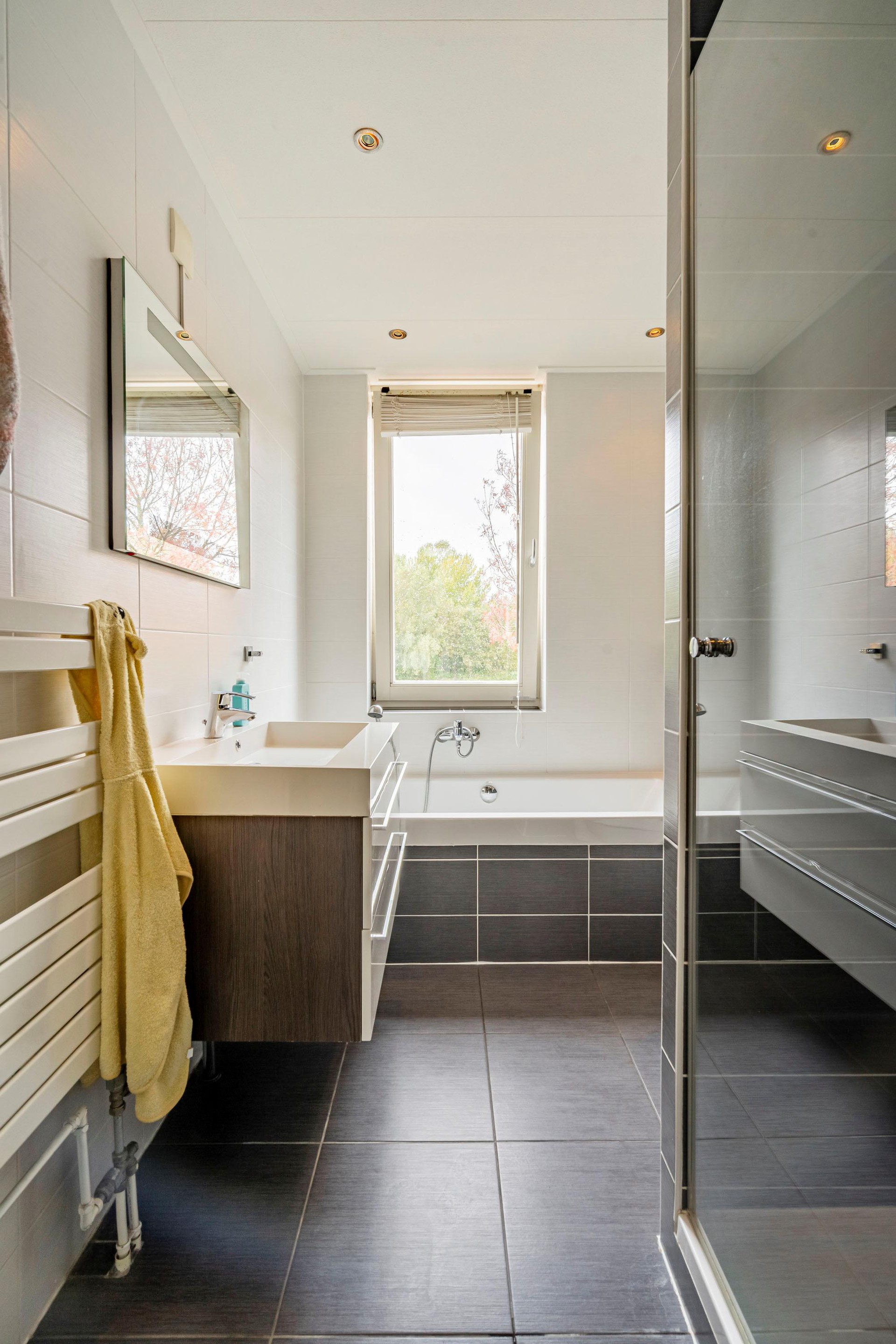 Luxe badkamer met ligbad, douchecabine, tweede toilet en wastafelmeubel.