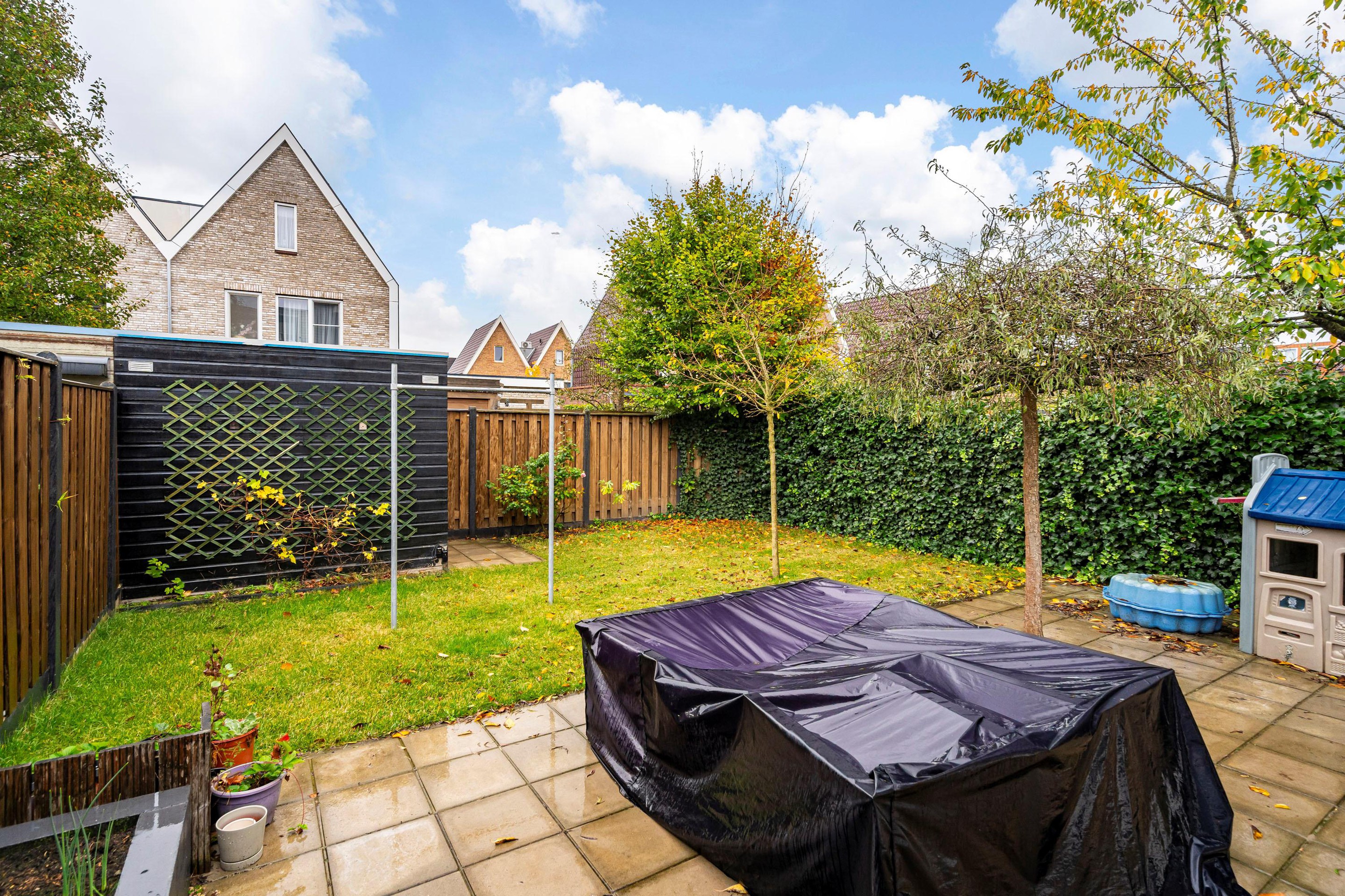 De woning beschikt over een zeer ruime tuin van bijna 150 m2, met een groot terras, vrijstaande houten berging en achterom. De tuin ligt op het noordoosten, maar dankzij de grootte zijn er altijd zonnige én schaduwrijke plekken.