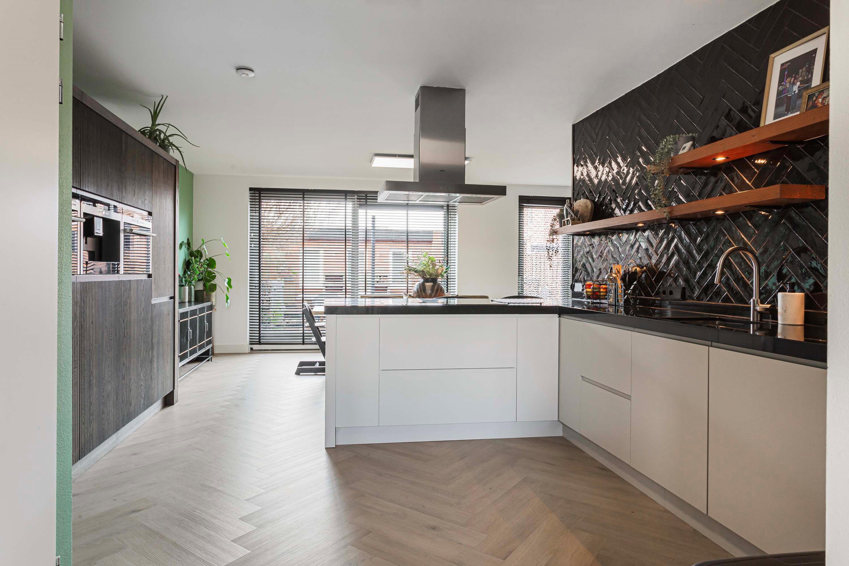 Bij binnenkomst valt direct de royale en stijlvolle leefkeuken op – het kloppend hart van de woning. De keuken is voorzien van hoogwaardige inbouwapparatuur, waaronder een stoomoven, combi-oven, koffiemachine, koel-/vriescombinatie, inductiekookplaat en een modern afzuigsysteem. Een heerlijke plek om te koken, dineren en samen te komen.