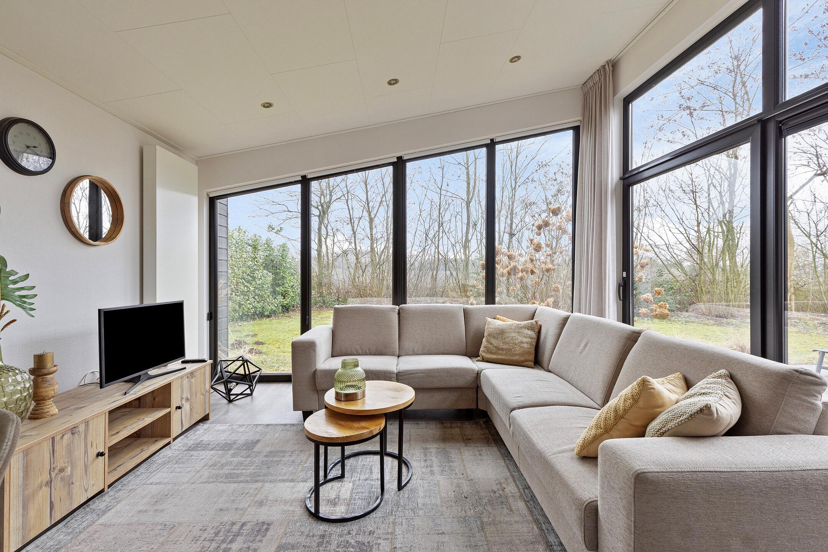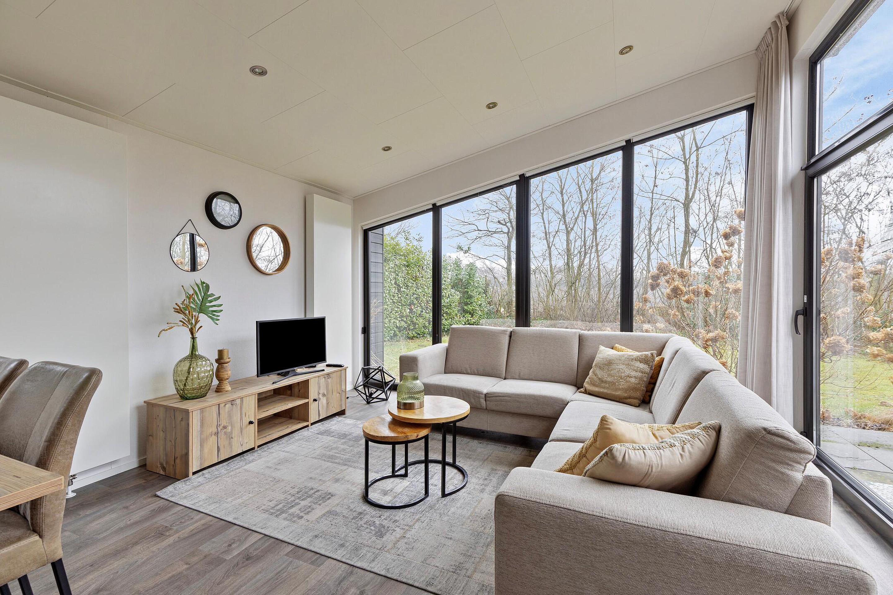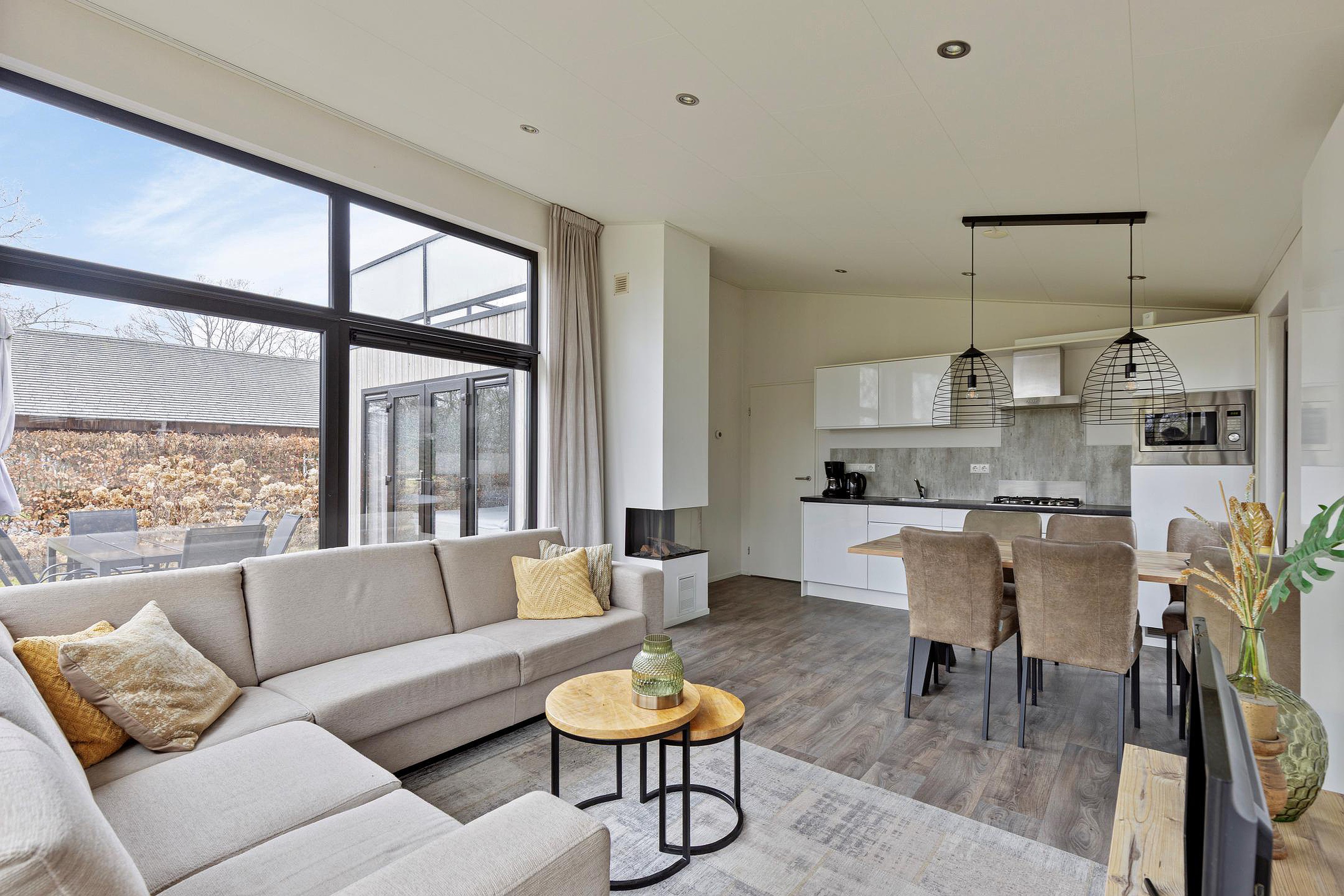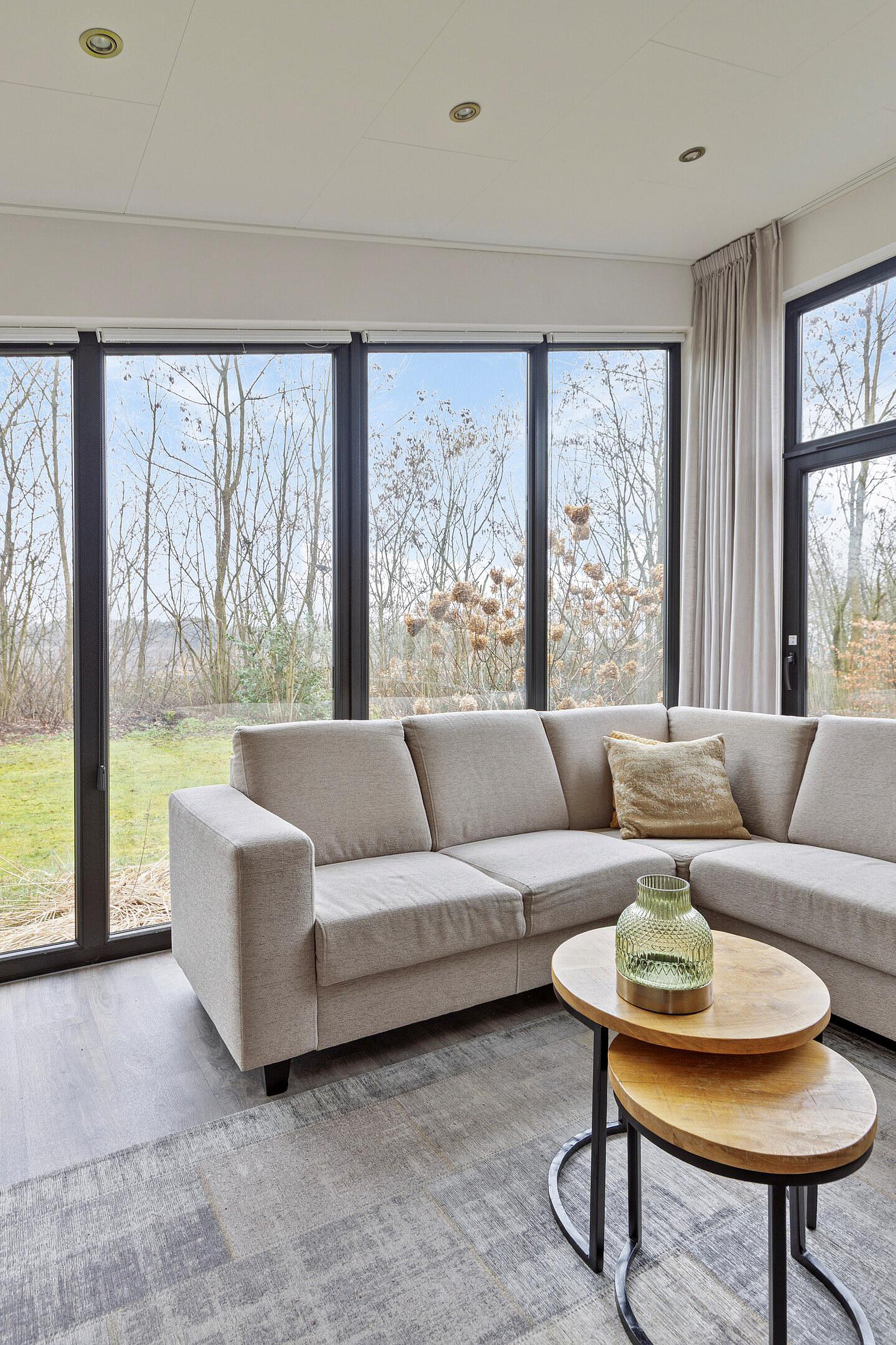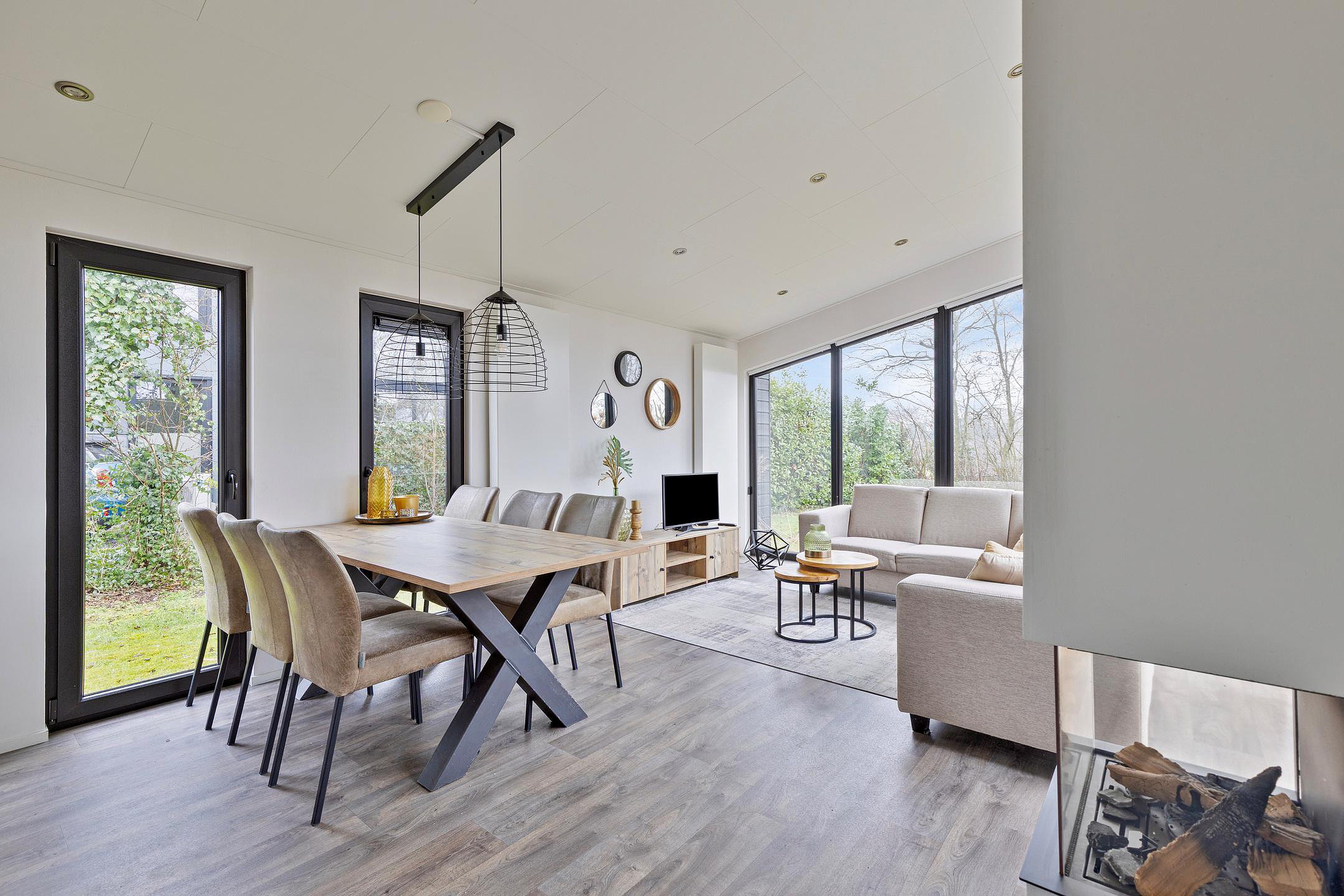 De lichte woonkamer met grote raampartijen geeft een prachtig uitzicht op de tuin en zorgt voor een natuurlijke verbinding met buiten. De open keuken is strak vormgegeven en voorzien van moderne inbouwapparatuur. De eethoek vormt een sfeervolle plek voor lange avonden tafelen.