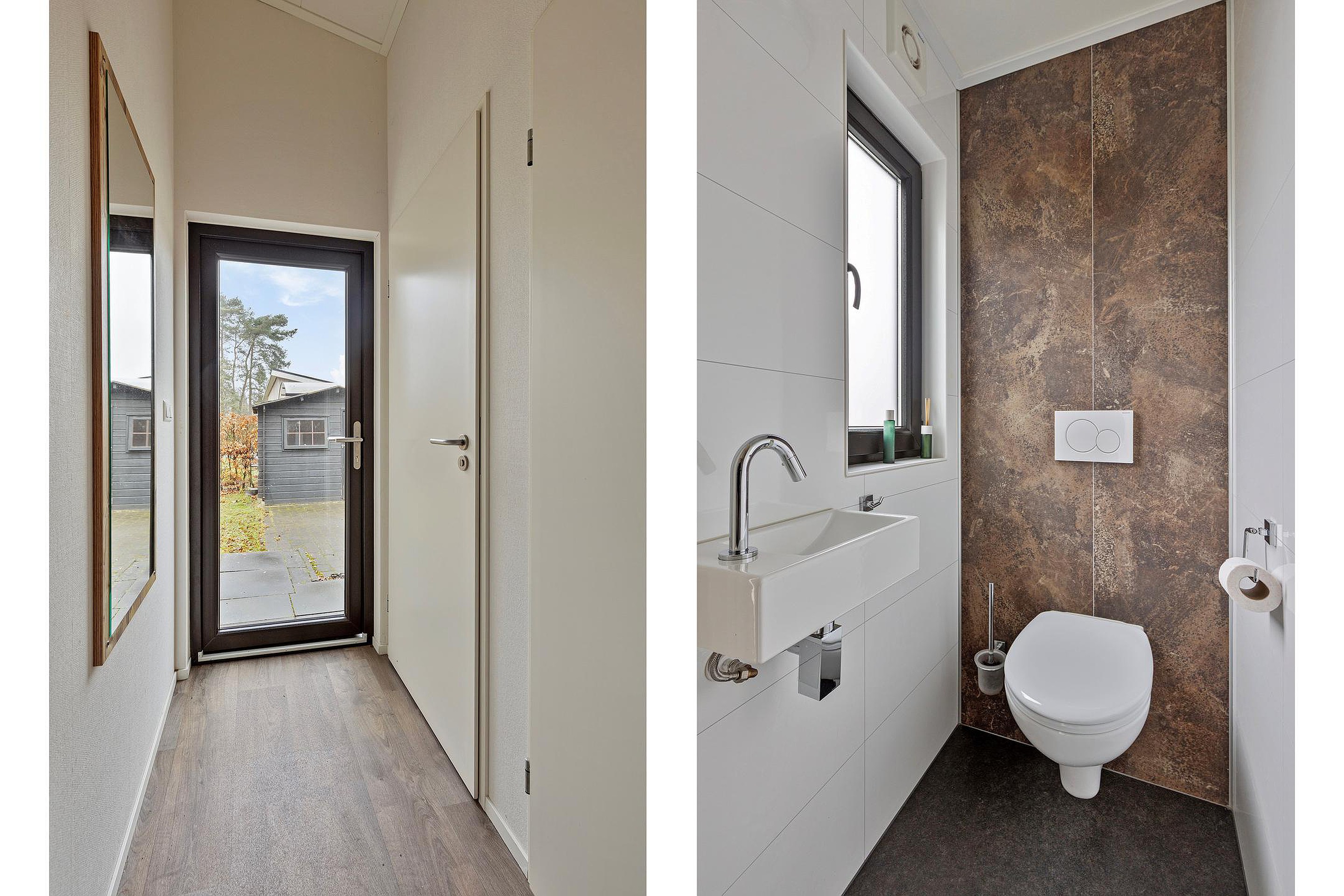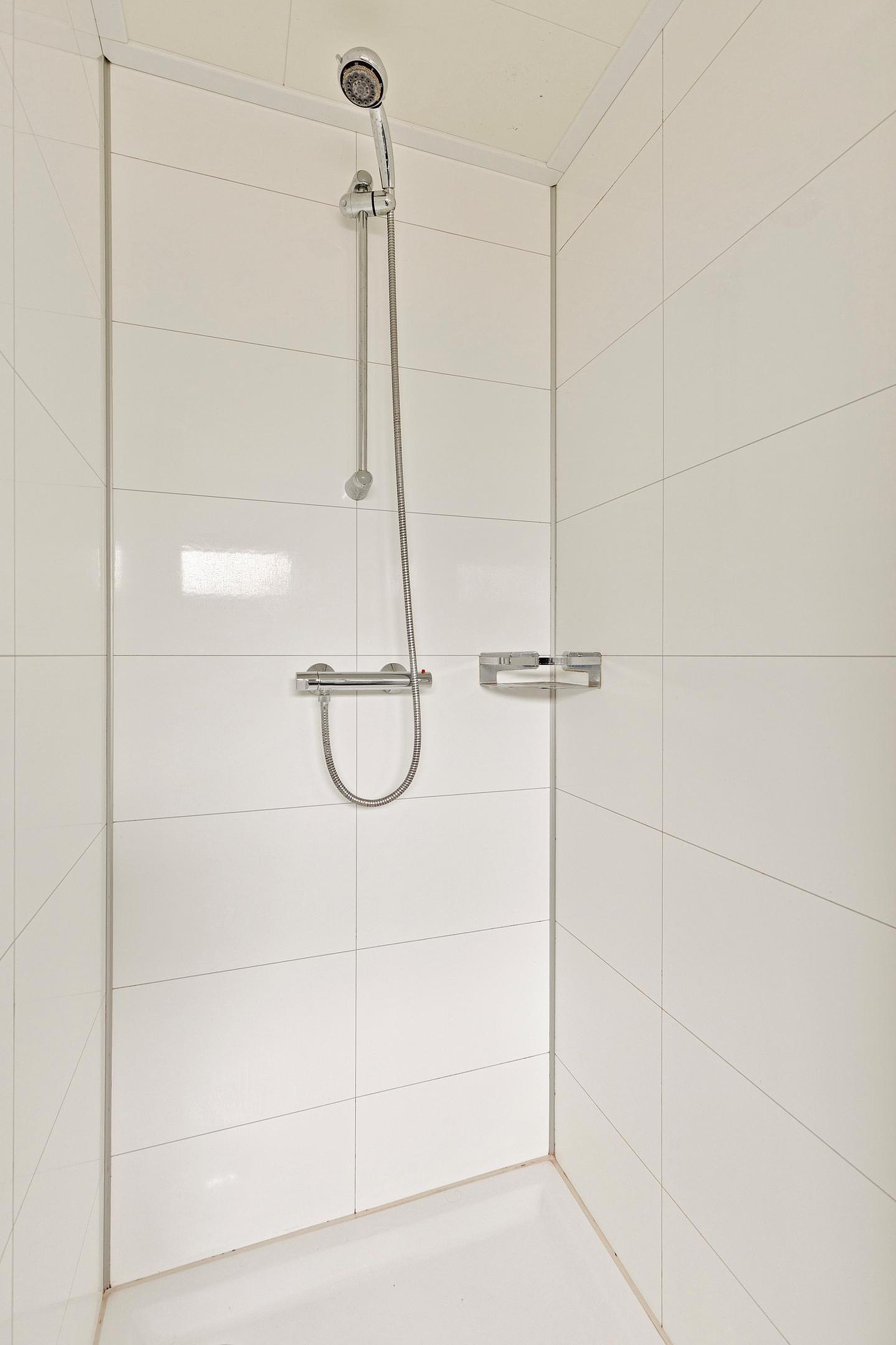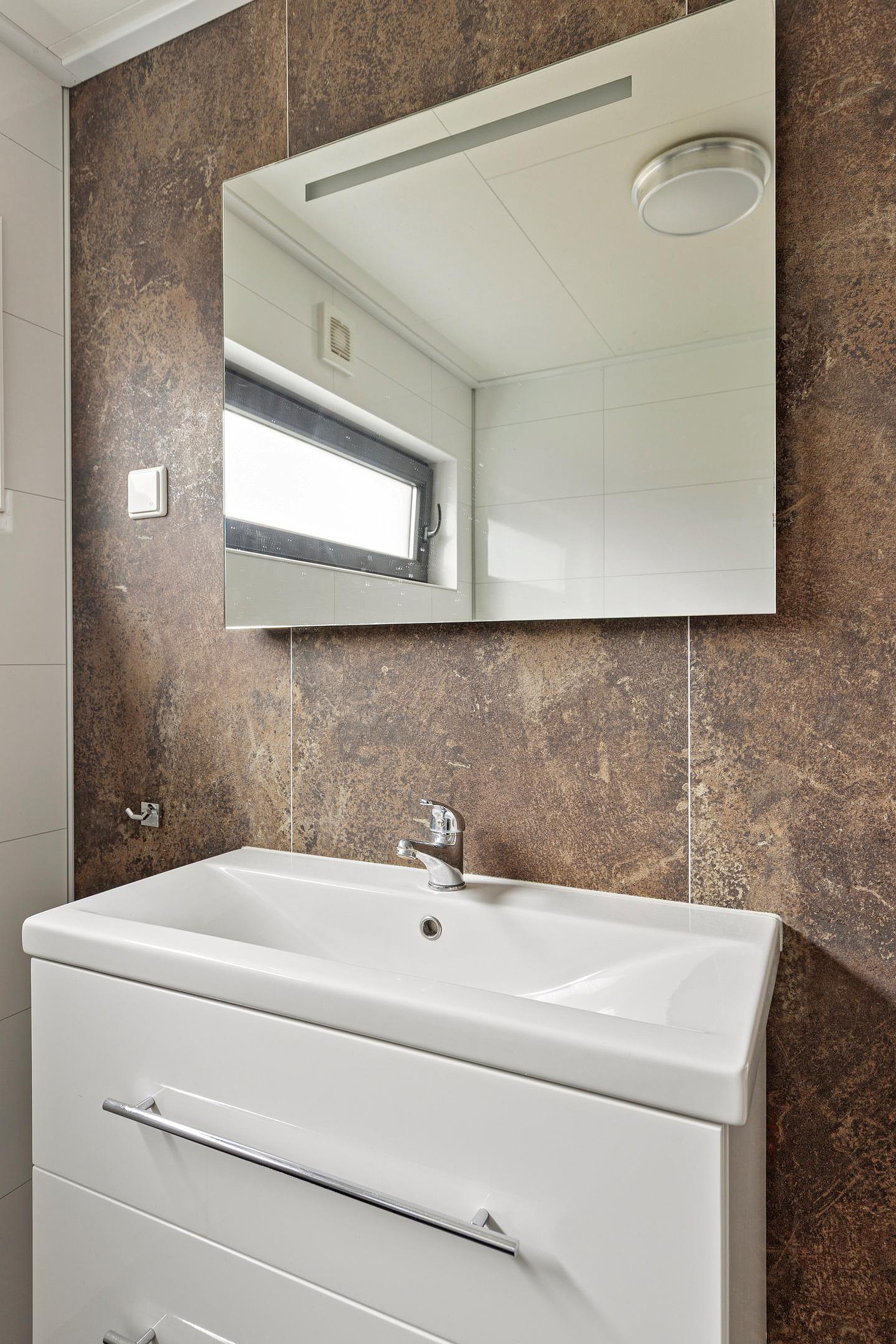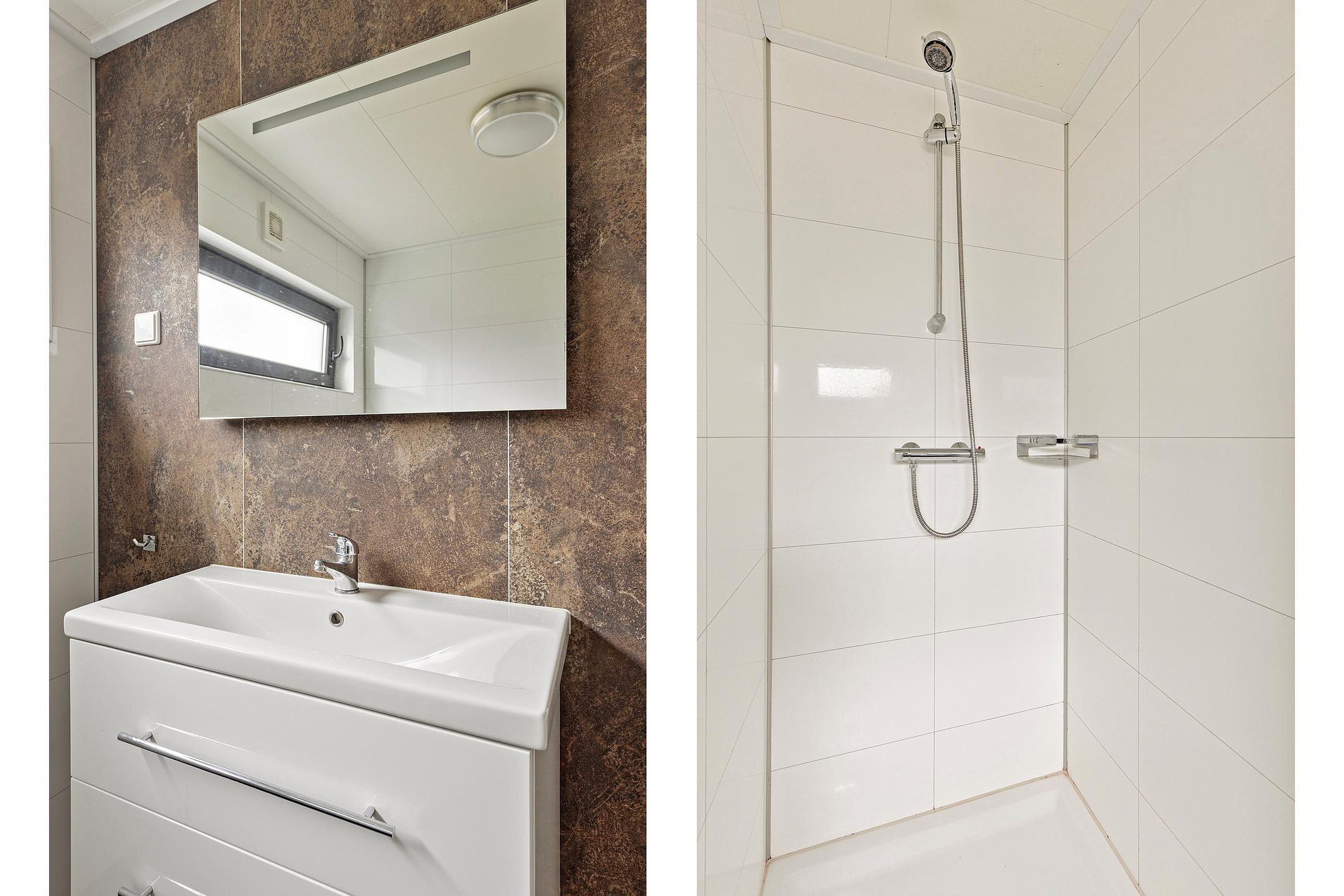 De moderne badkamer is uitgevoerd in tijdloze materialen en voorzien van een ruime douche, wastafelmeubel en toilet. Alles straalt rust en comfort uit.