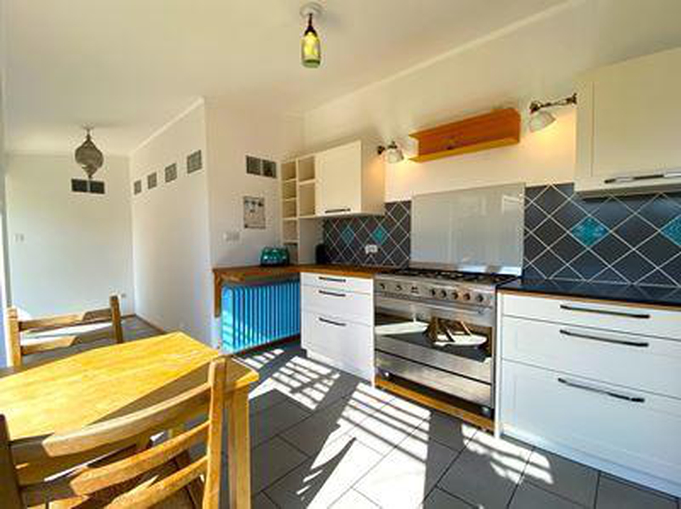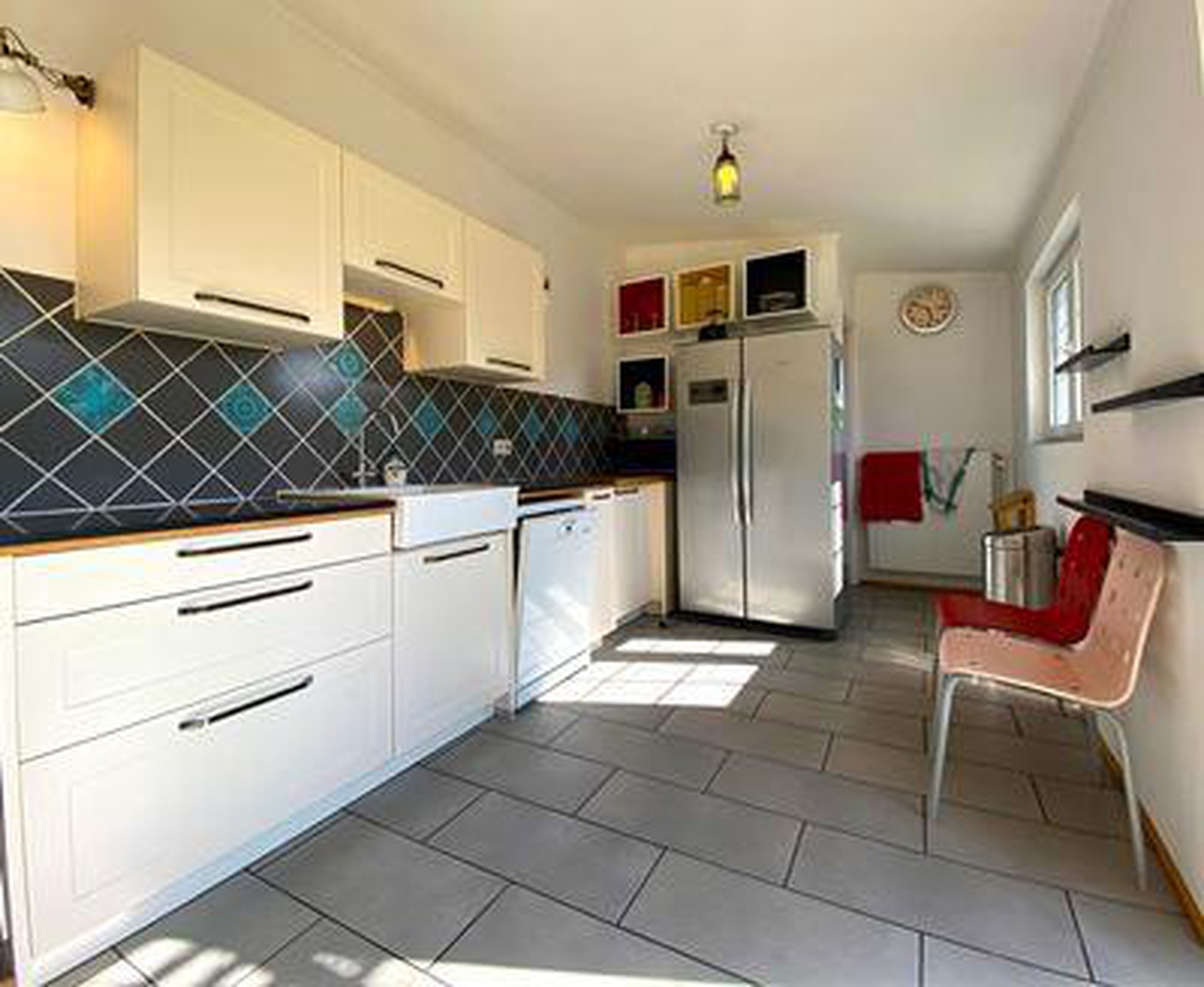 De landelijke keuken is gelegen in de uitbouw en bereikbaar via een aparte, recent vernieuwde gang. In deze gang bevindt zich tevens een praktische berging, die ook direct toegankelijk is vanaf de oprit. De keuken is compleet uitgerust met alle benodigde inbouwapparatuur. Aan de achterzijde zijn aansluitingen voor de wasmachine en droger aanwezig. Vanuit de keuken heeft u toegang tot de zonnige tuin, waar u het grootste deel van de dag kunt genieten van de zon.