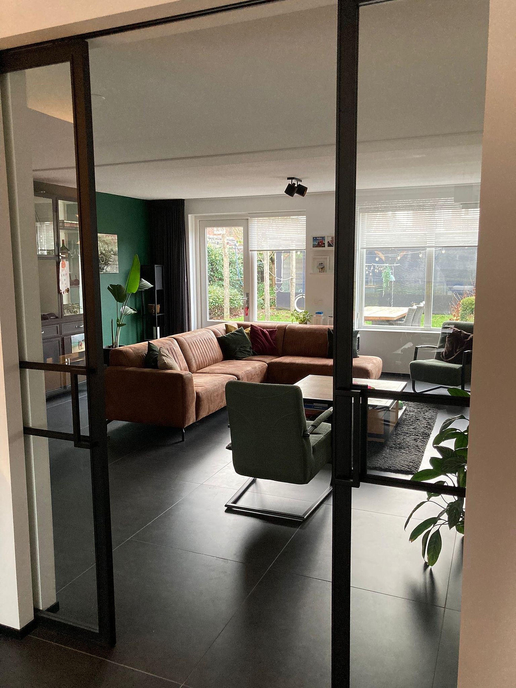 De tuingerichte woonkamer (ca. 6×6 m) heeft grote raampartijen en openslaande deuren naar de zonnige achtertuin. De 90×90 cm keramische tegels en vloerverwarming over de gehele begane grond zorgen voor comfort én een luxe uitstraling.