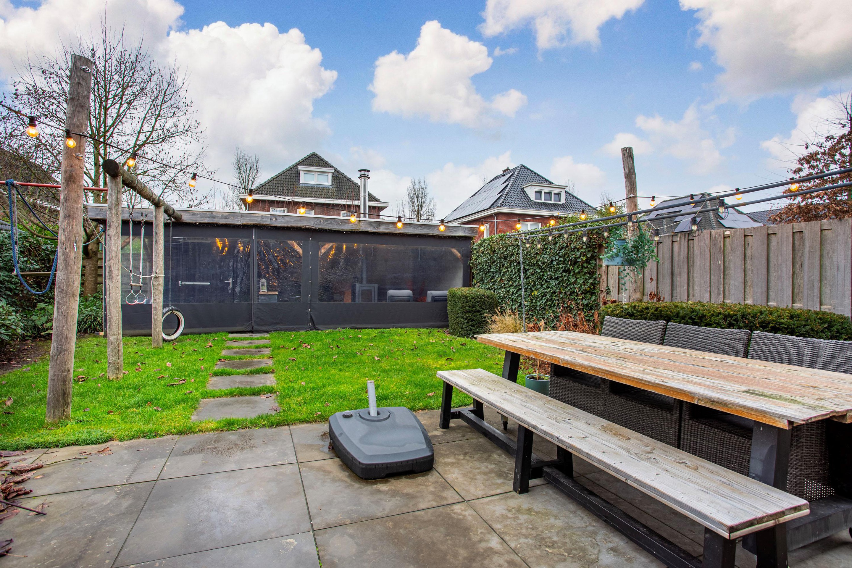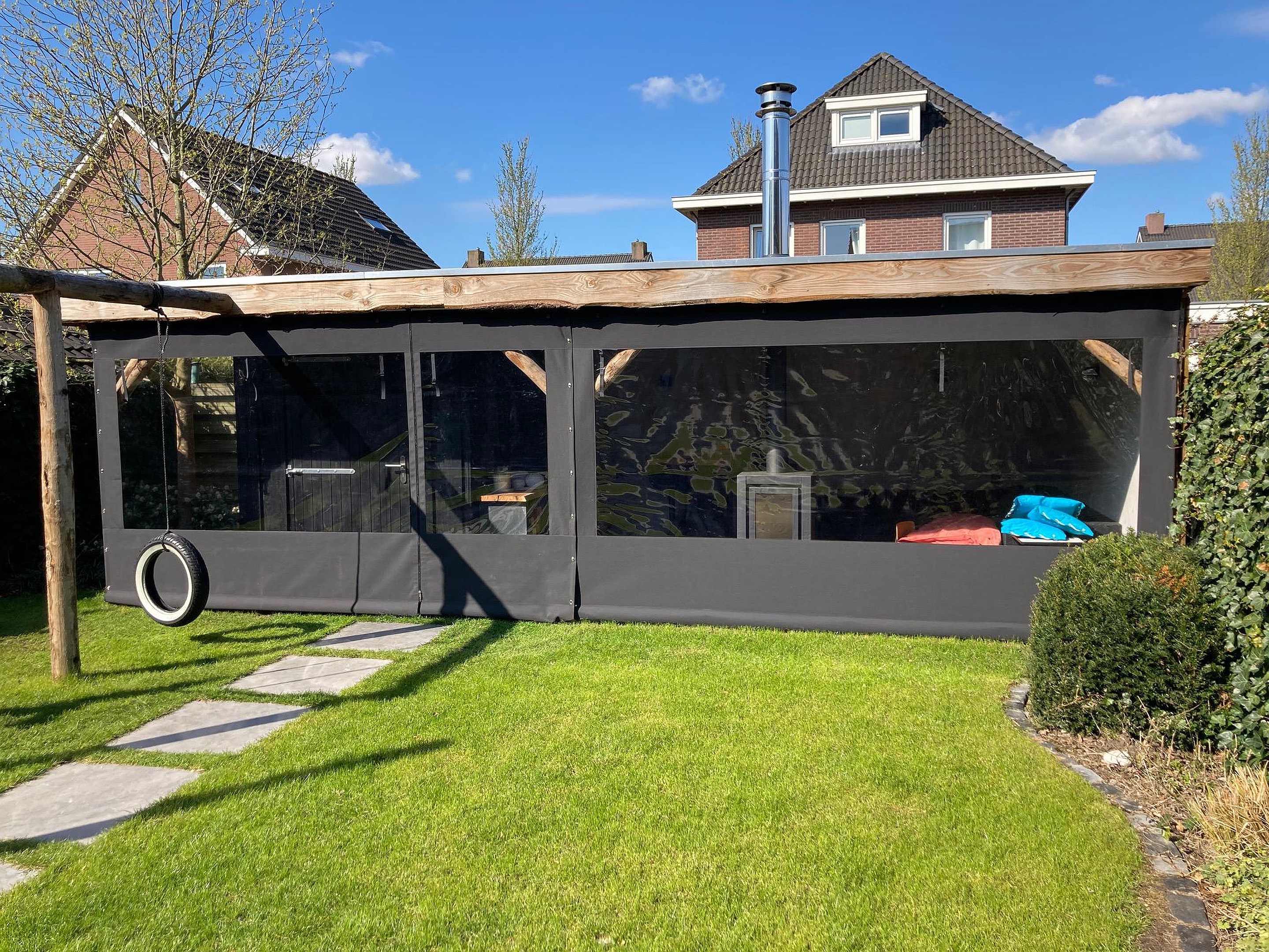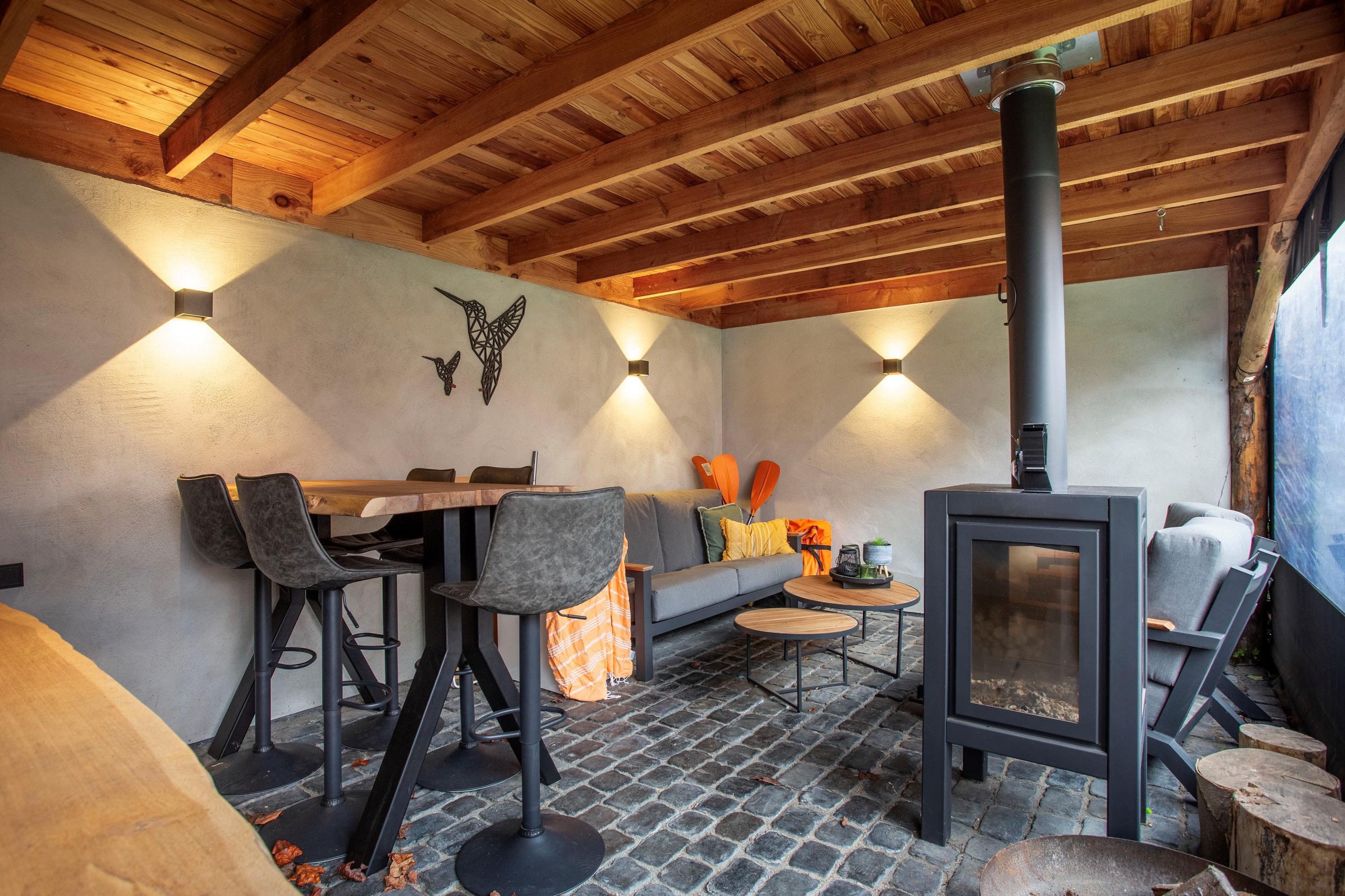 De fraai aangelegde achtertuin is een heerlijke plek om te genieten. Met een groot terras, een modern overdekt zitgedeelte met open haard, transparant oprolscherm en veel privacy is het hier het hele jaar door goed toeven.