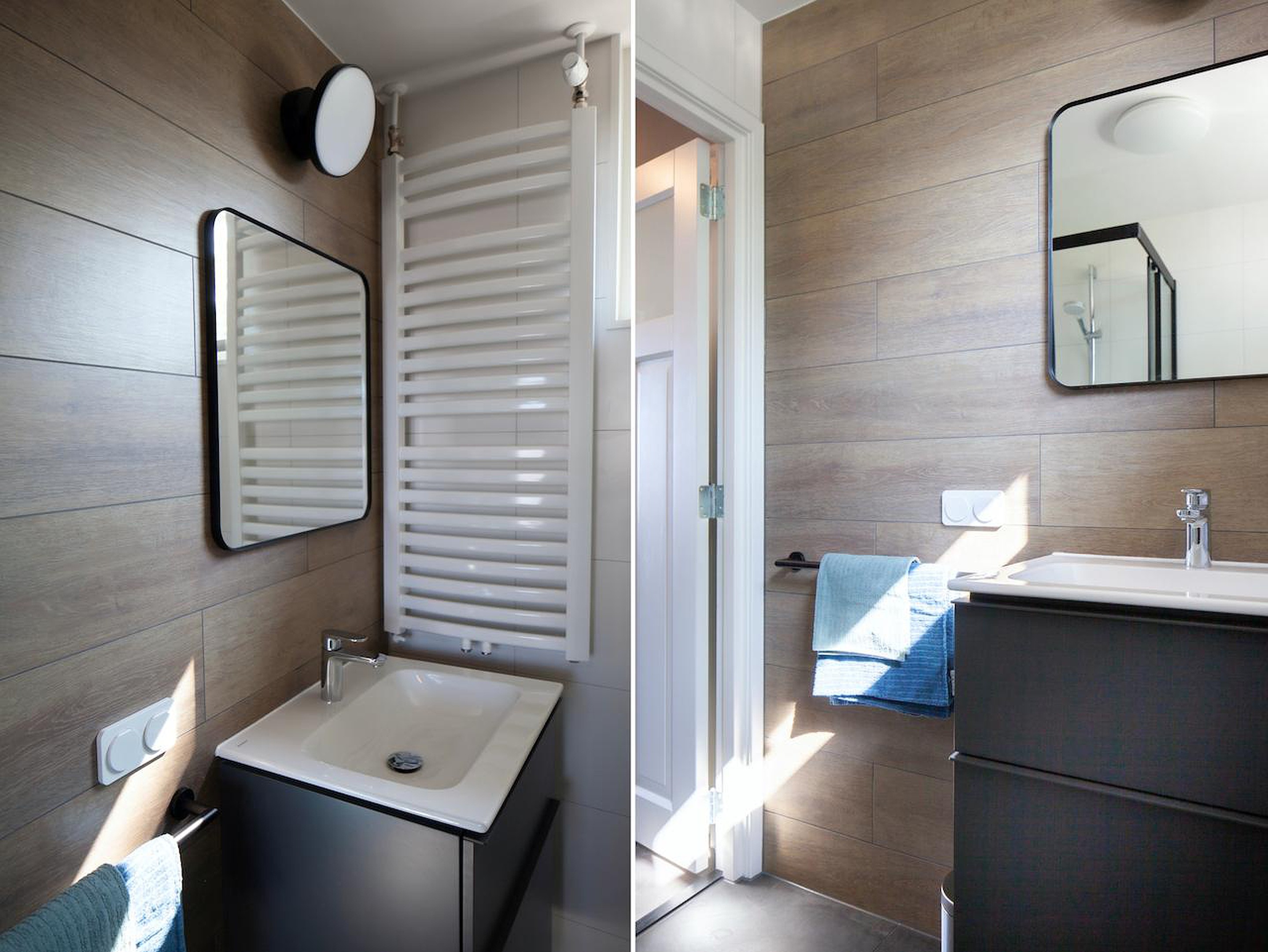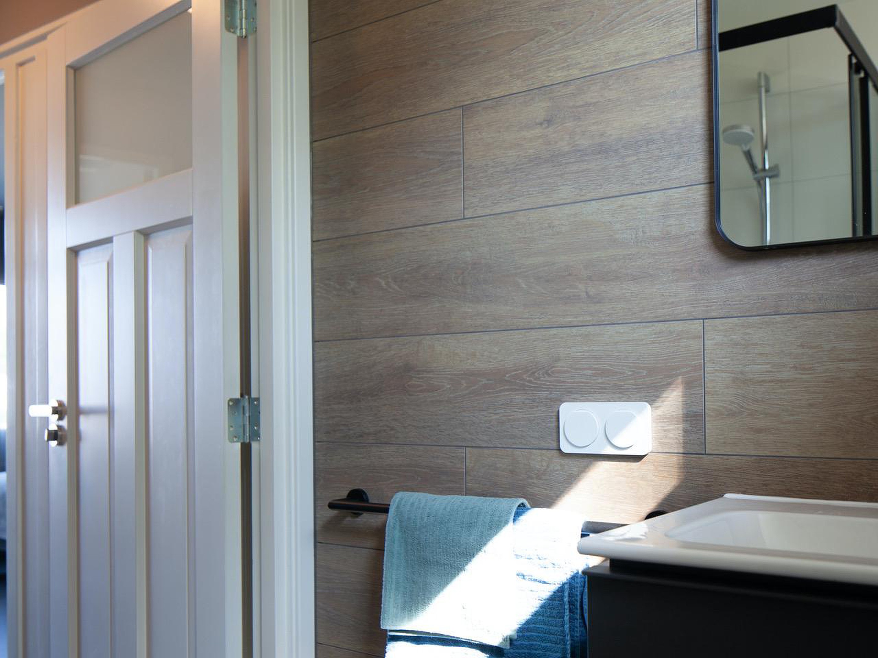 On the first floor, you will find two generously sized bedrooms and a smaller room, currently used as a walk-in closet but also perfectly suitable as a home office or study. The two larger bedrooms are furnished with double beds and wardrobes. This floor also features the bathroom with a washbasin, toilet, and walk-in shower.