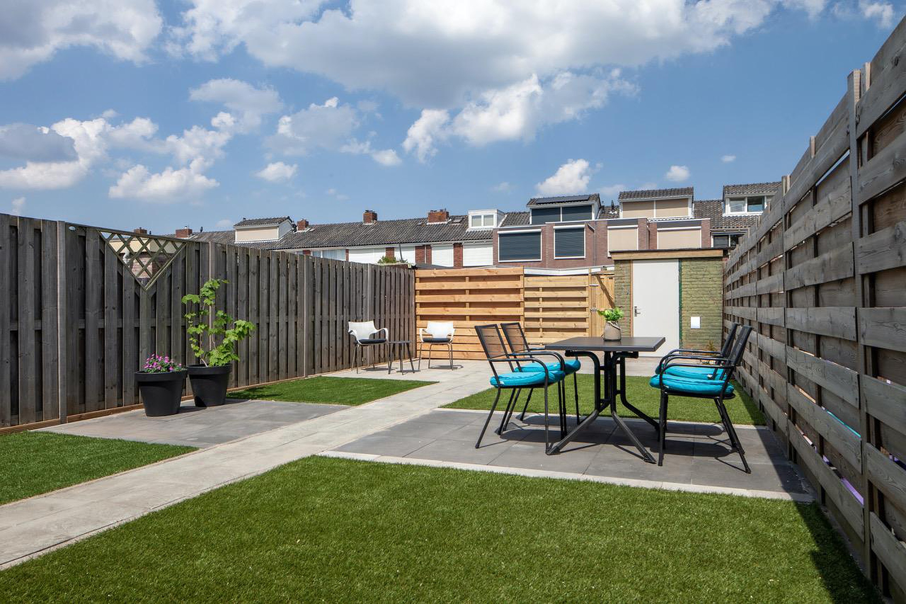Via de entreehal met separaat toilet op de begane grond, bereiken we de woonkamer, keuken en tuin. De woonkamer is voorzien van zowel zithoek als eethoek en de keuken is voorzien van goede inbouwapparatuur. Via zowel de eethoek als keuken is de ruime tuin toegankelijk, deze is in moderne stijl aangelegd en voorzien van stenen berging en 'achterom'.
