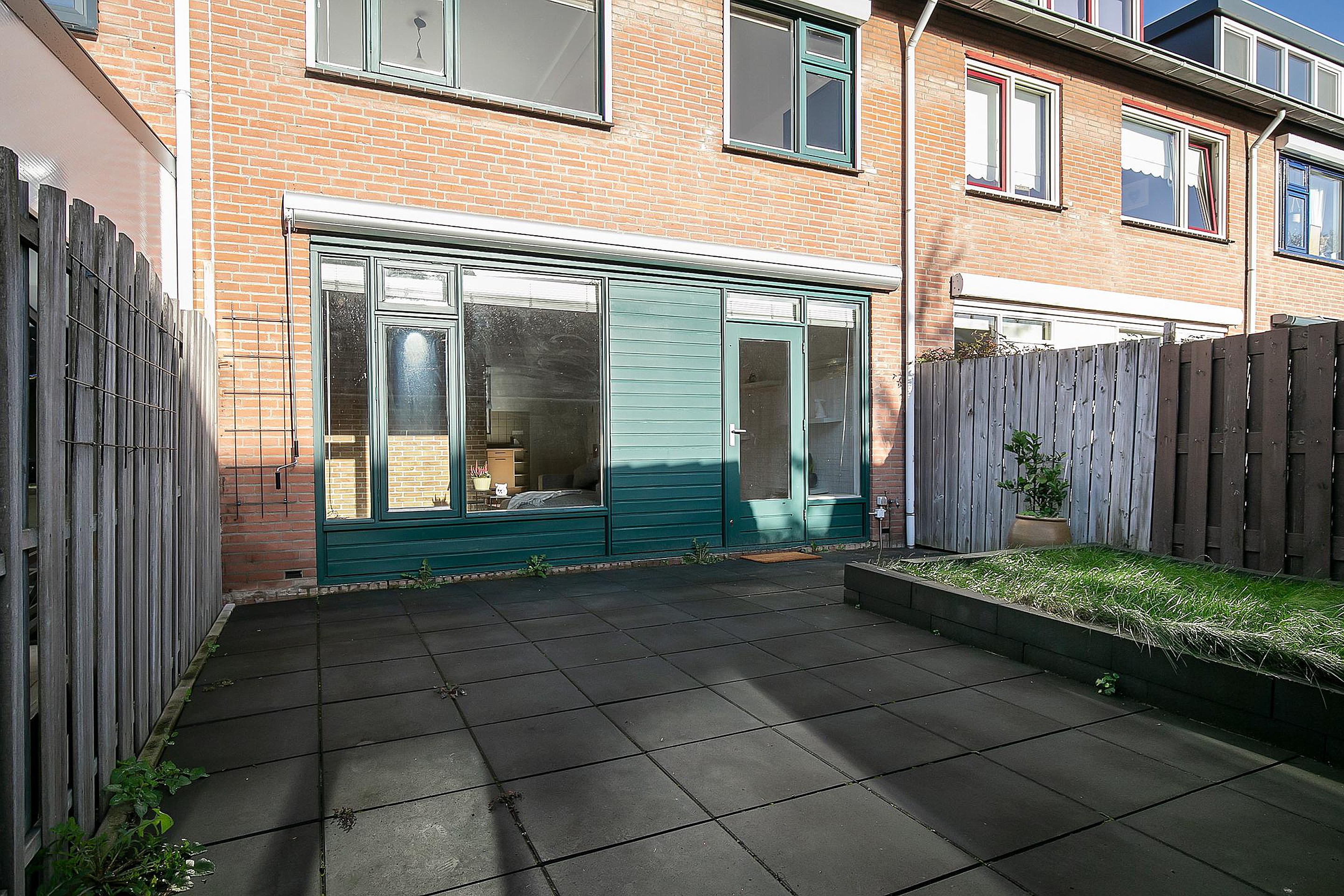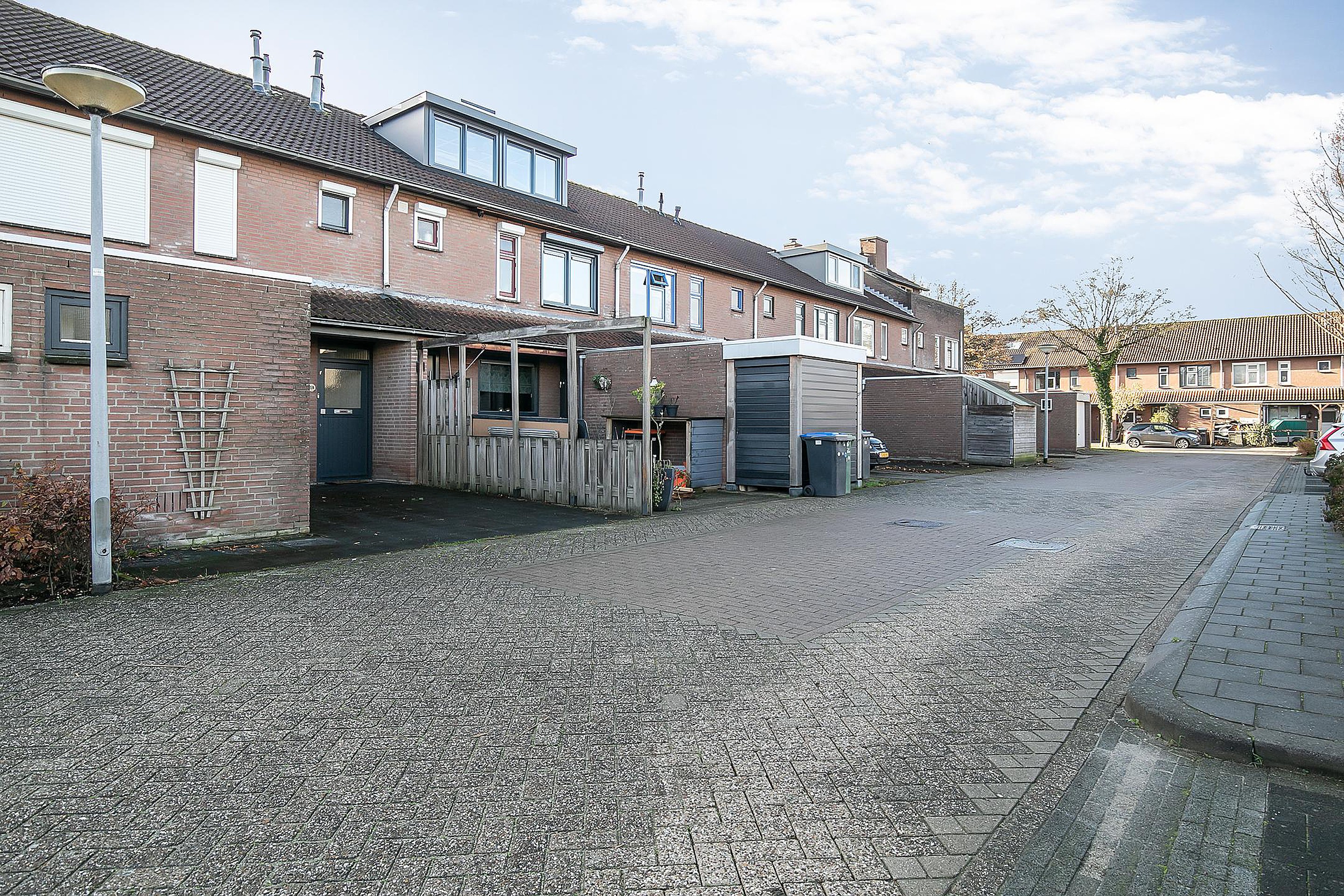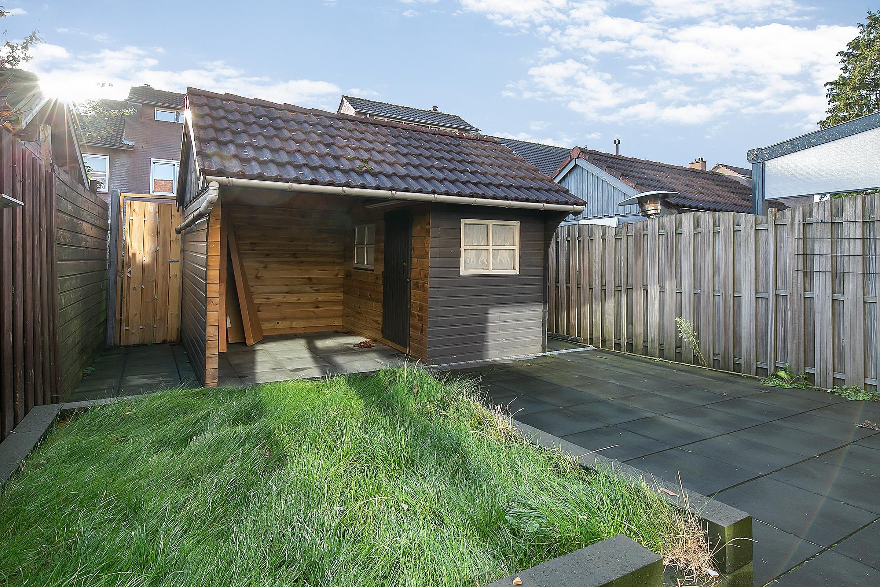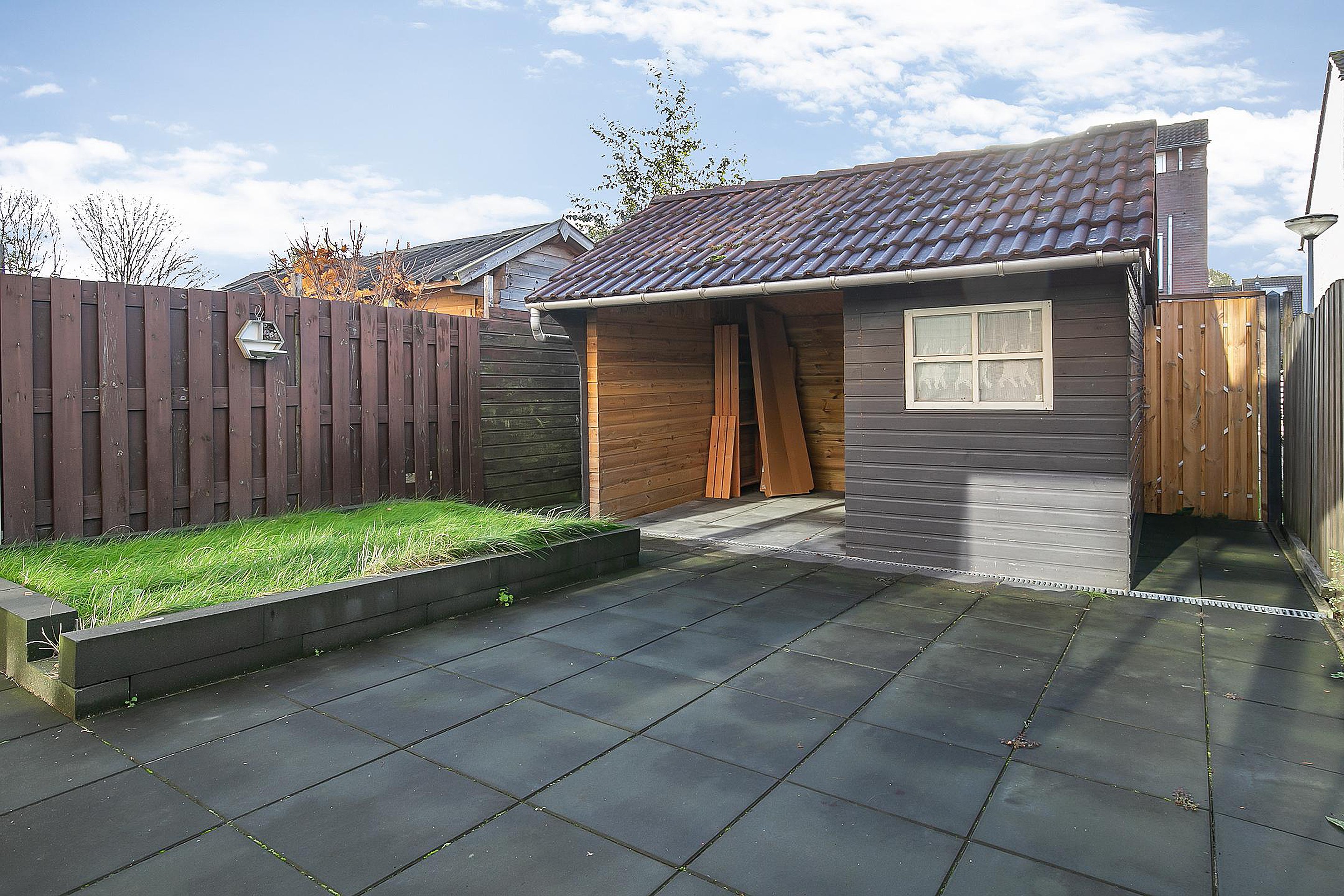 Tuin De goed onderhouden zuid-gerichte tuin biedt volop zon en privacy. De tuin beschikt over een houten schuur met luifel, bestrating, borders, zonnescherm, buitenkraan, omheining en een achterom. Privéparkeergelegenheid is aanwezig op eigen terrein.