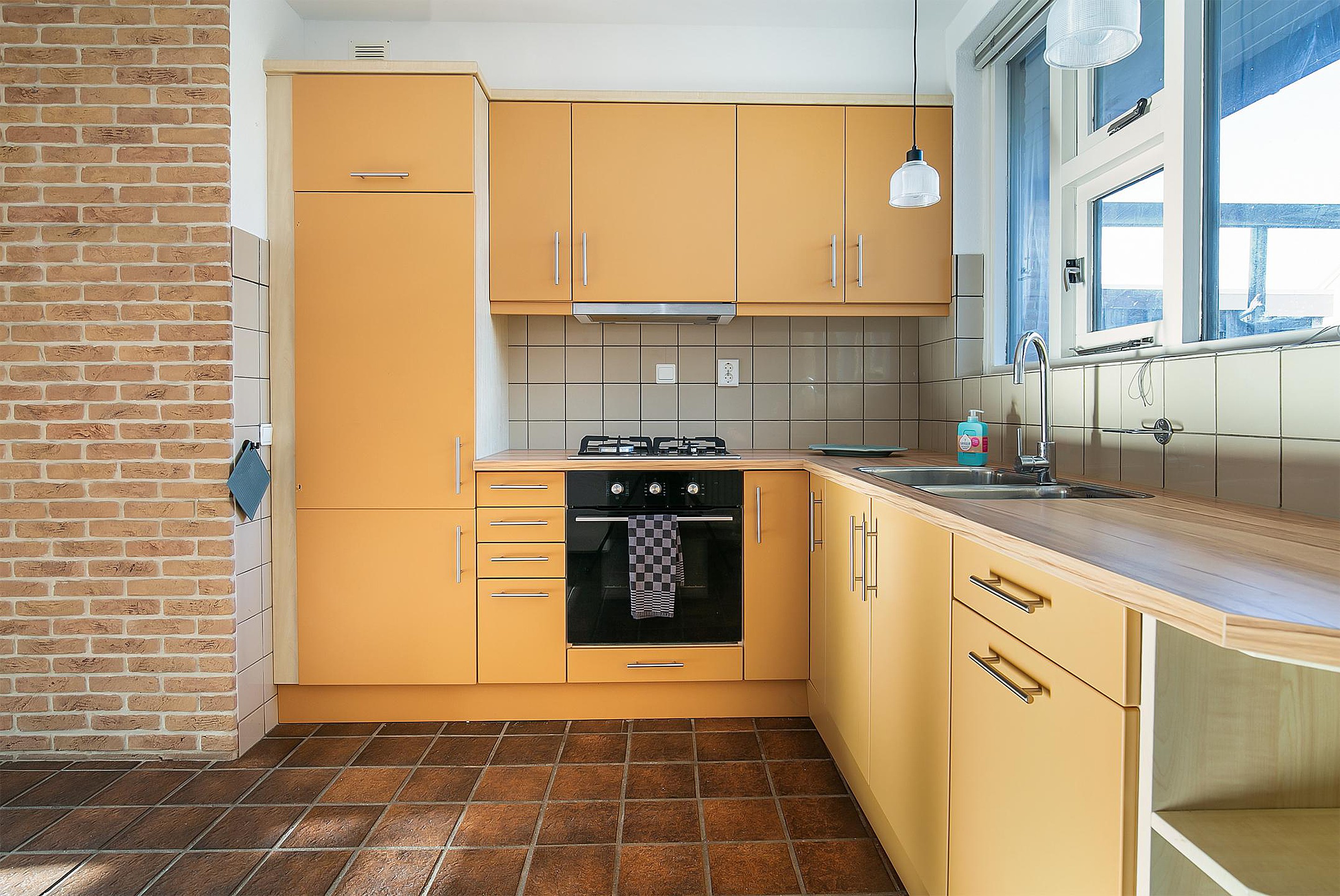 Aan de voorzijde bevindt zich de recent gerenoveerde L-vormige keuken, uitgerust met een vrijstaande koelkast, oven, 4-pits gaskookplaat en afzuigkap. Aangrenzend ligt de bijkeuken/wasruimte met vaatwasser en een deur naar de voortuin. De gehele begane grond is voorzien van een tegelvloer.