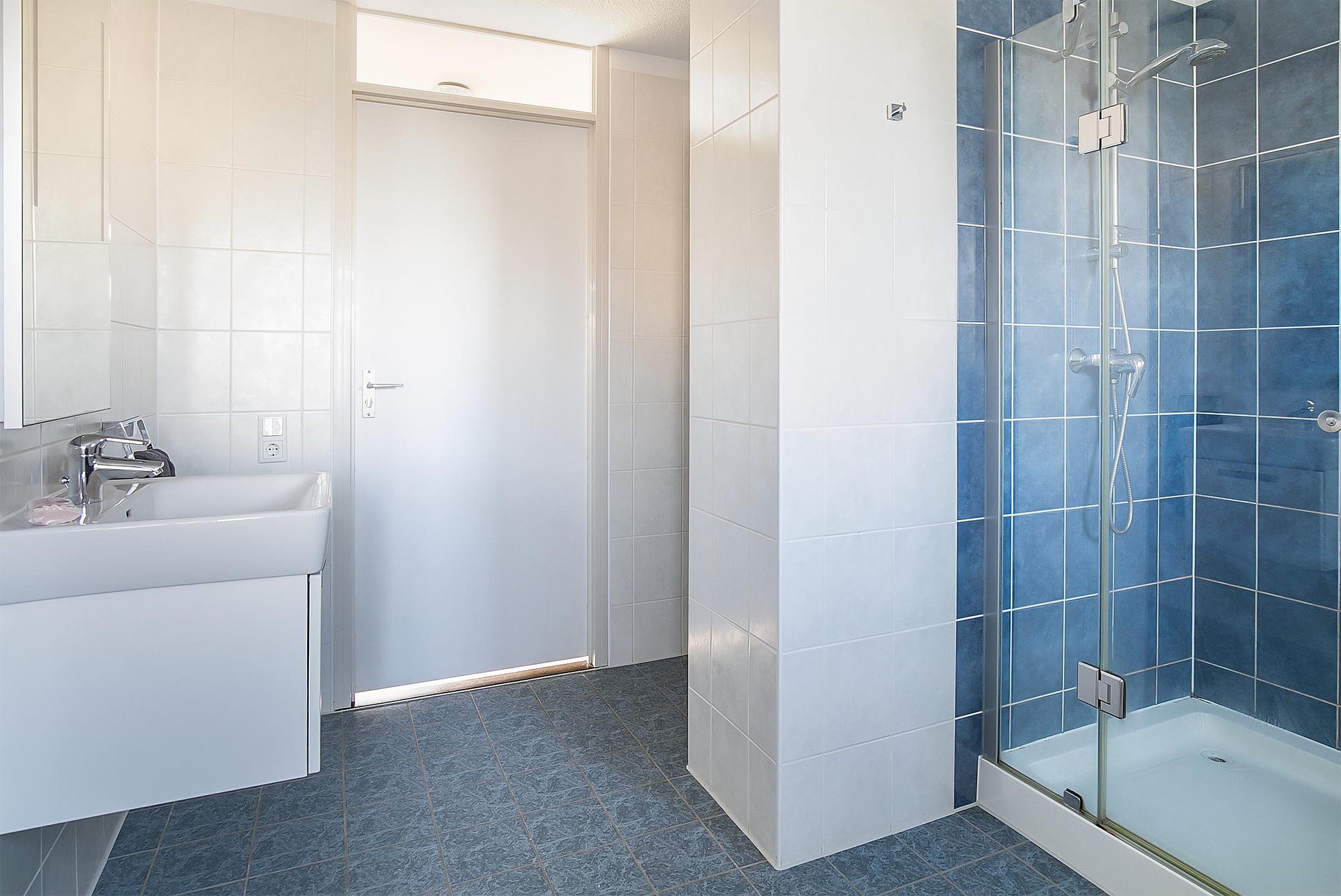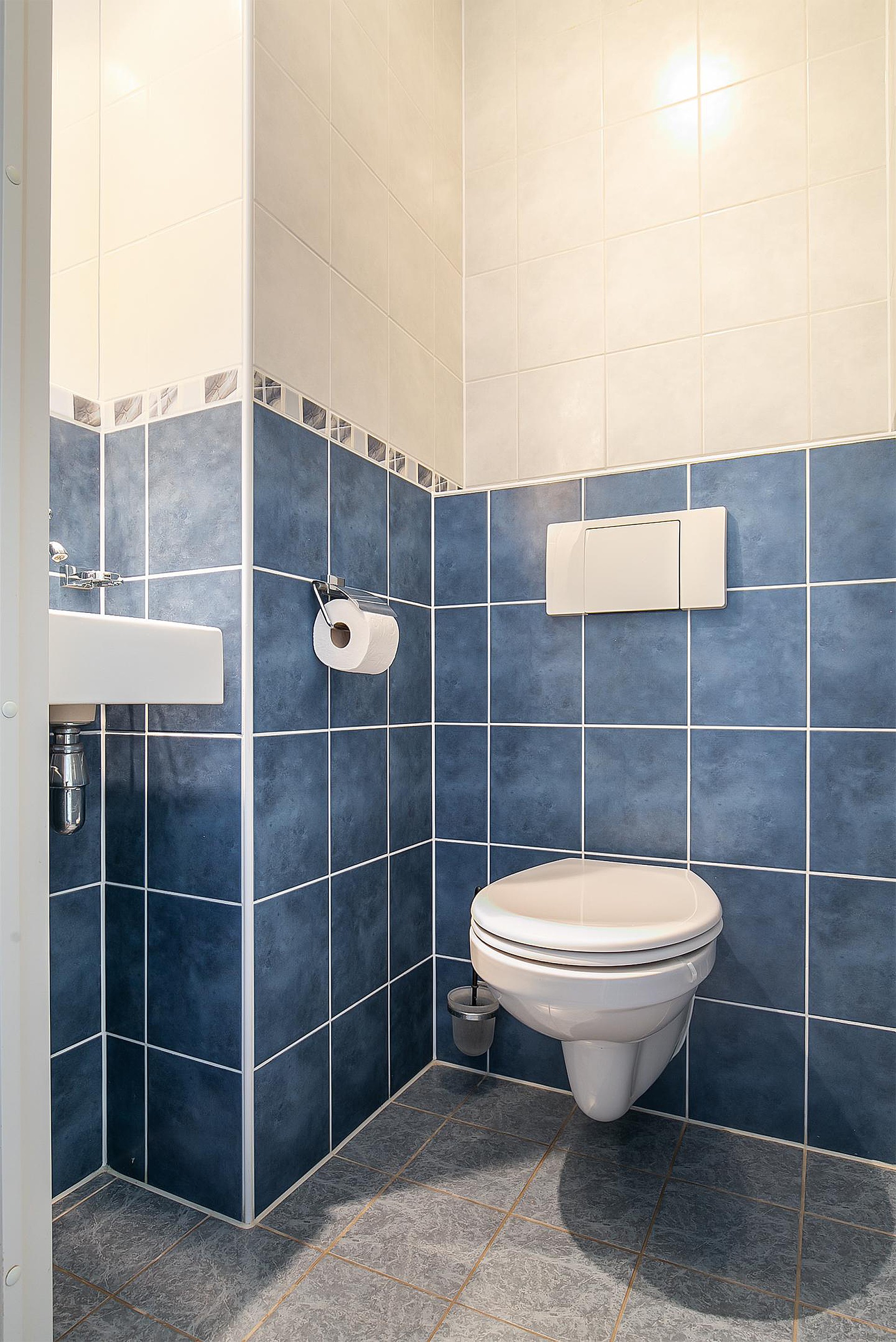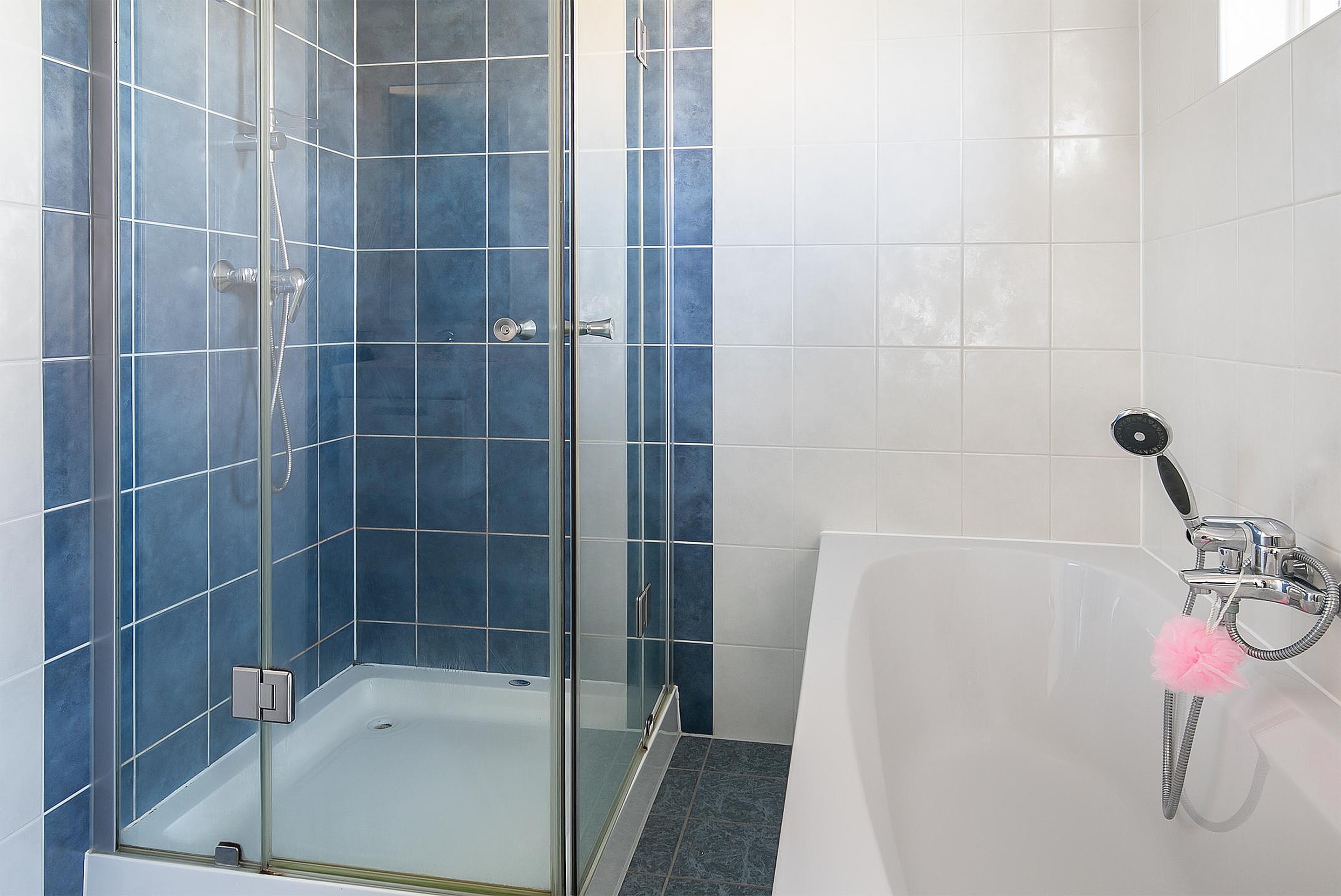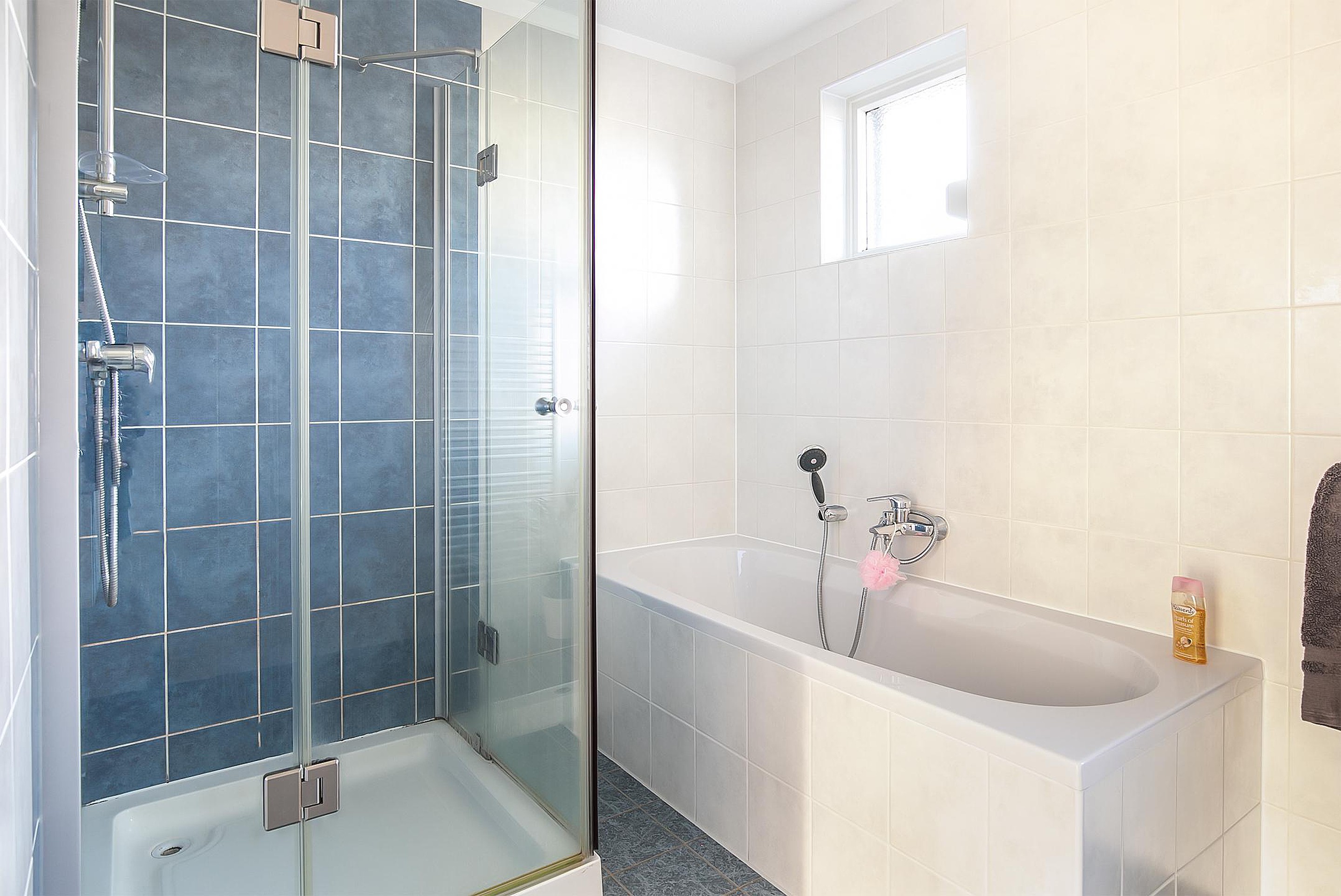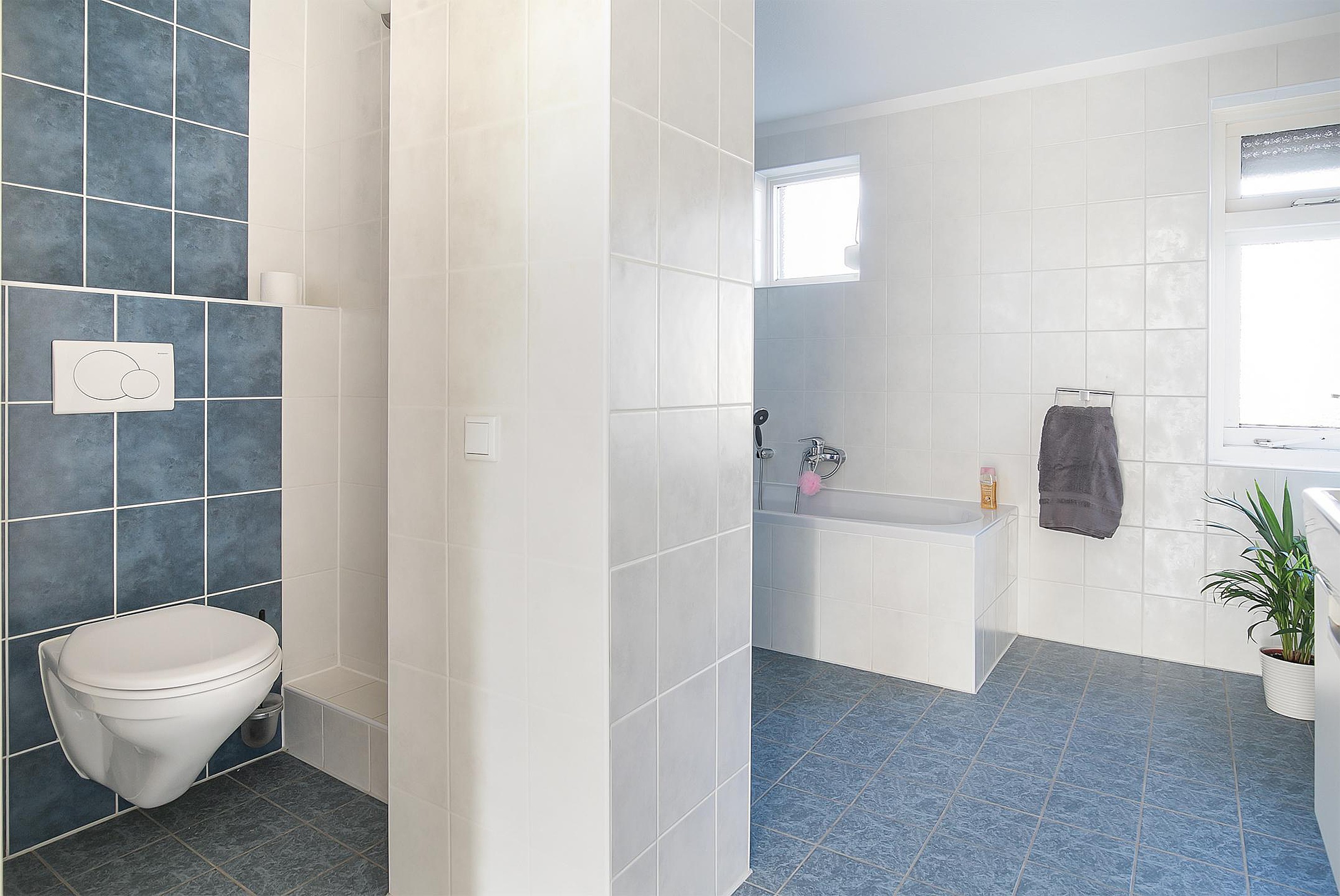 De nette badkamer is compleet ingericht met een douche, ligbad, tweede toilet, wastafelmeubel, designradiator en een raam voor natuurlijke ventilatie. De verdieping is afgewerkt met laminaat.