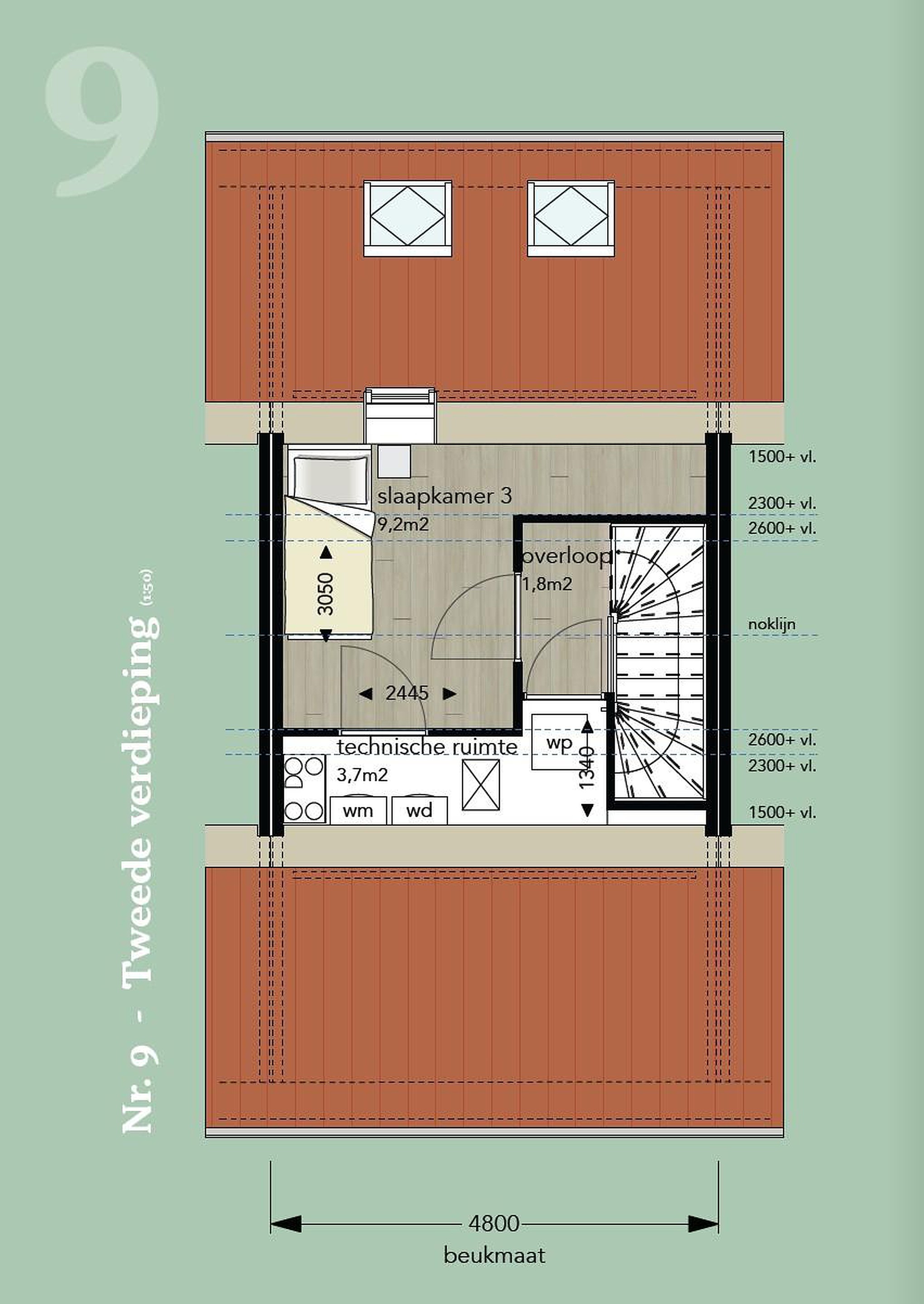 Tweede verdieping zolderverdieping met de technische ruimte en aansluitingen voor witgoed, mogelijkheid tot het maken van een 4de slaapkamer.