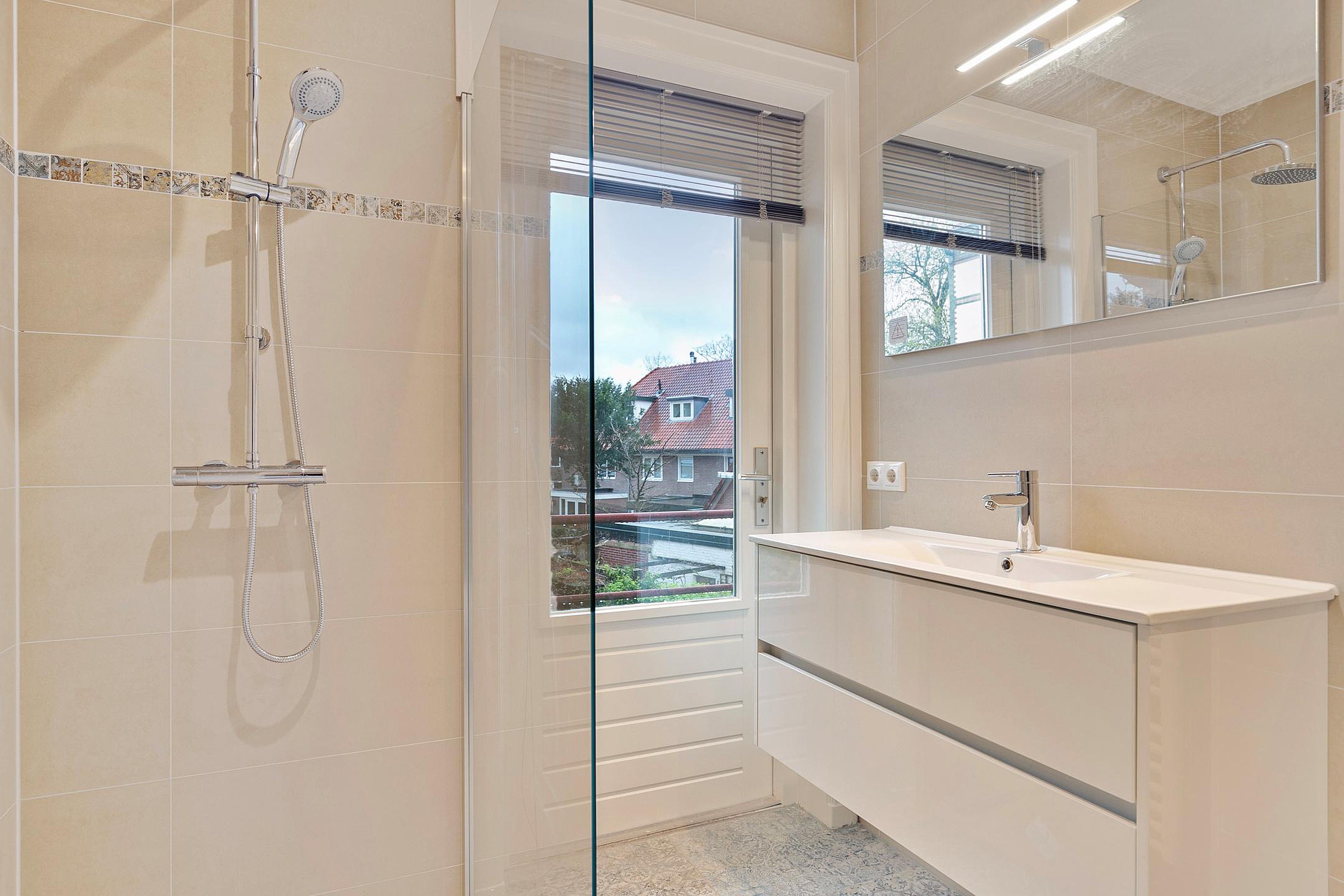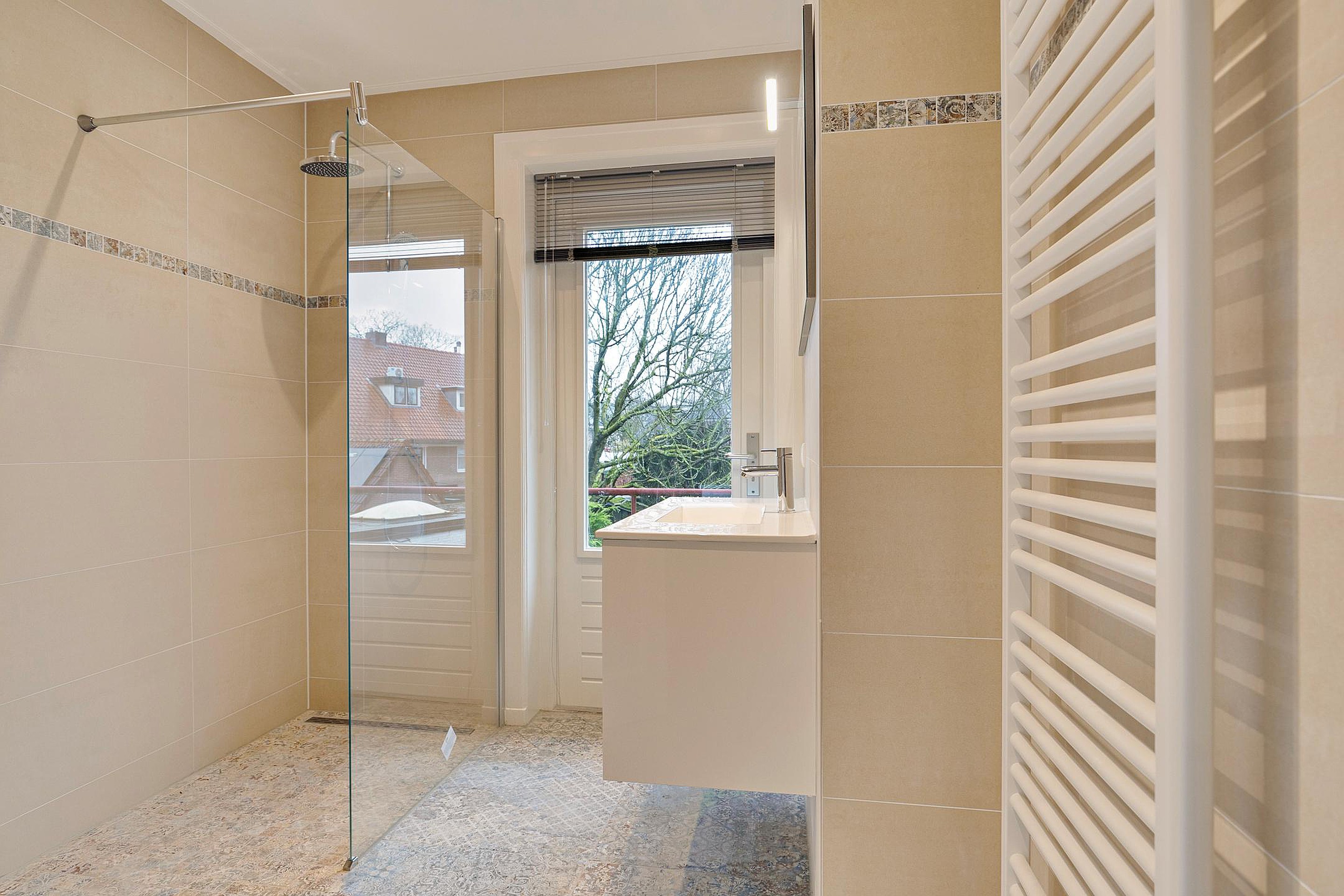 De mooi afgewerkte badkamer heeft een inloopdouche, tweede toilet, design radiator en een groot wastafelmeubel.