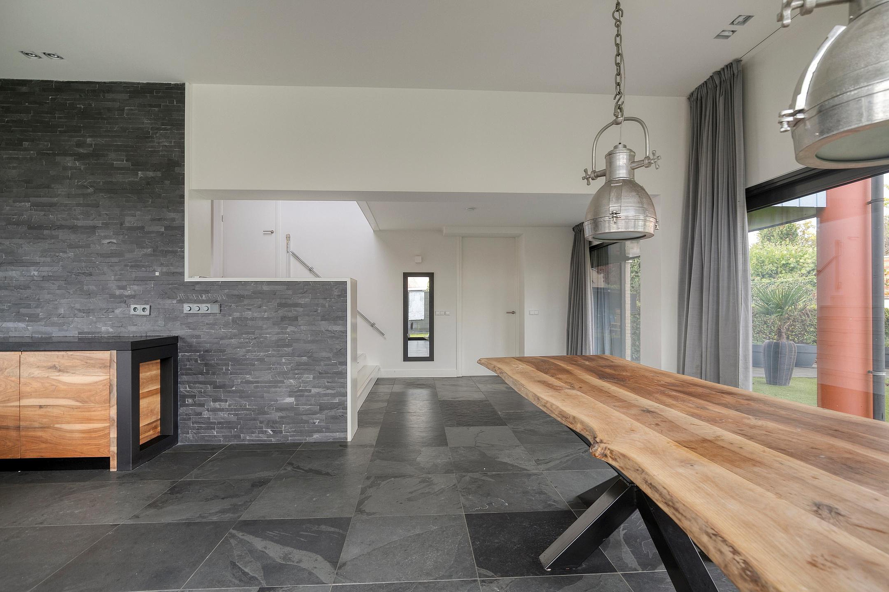 Via speelse traptreden naar de verhoogde, gezellige woonkamer met natuurstenen vloer, vloerverarming, veel lichtinval en vrij uitzicht.