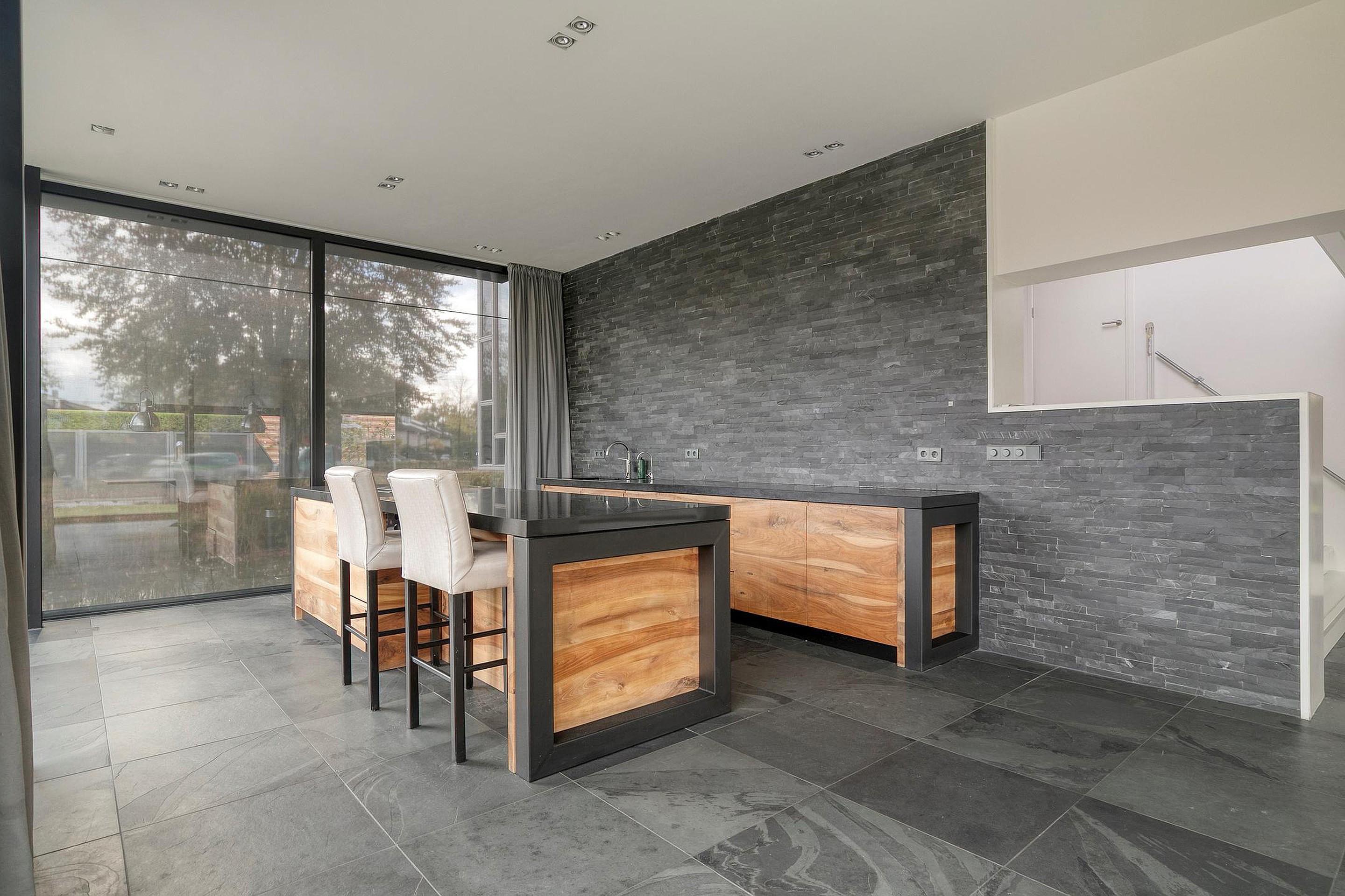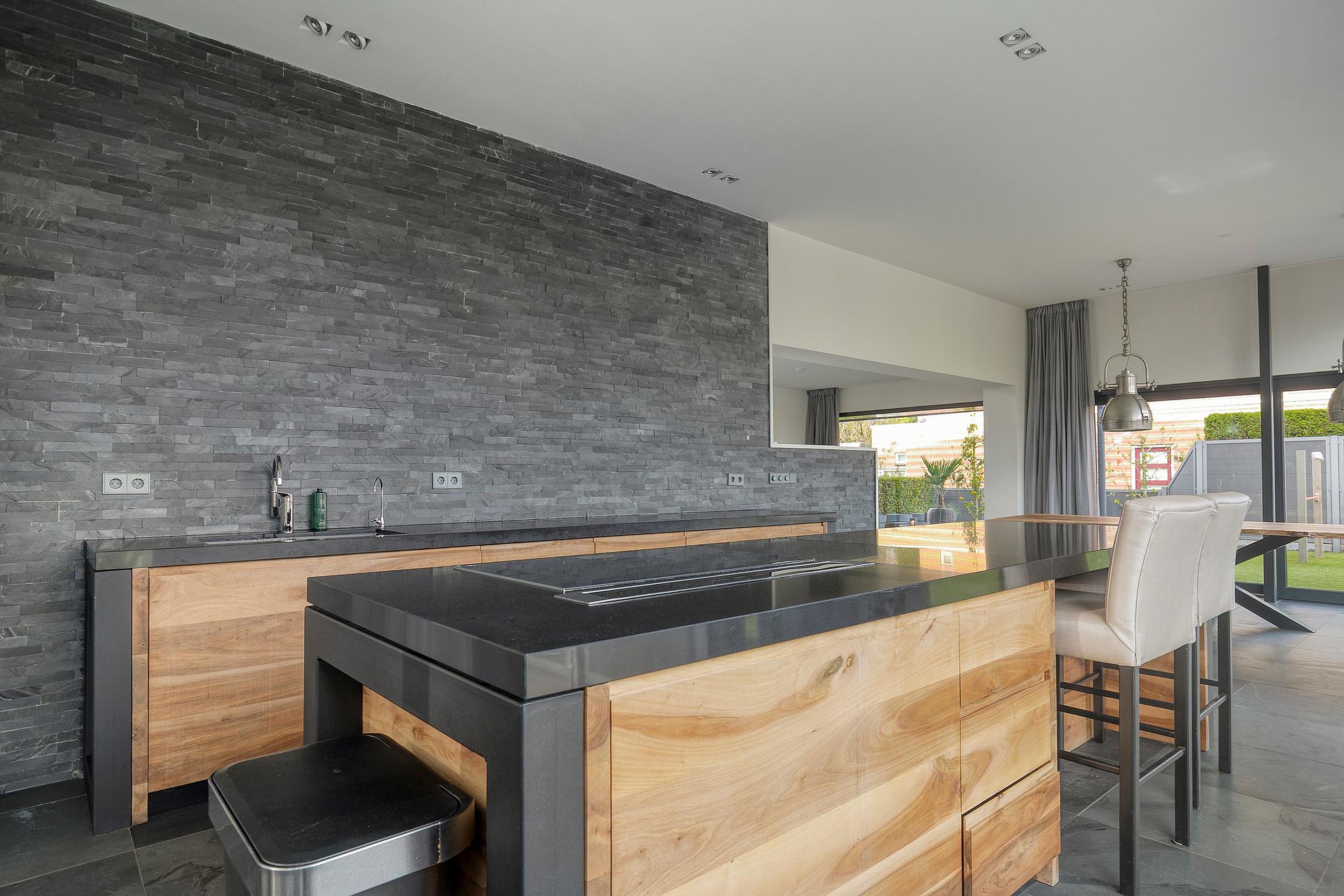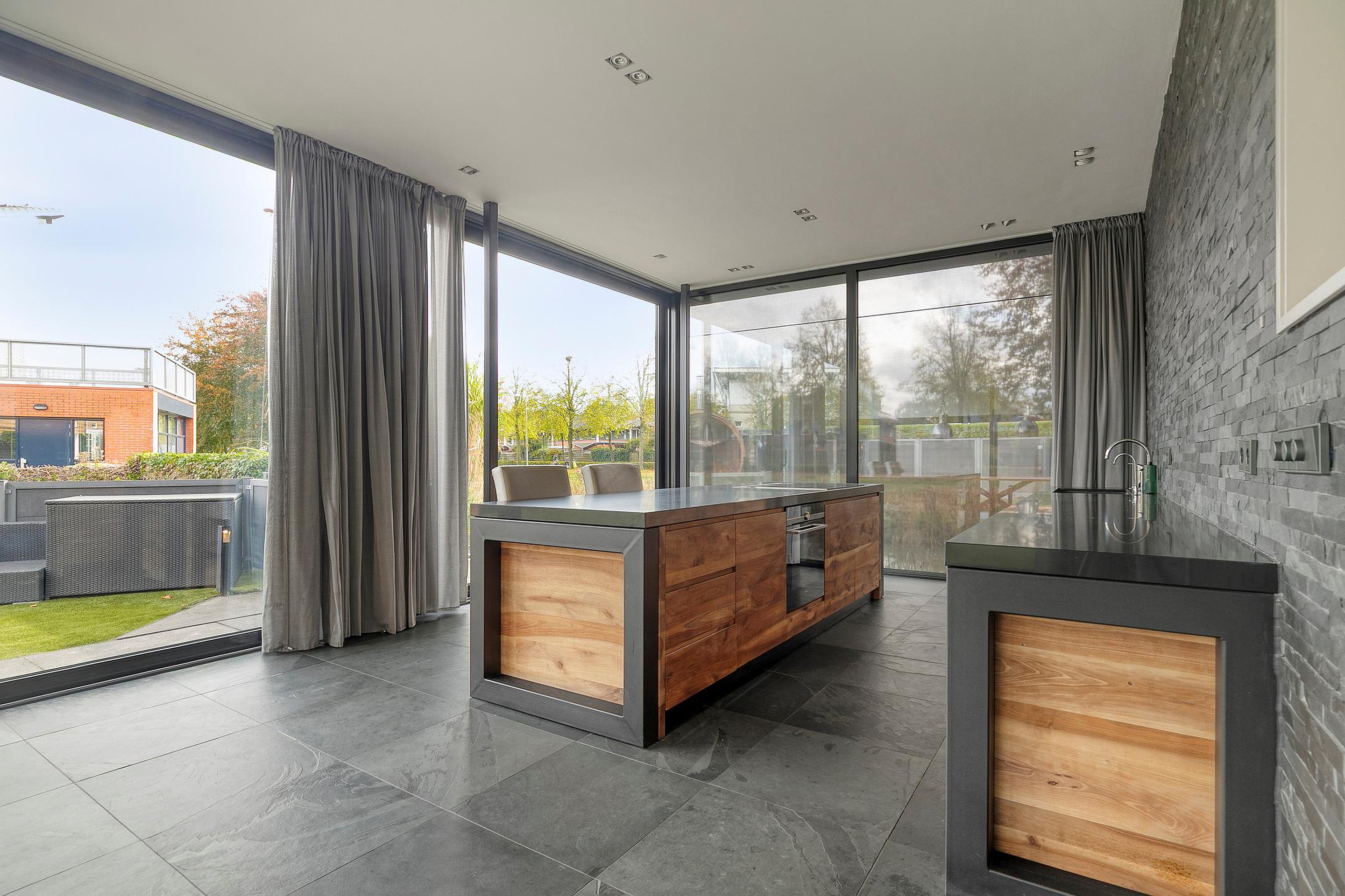Riante, uitgebouwde woonkeuken met kookeiland met veel laden, bergruimte, complete inbouwapparatuur, dubbele spoelbak, koelkastladen en een stijlvolle kastenwand.