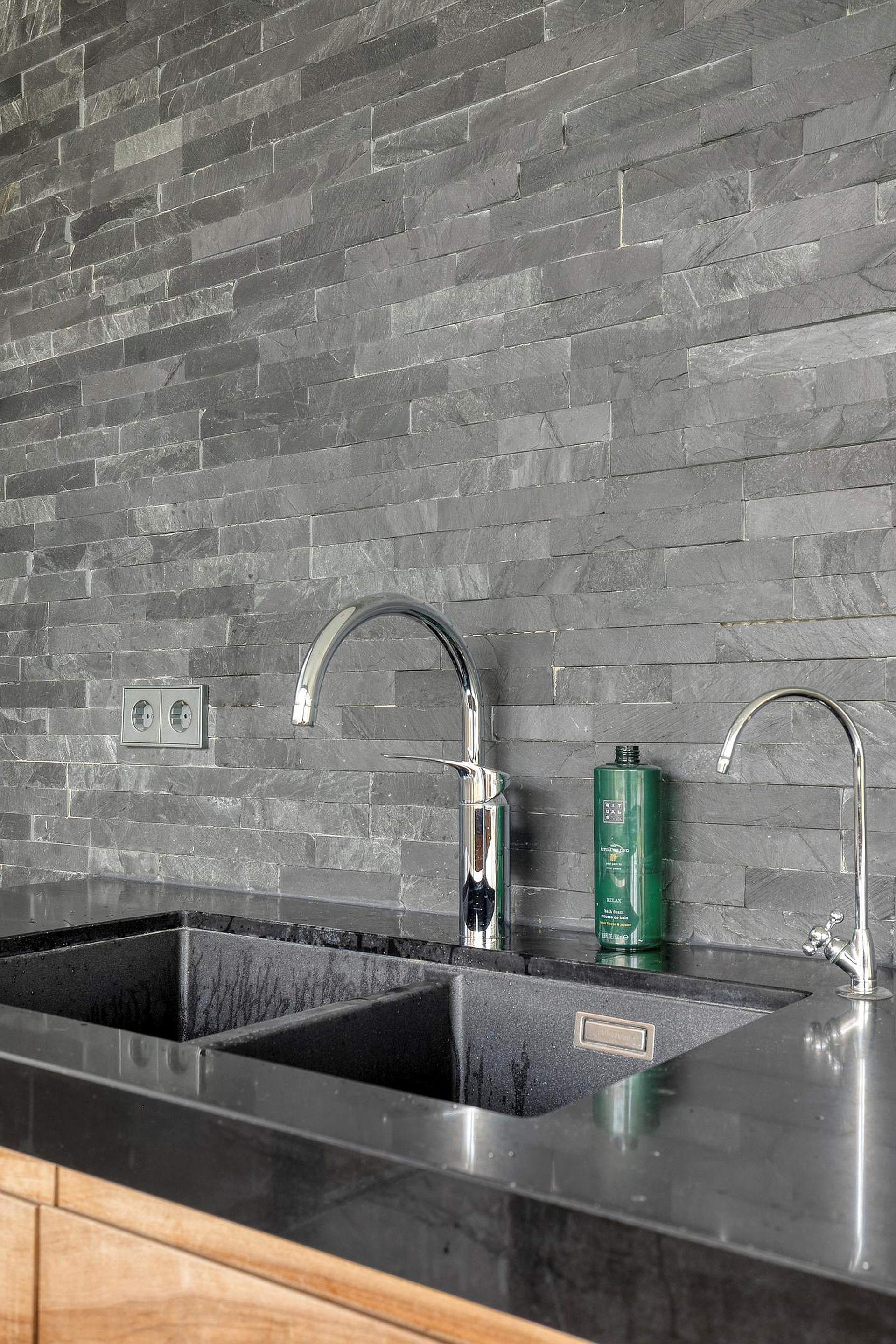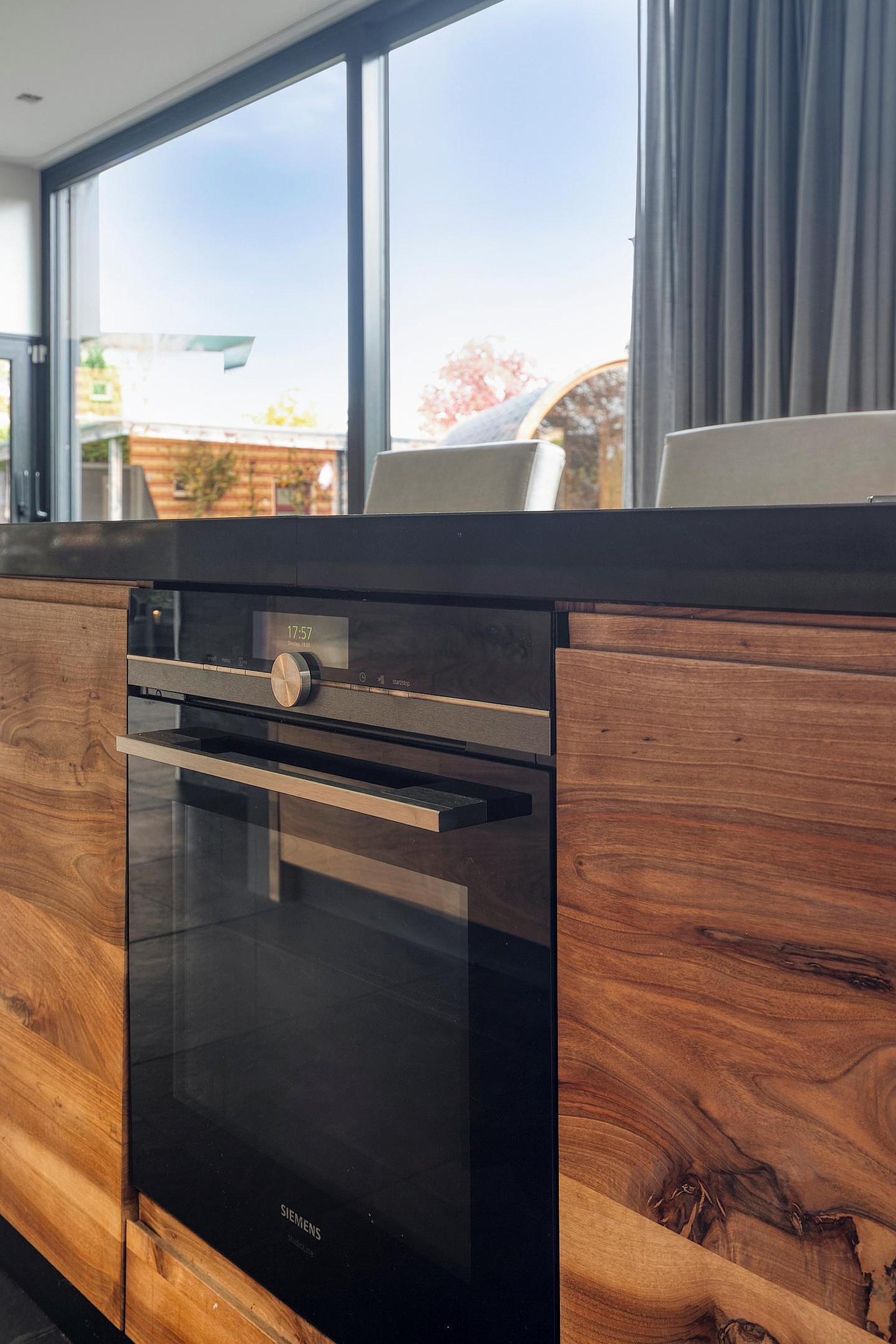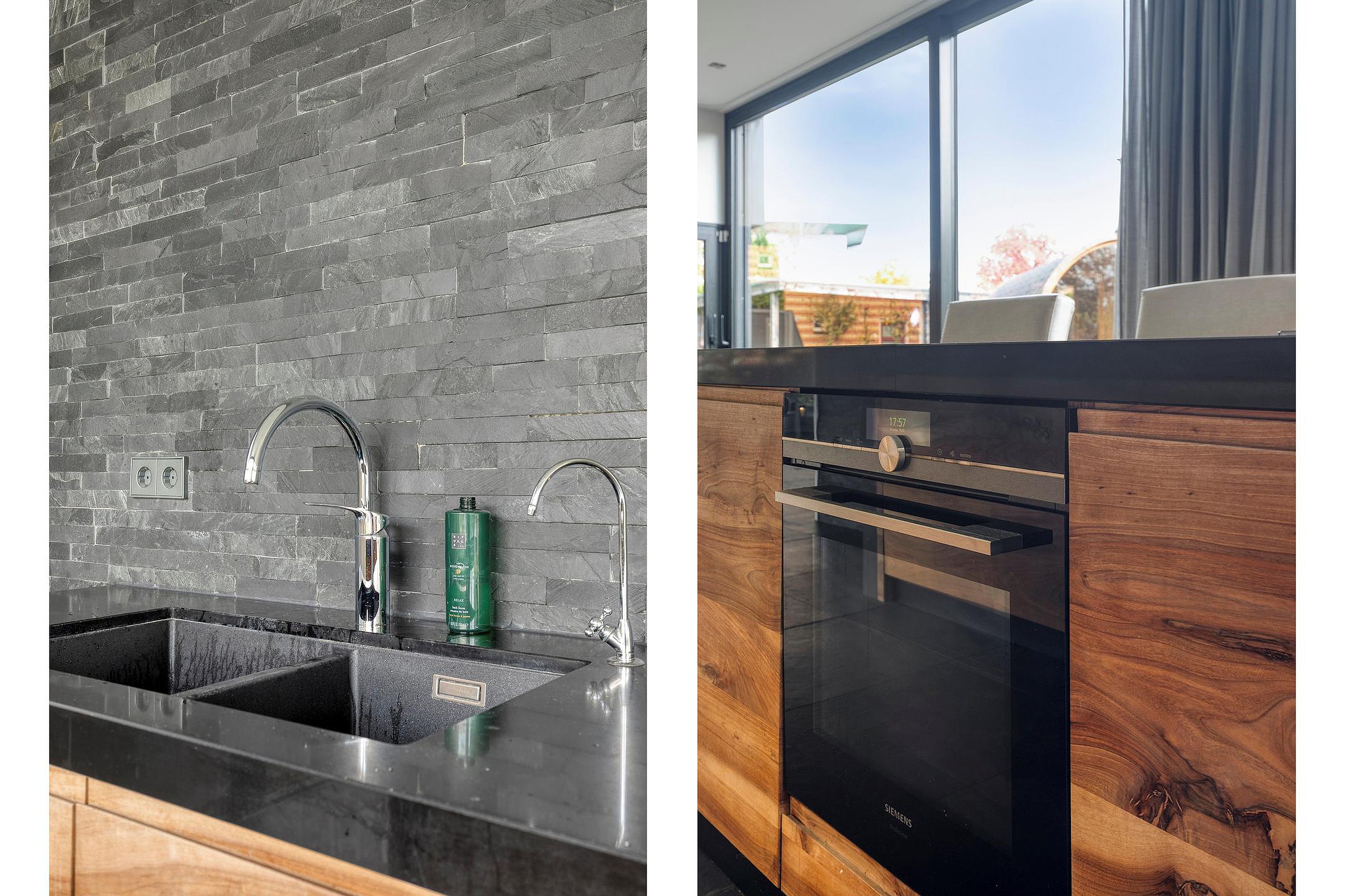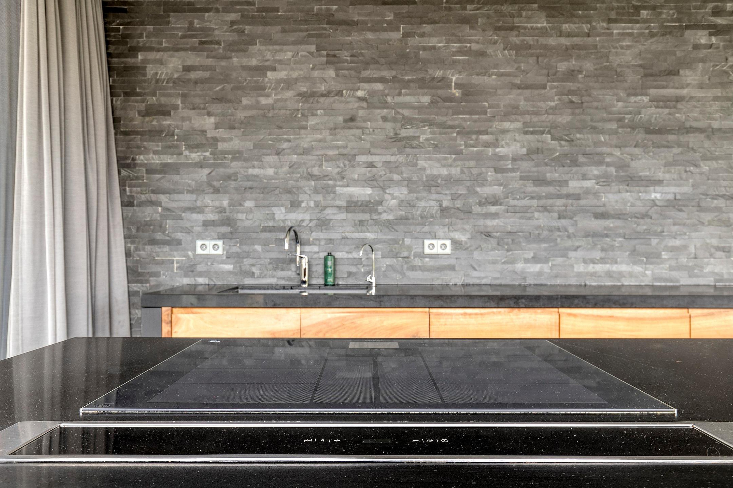 Riante, uitgebouwde woonkeuken met kookeiland met veel laden, bergruimte, complete inbouwapparatuur, dubbele spoelbak, koelkastladen en een stijlvolle kastenwand.