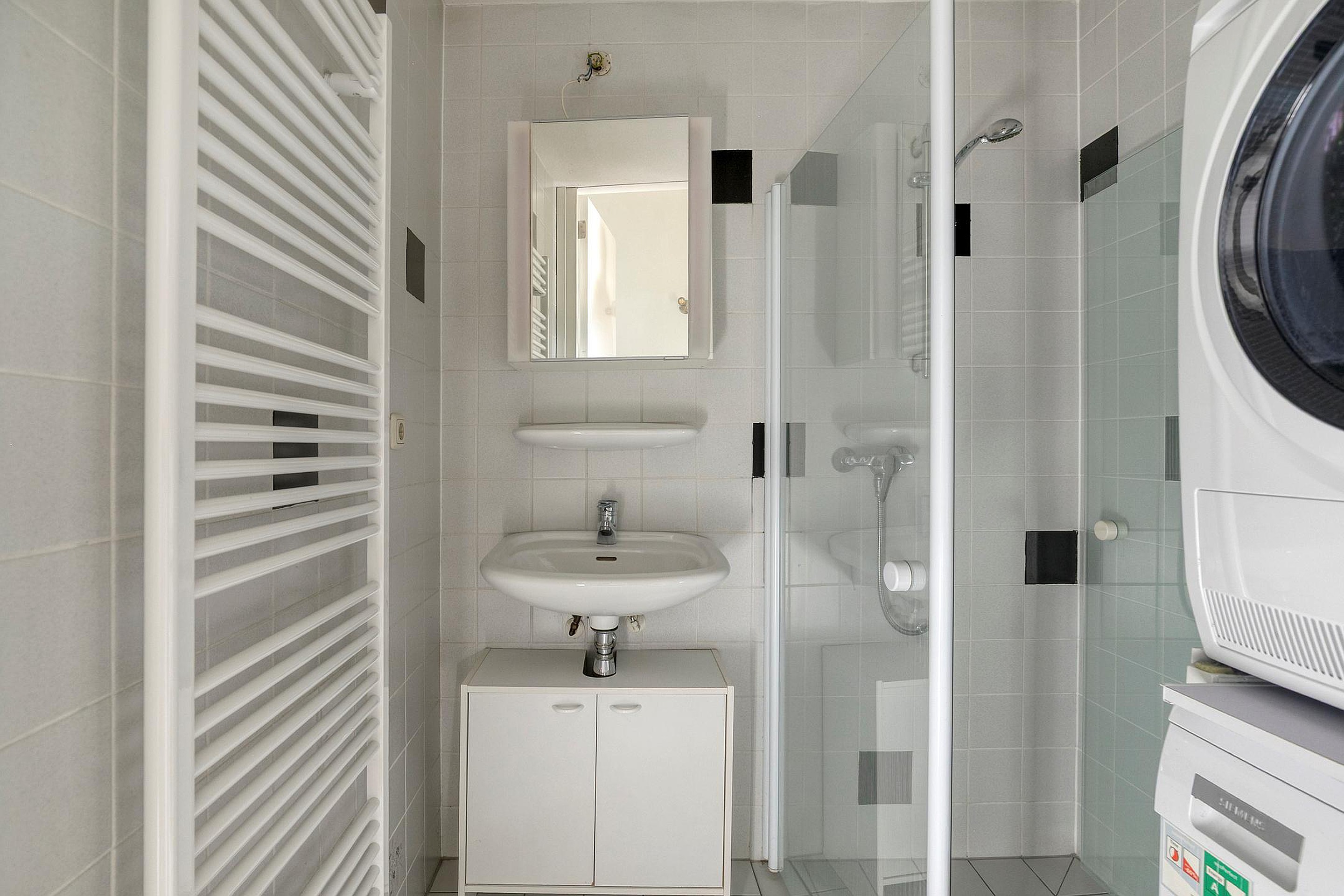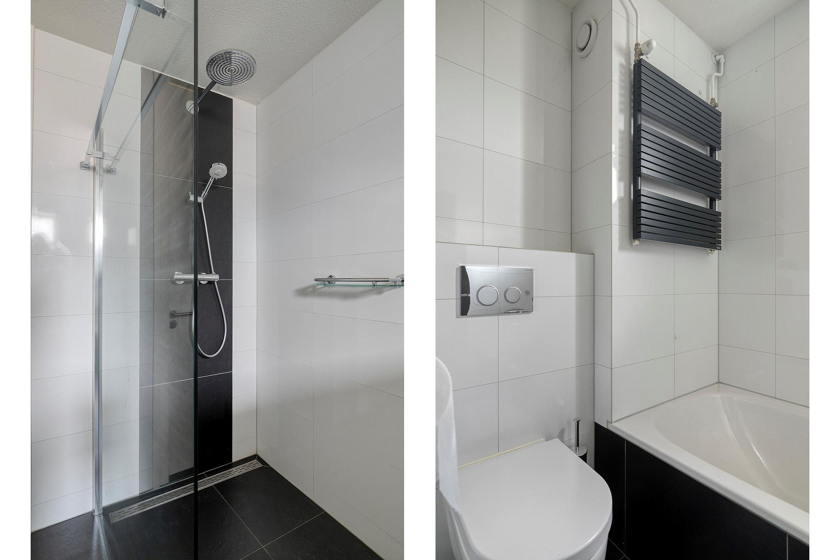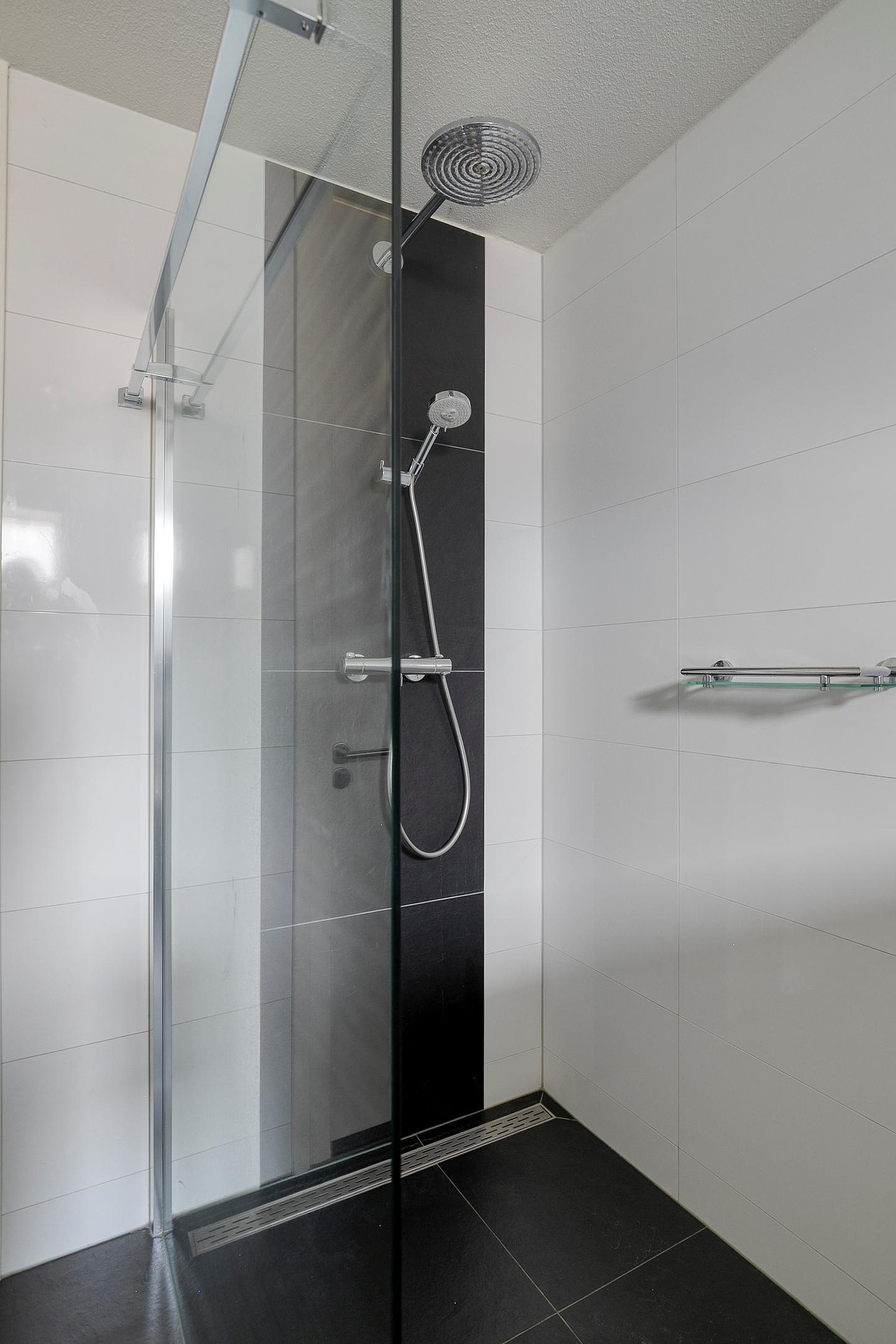 Twee slaapkamers en een tweede badkamer met douche, wastafel en wasmachine-/drogeropstelling.