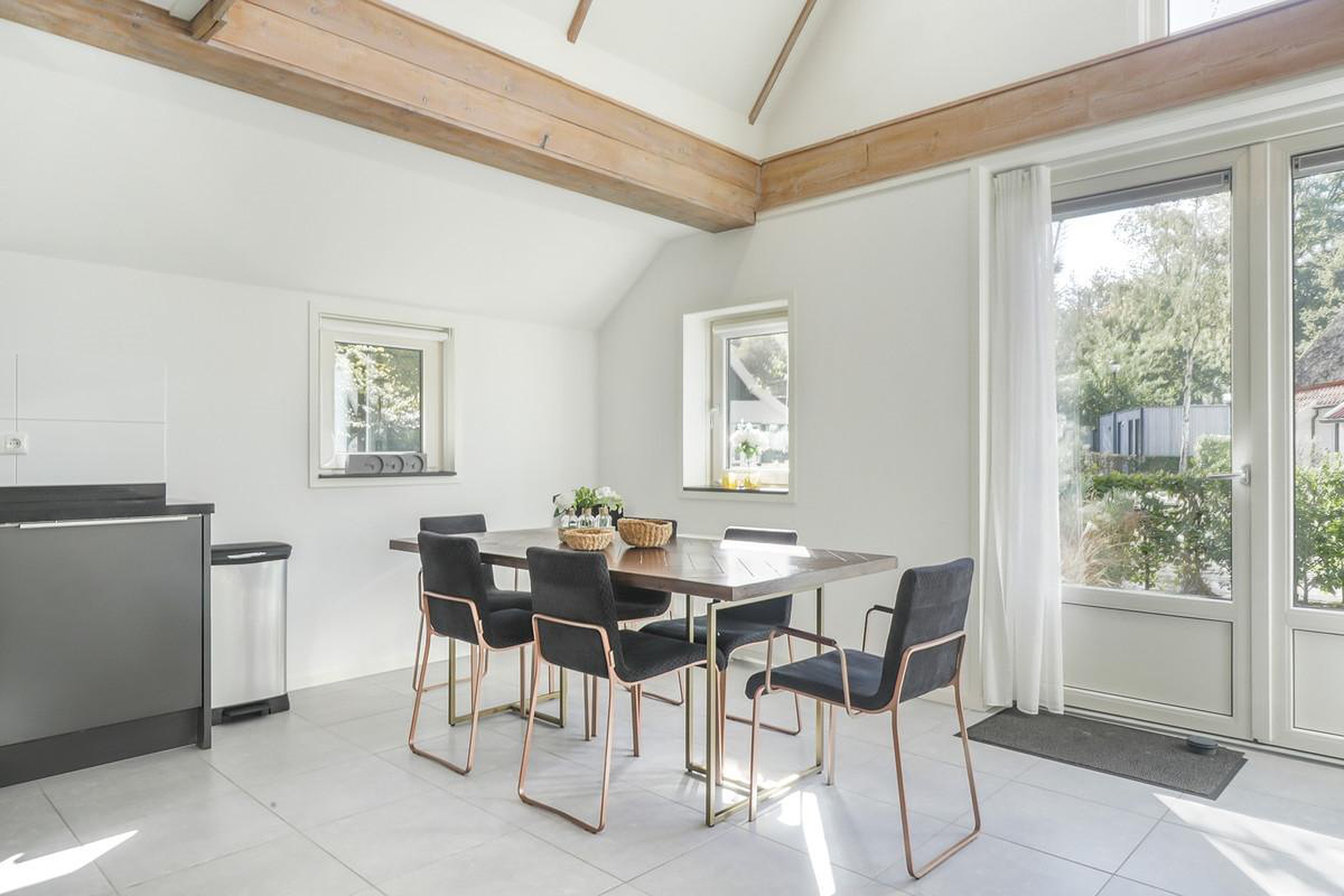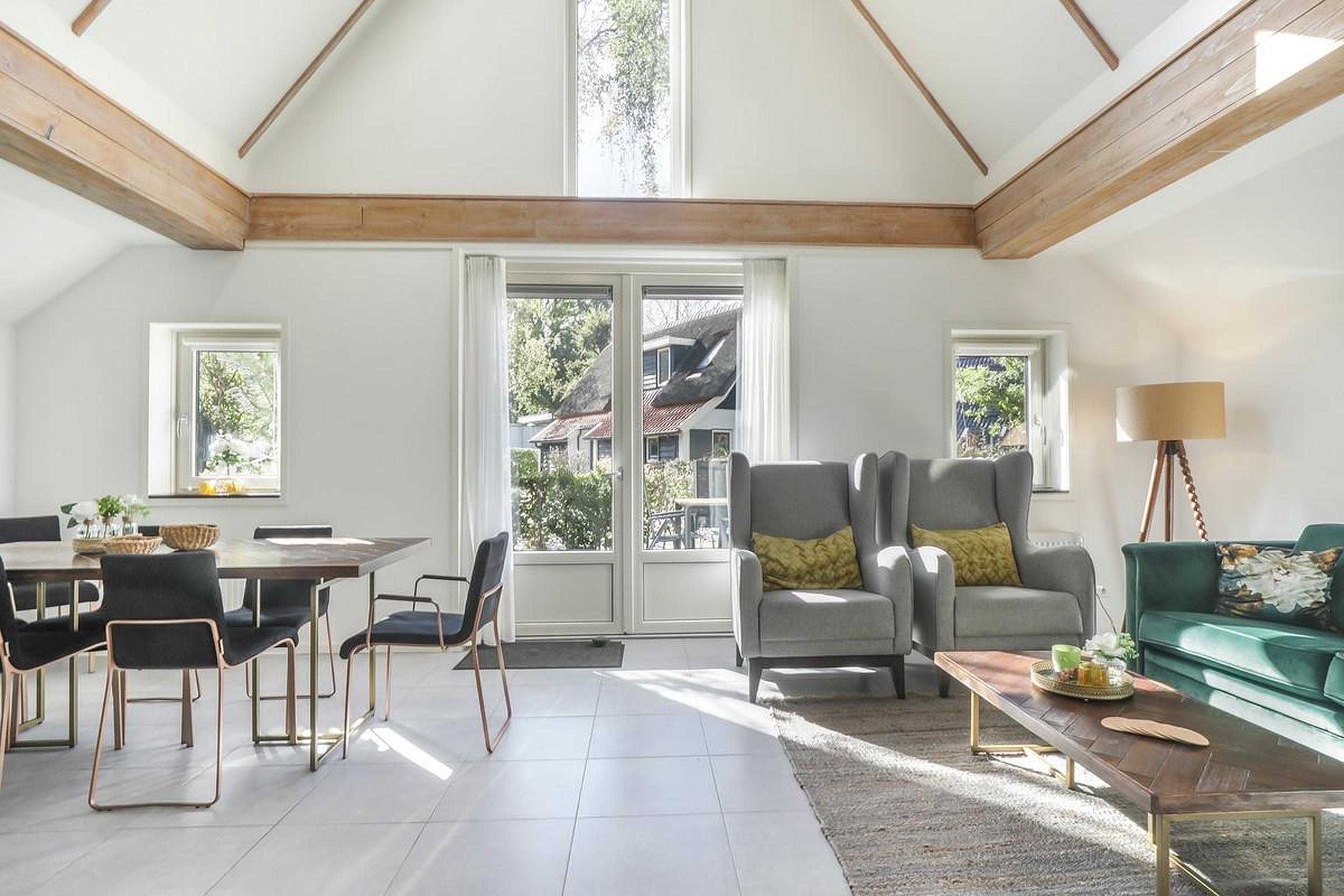 De woonkamer ligt aan de voorzijde, heeft dubbele deuren naar het terras en een zeer sfeervolle vide tot de nok van de woning.
