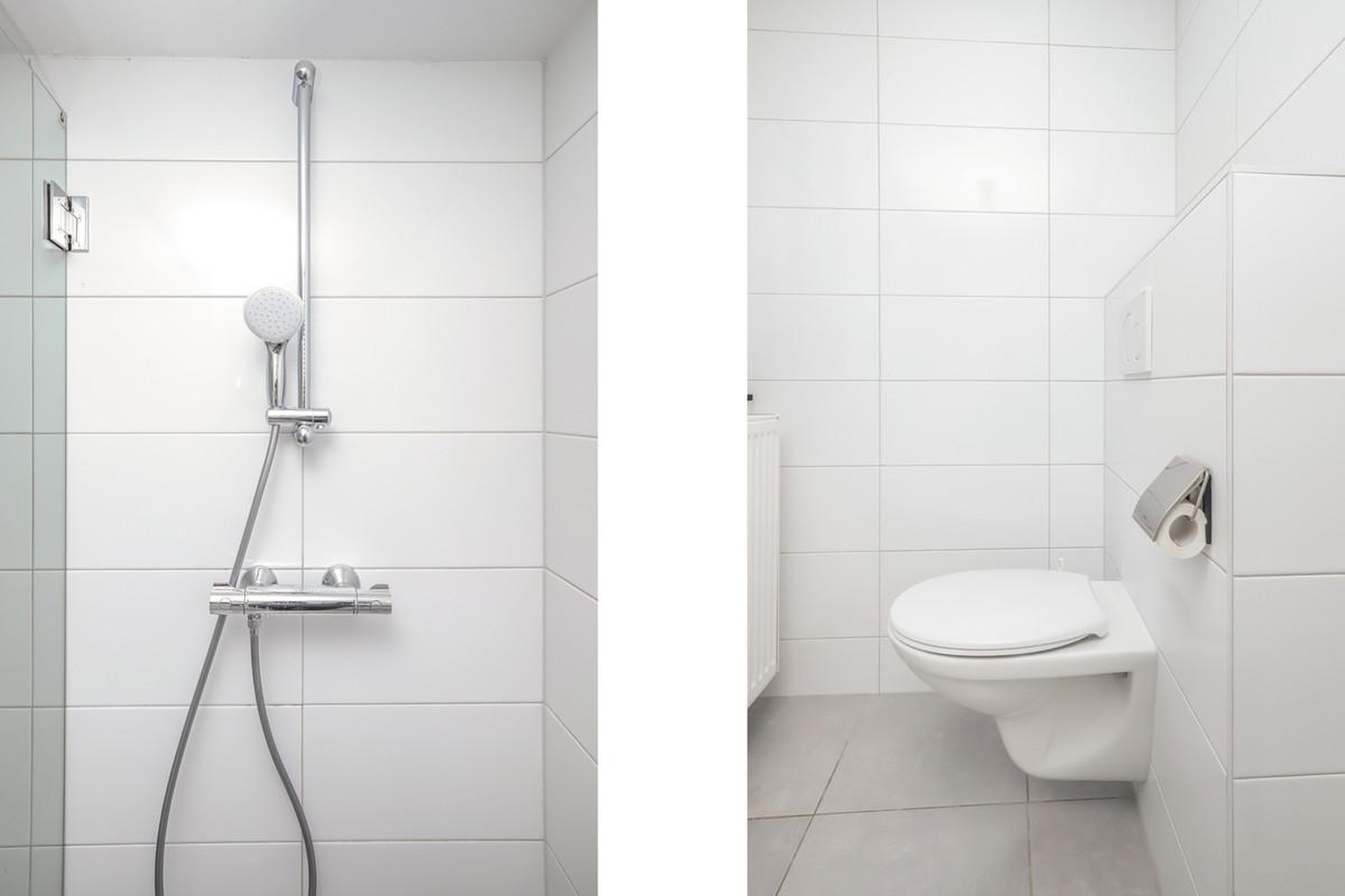 De tweede badkamer met inloopdouche, wastafelmeubel en wancloset.