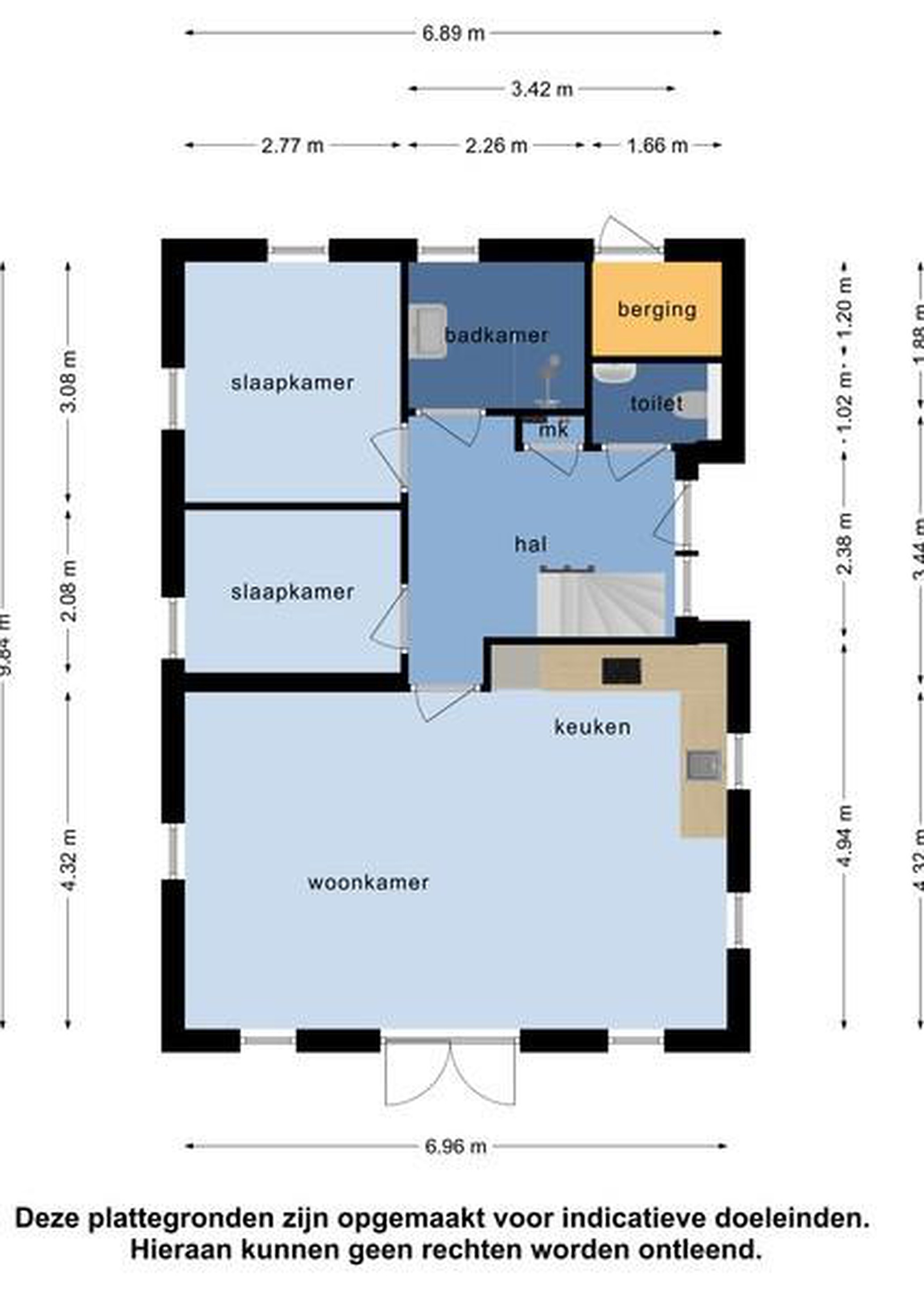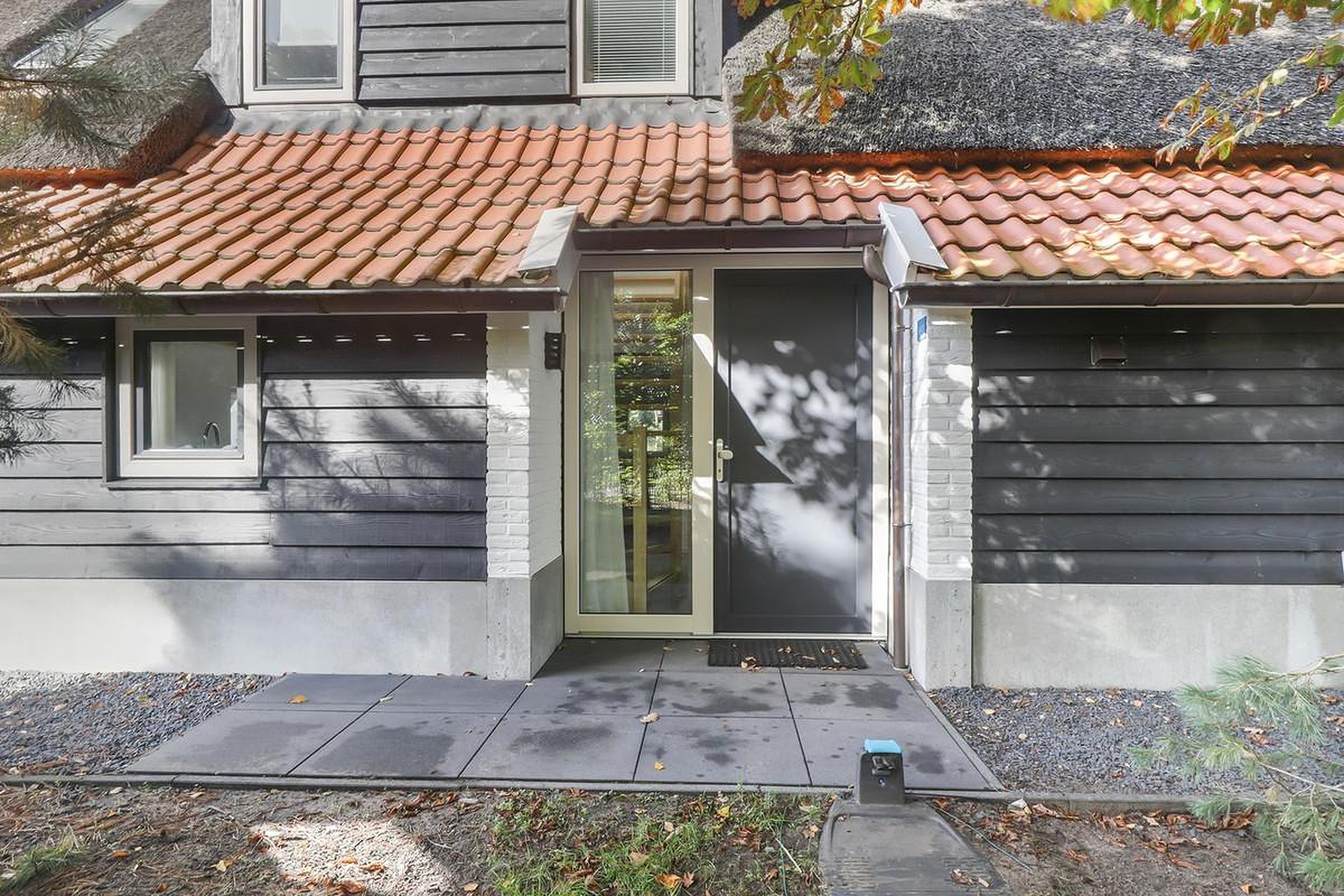 De woning heeft de mogelijkheid om twee auto’s voor de deur te parkeren. Je komt de woning aan de zijkant binnen. Hier heb je een ruime hal.