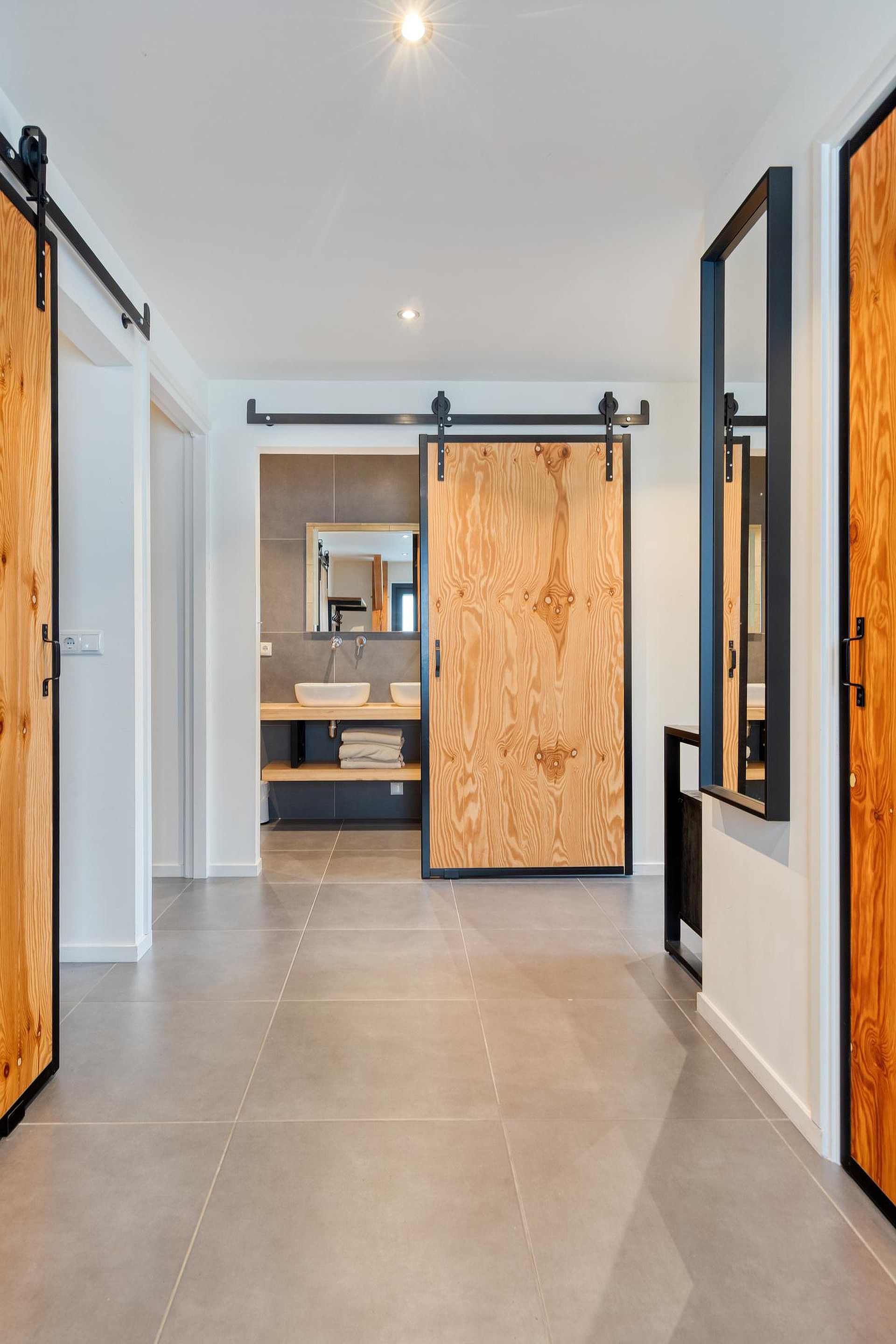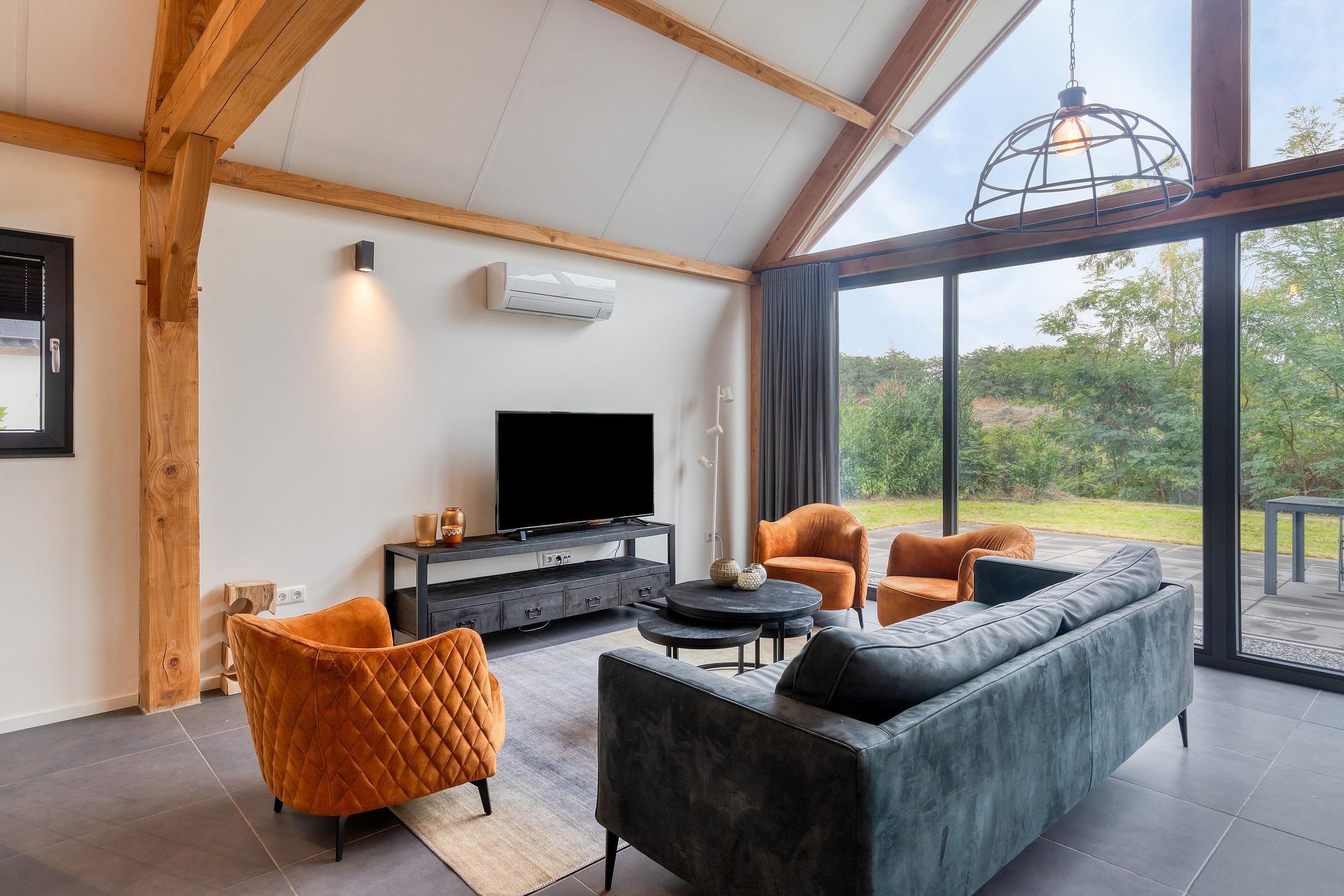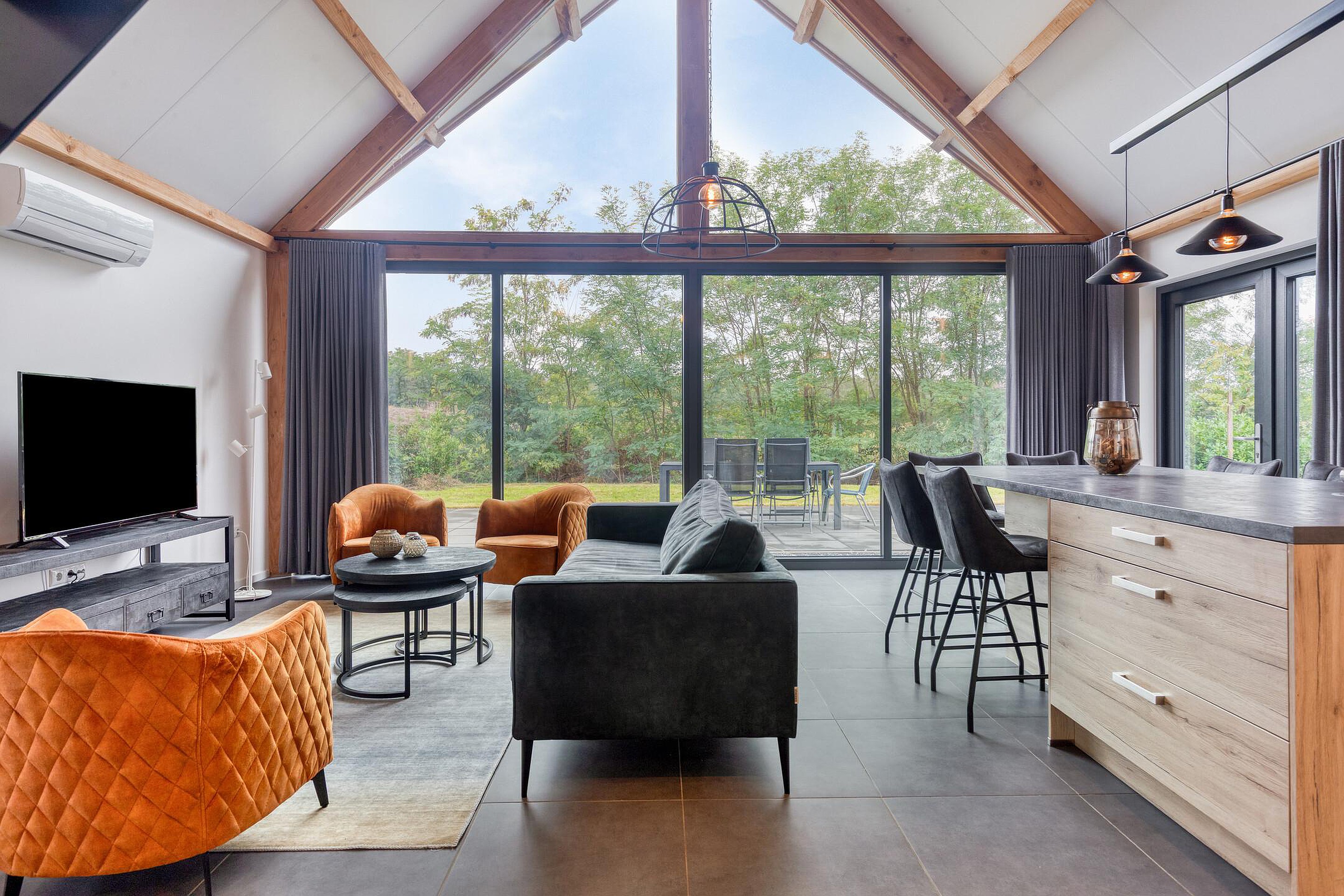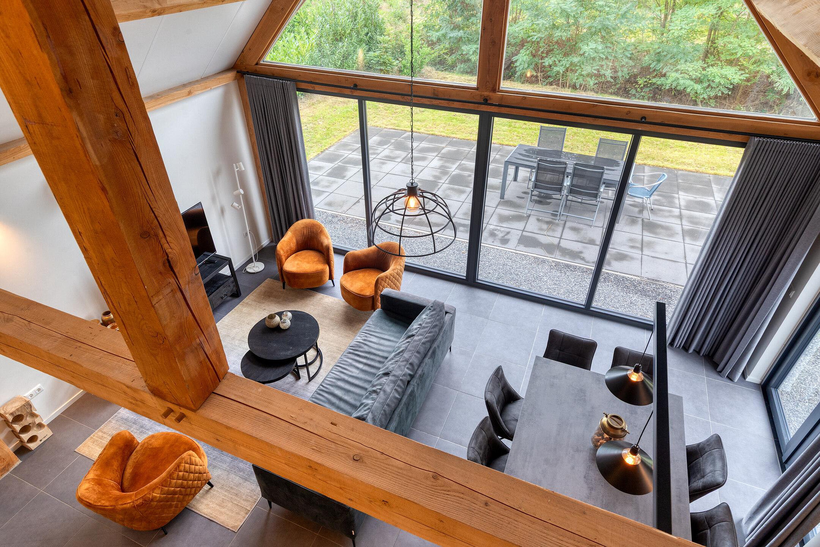 De woning straalt ruimte en karakter uit dankzij de hoge plafonds en de robuuste houten spanten in de woonkamer. De openslaande deuren naar het terras zorgen voor een natuurlijke overgang tussen binnen en buiten, waardoor het buitenleven altijd dichtbij is.