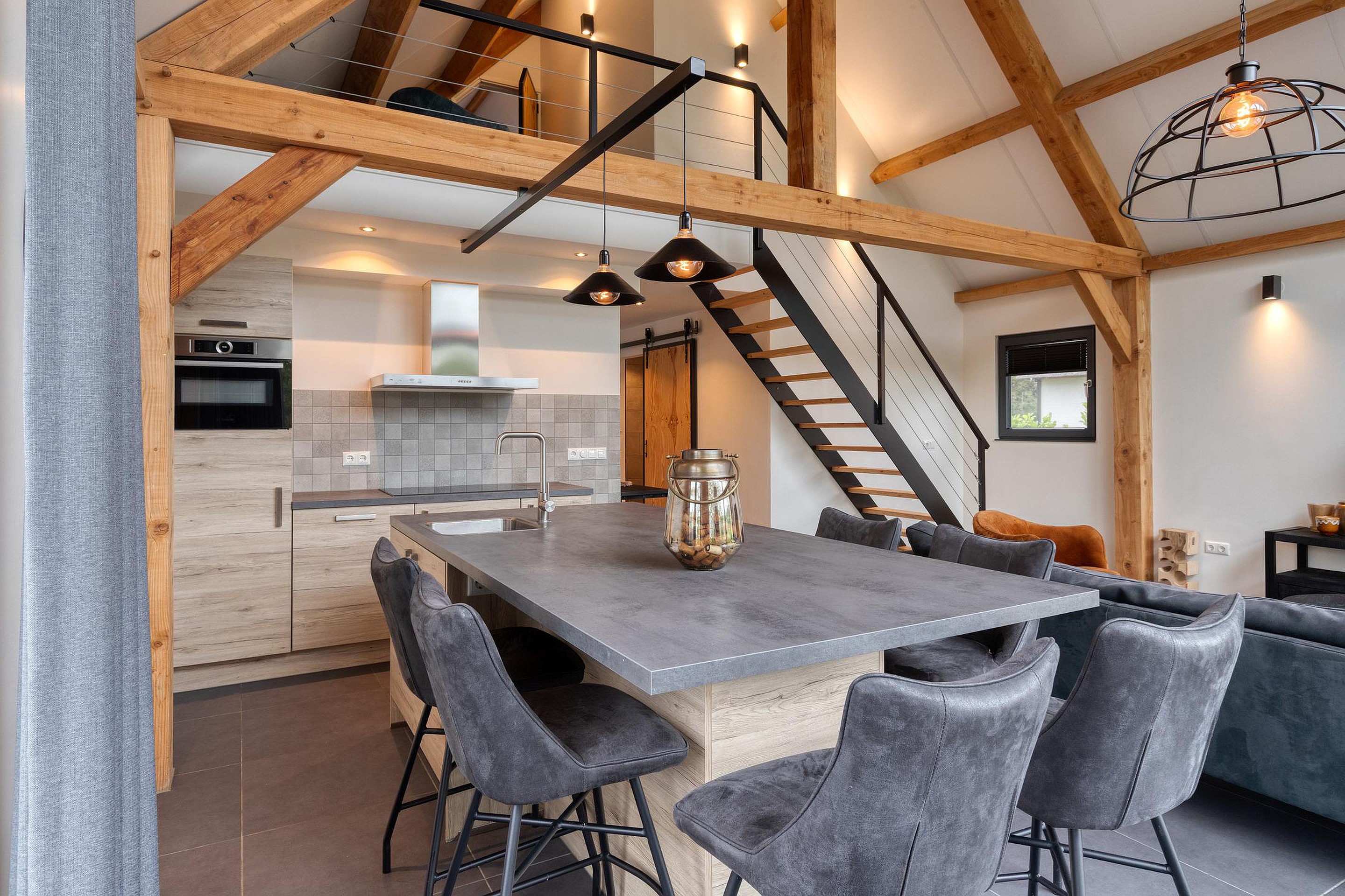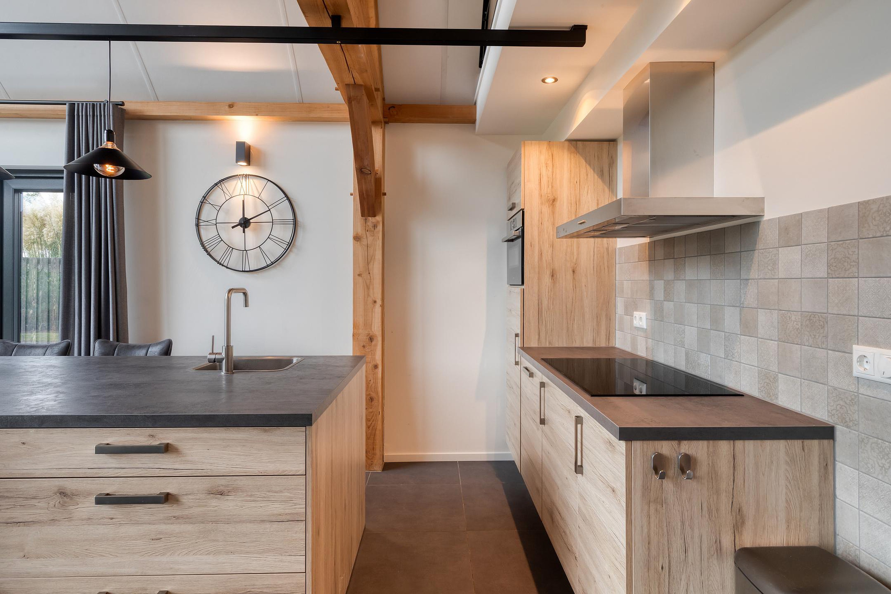 De moderne open keuken is van alle gemakken voorzien, met hoogwaardige inbouwapparatuur zoals een combimagnetron, vaatwasser en kookplaat met afzuigkap. De royale kook- en eettafel vormt het kloppend hart van de woning – een plek voor lange gesprekken, goede maaltijden en fijne momenten met familie en vrienden.