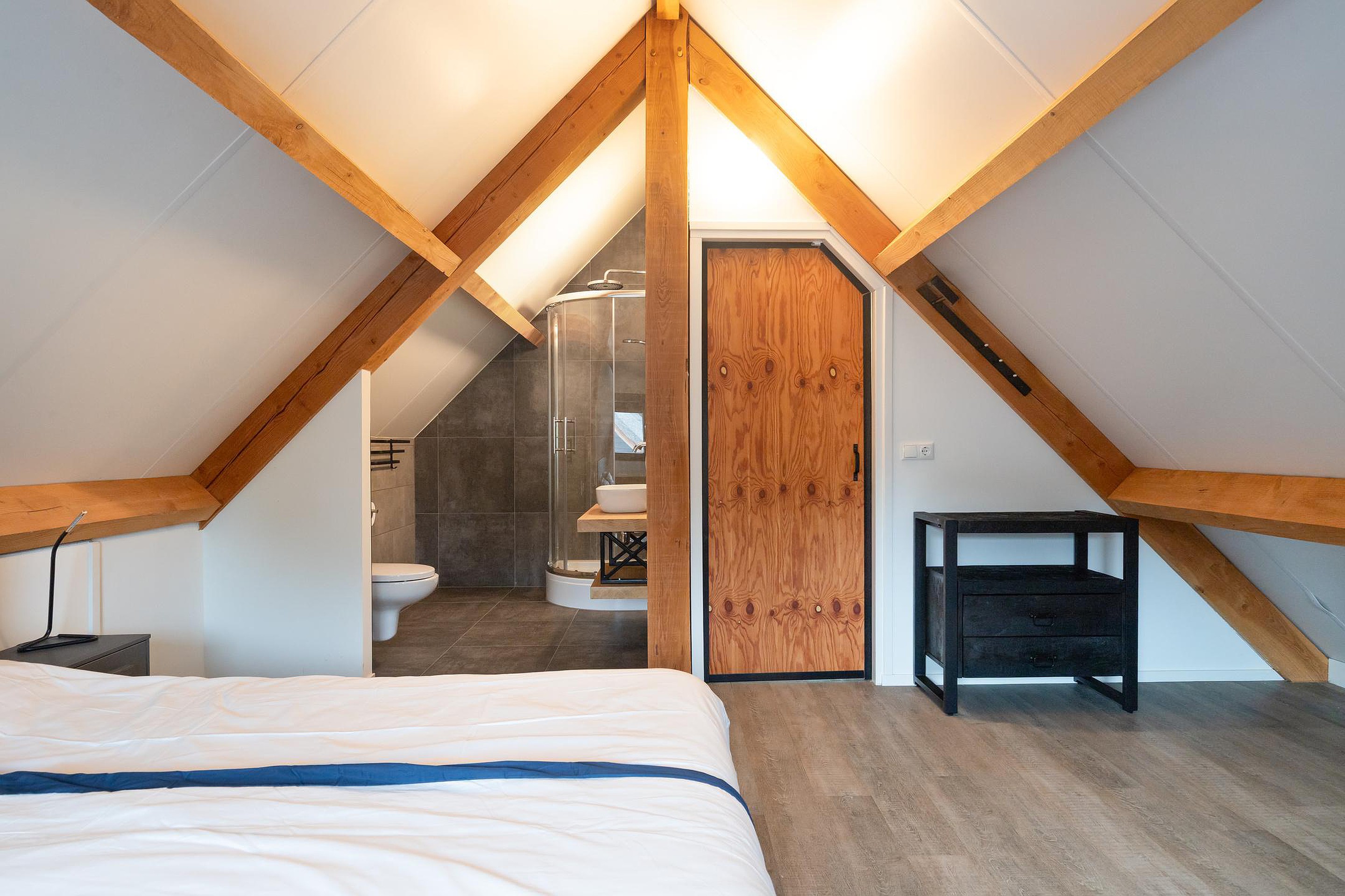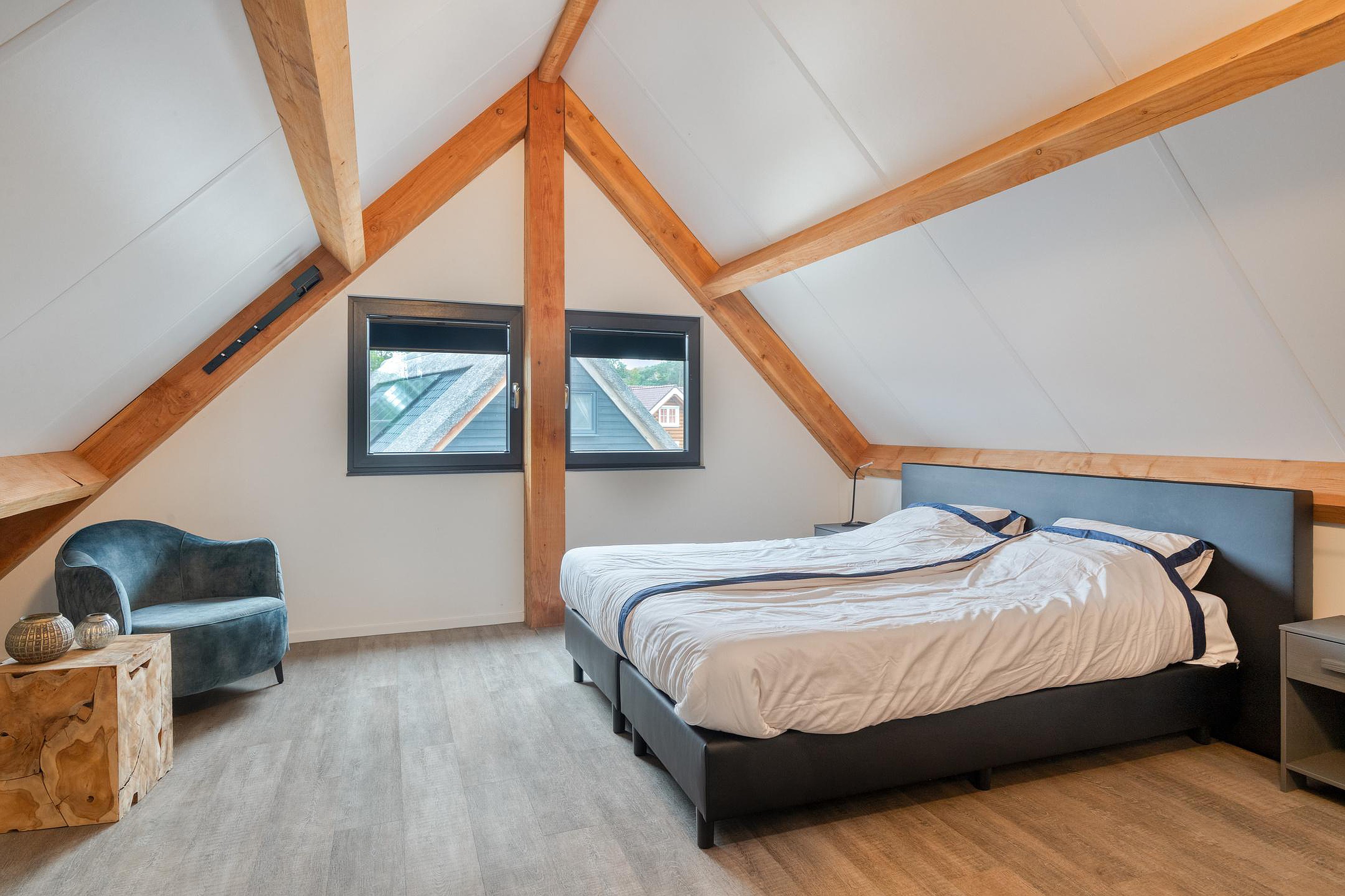 De verdieping biedt de masterbedroom, een extra zit- of werkhoek en een tweede badkamer met douche en toilet. Dankzij de vide blijft het geheel licht, open en verbonden – een woning die ademt.