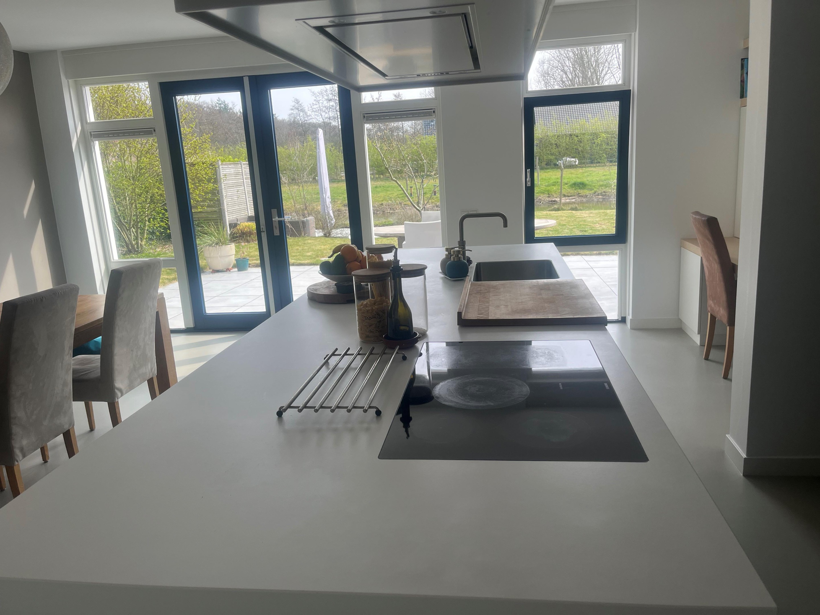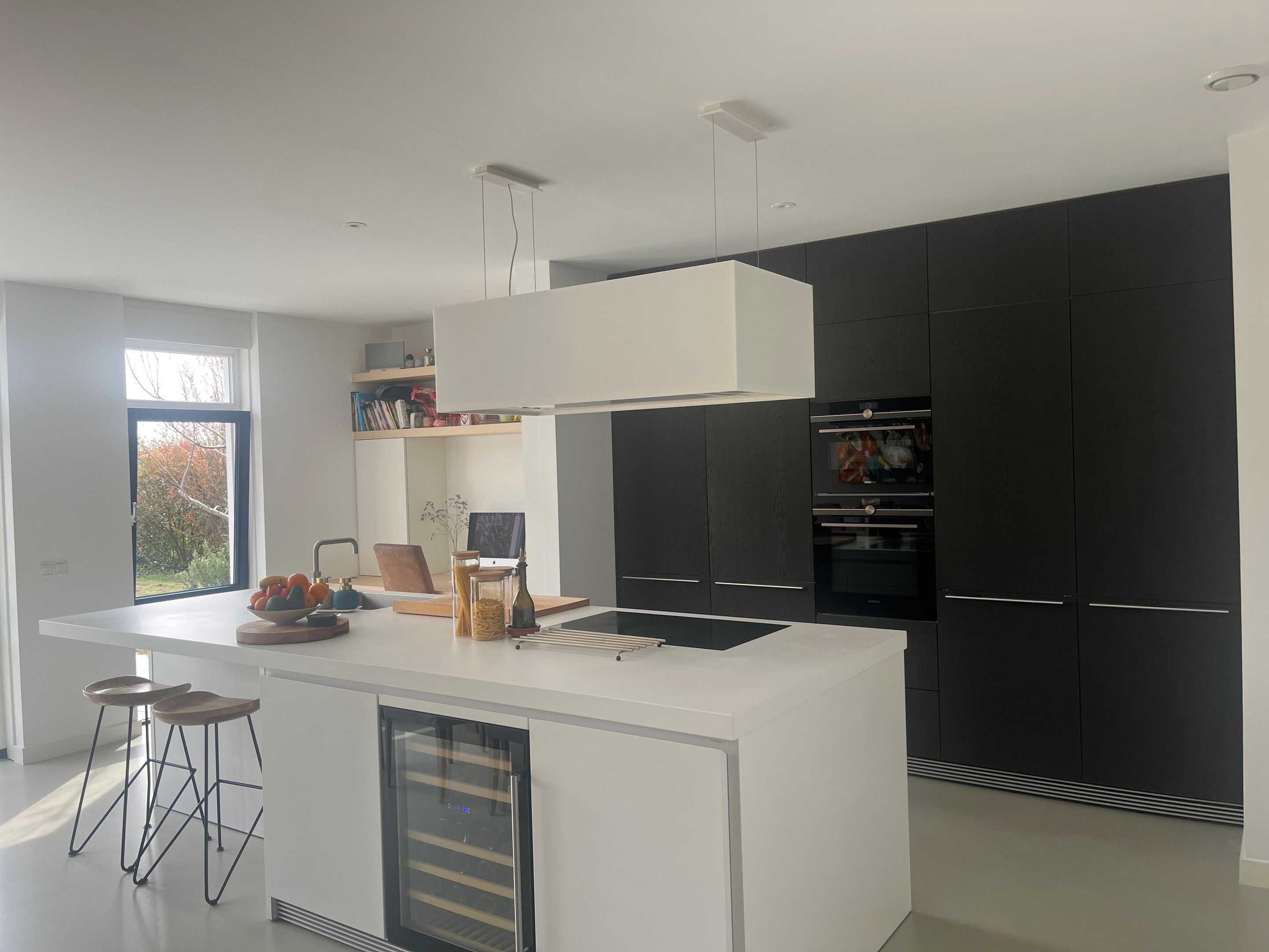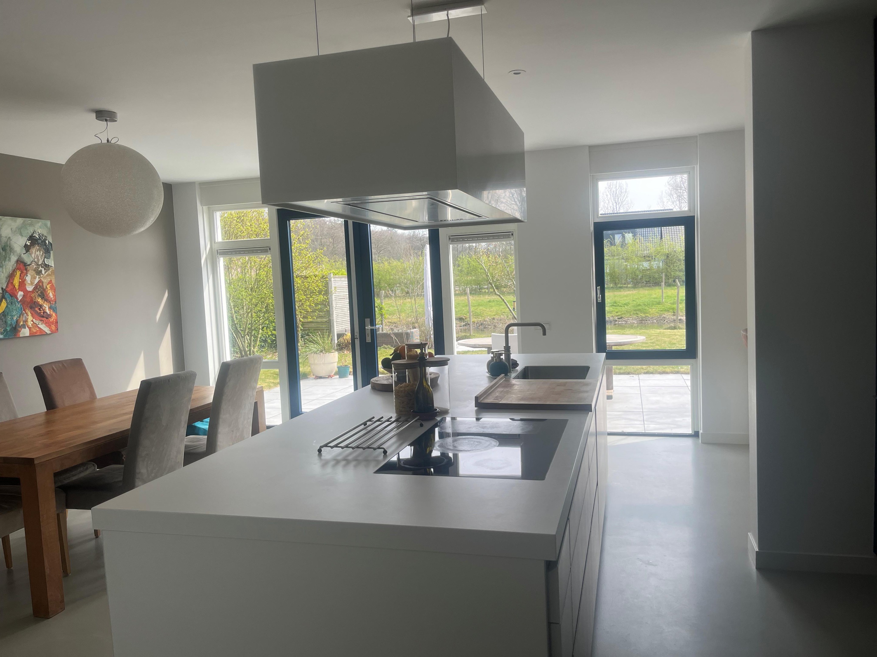 Begane grond: Entree met toilet en toegang tot de royale voorkamer met veel lichtinval of doorloop naar de luxe woonkeuken aan achterzijde. Moderne, volledig uitgeruste open keuken met o.a.: combi-oven, stoomoven, inductiekookplaat, grote afzuigkap, vaatwasser en klimaatkast. Strakke lichtgrijze gietvloer met comfortabele vloerverwarming op de begane grond en eerste verdieping. Openslaande deuren naar de zonnige achtertuin.