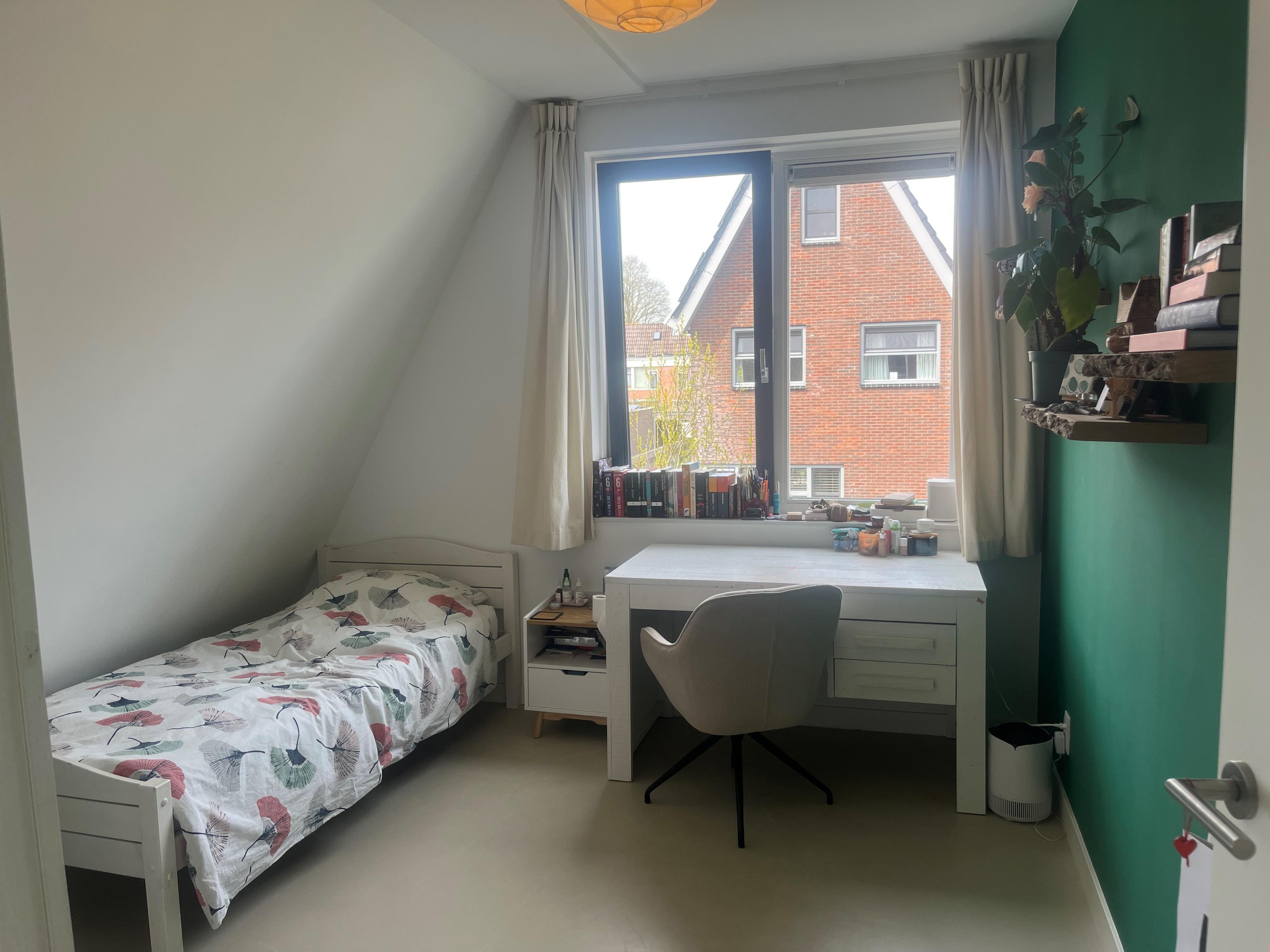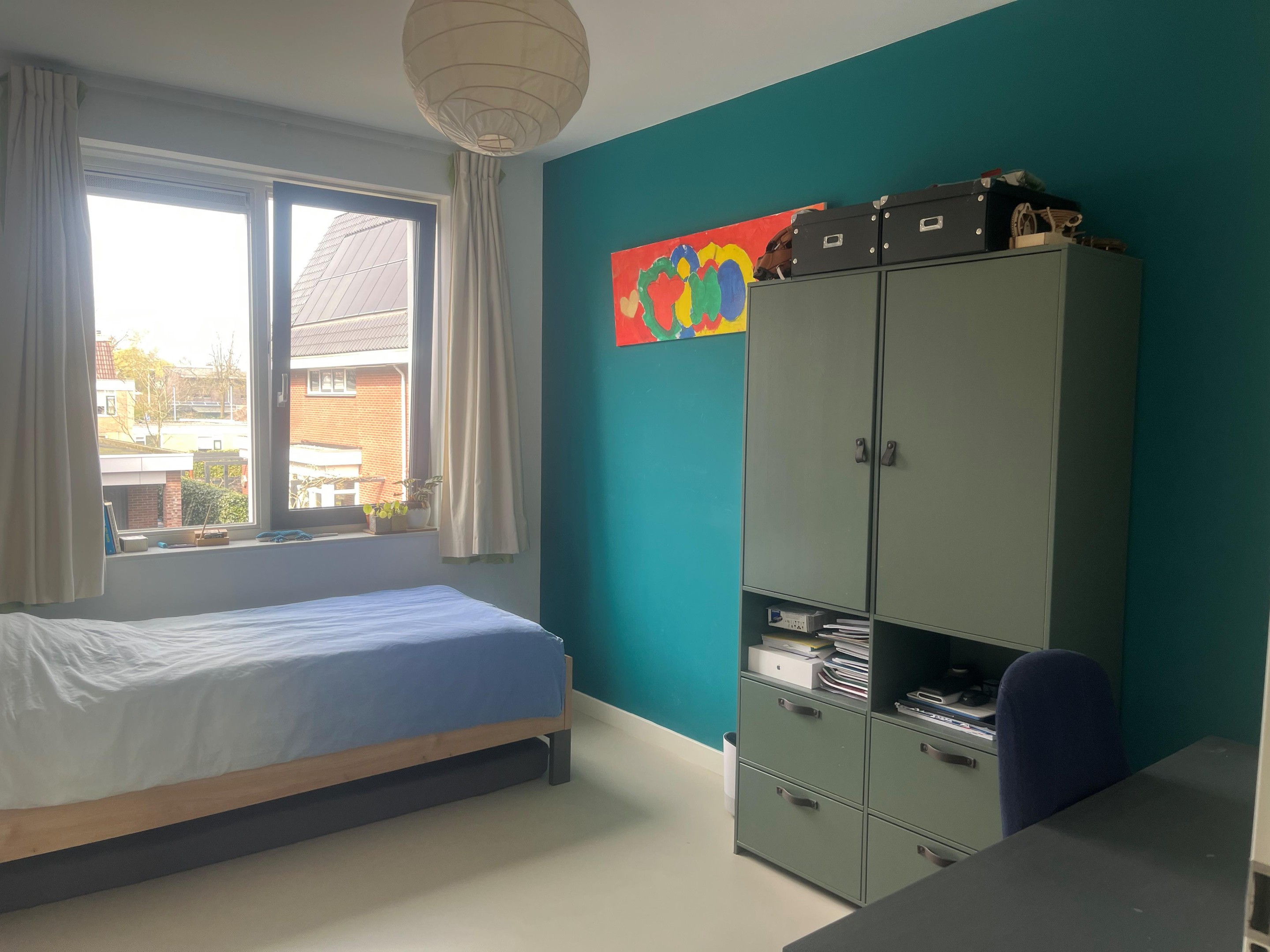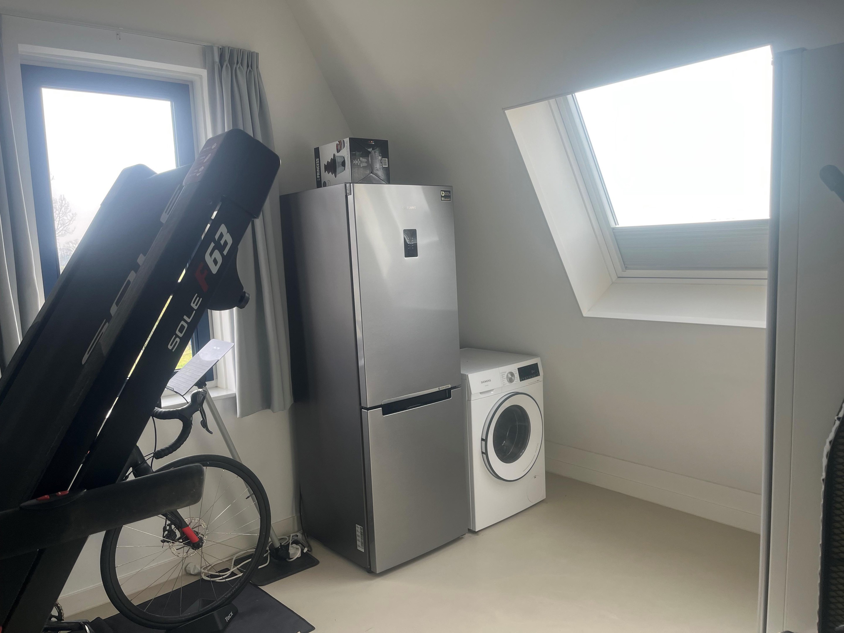 Tweede verdieping: Vierde slaapkamer annex kantoorruimte. Royale doorloop naar achterruimte, waarin de was/droogcombinatie en een grote vriezer staan opgesteld; extra dakramen