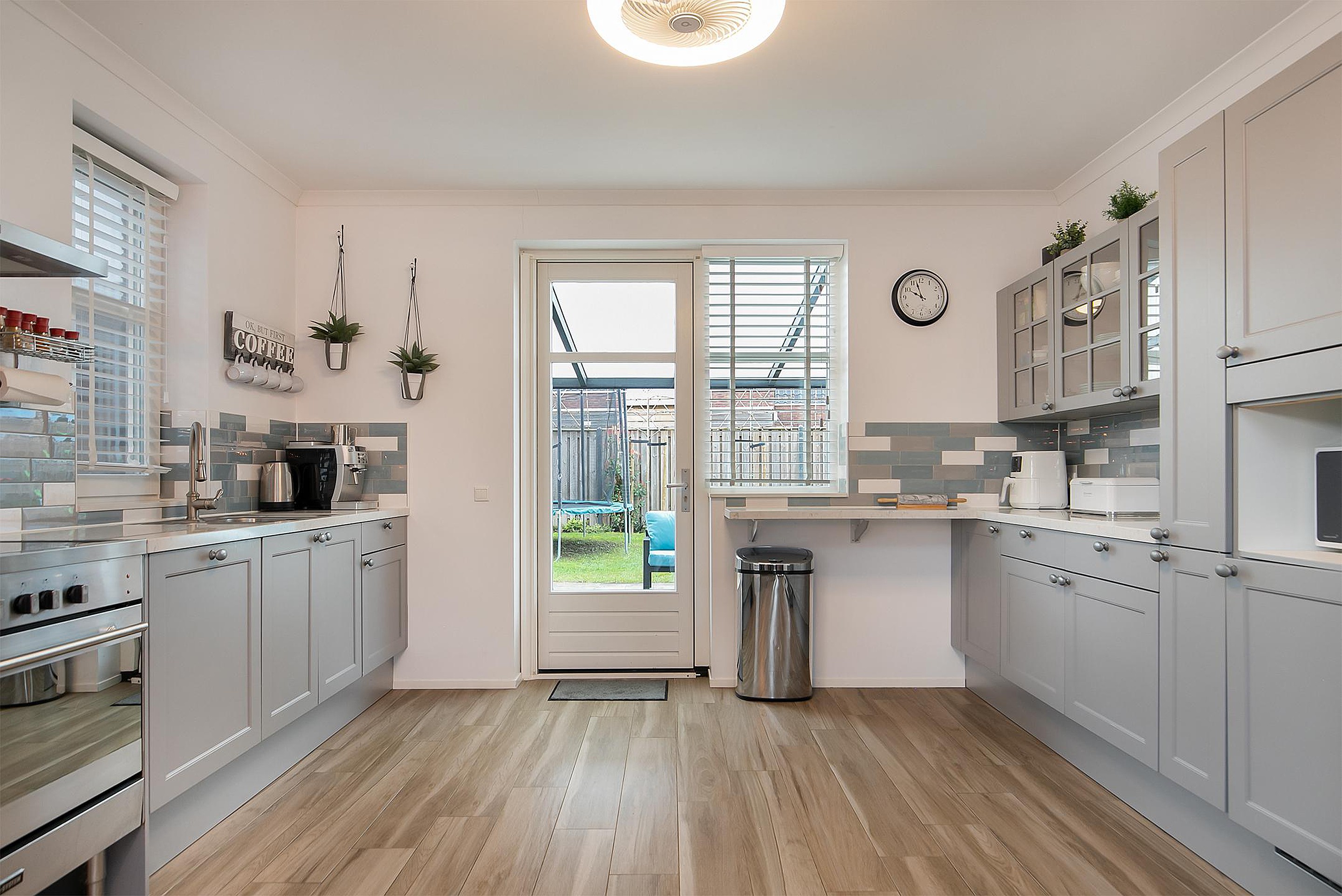 De lichte en royale woonkamer vormt samen met de open keuken een prachtige leefruimte. De keuken is modern, volledig uitgerust en ideaal voor kookliefhebbers. Via de openslaande deuren stap je de ruime achtertuin in, voorzien van een grote overkapping waar je het hele jaar door heerlijk kunt loungen. Vanuit de tuin is tevens de garage/schuur toegankelijk.
