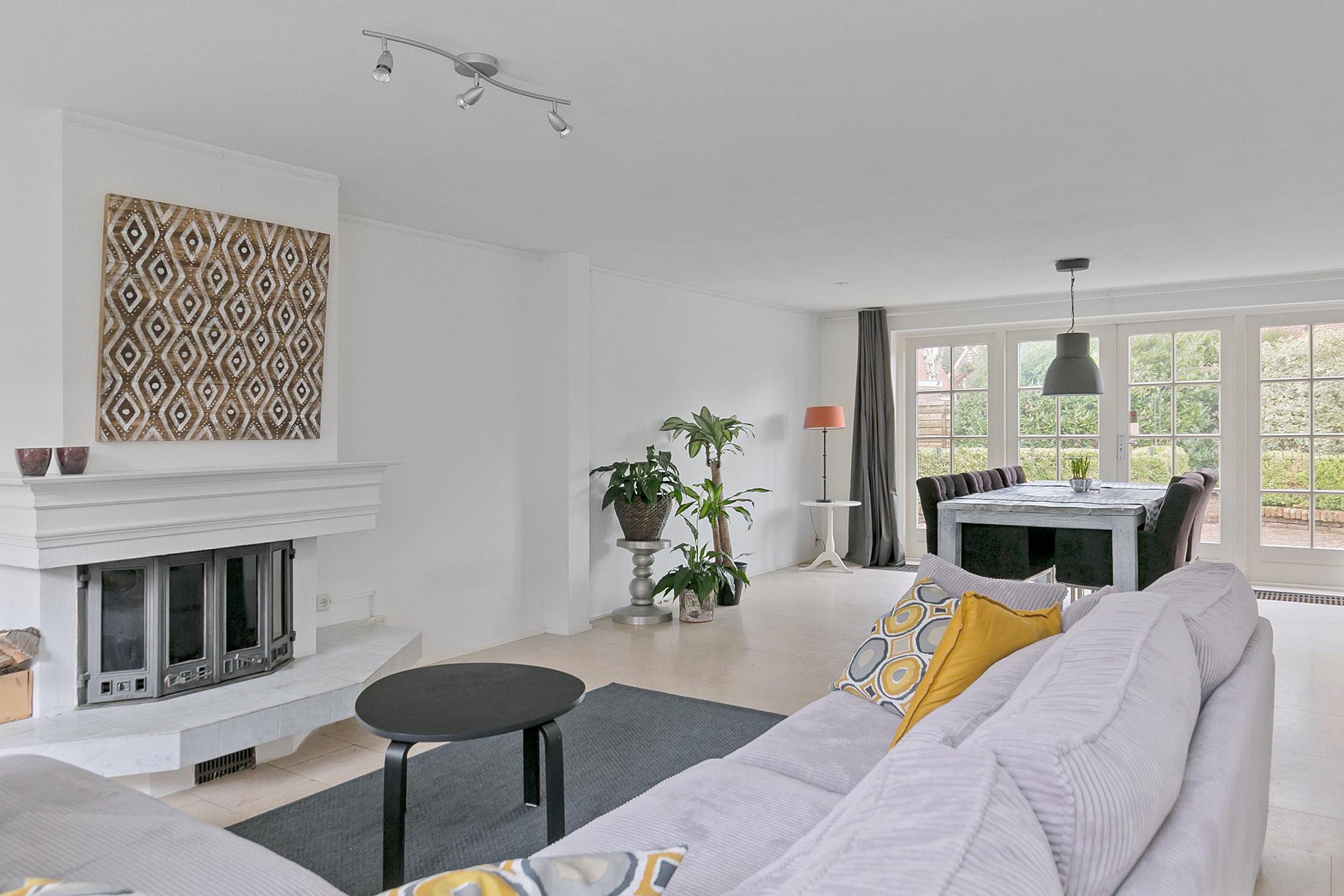 De woonkamer is ruim en sfeervol ingericht met een travertin vloer, open haard en openslaande deuren naar de tuin – perfect voor lange zomeravonden.