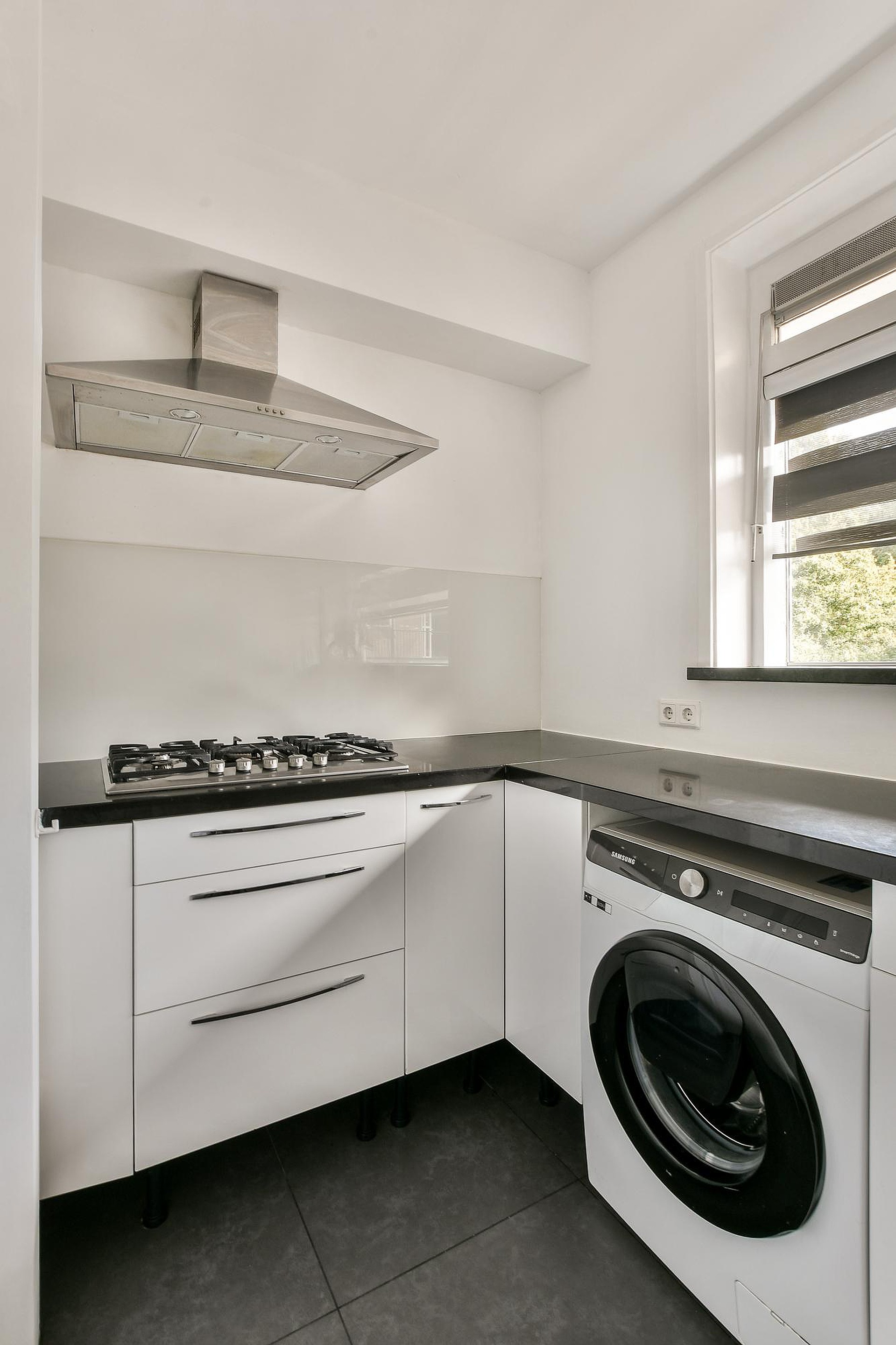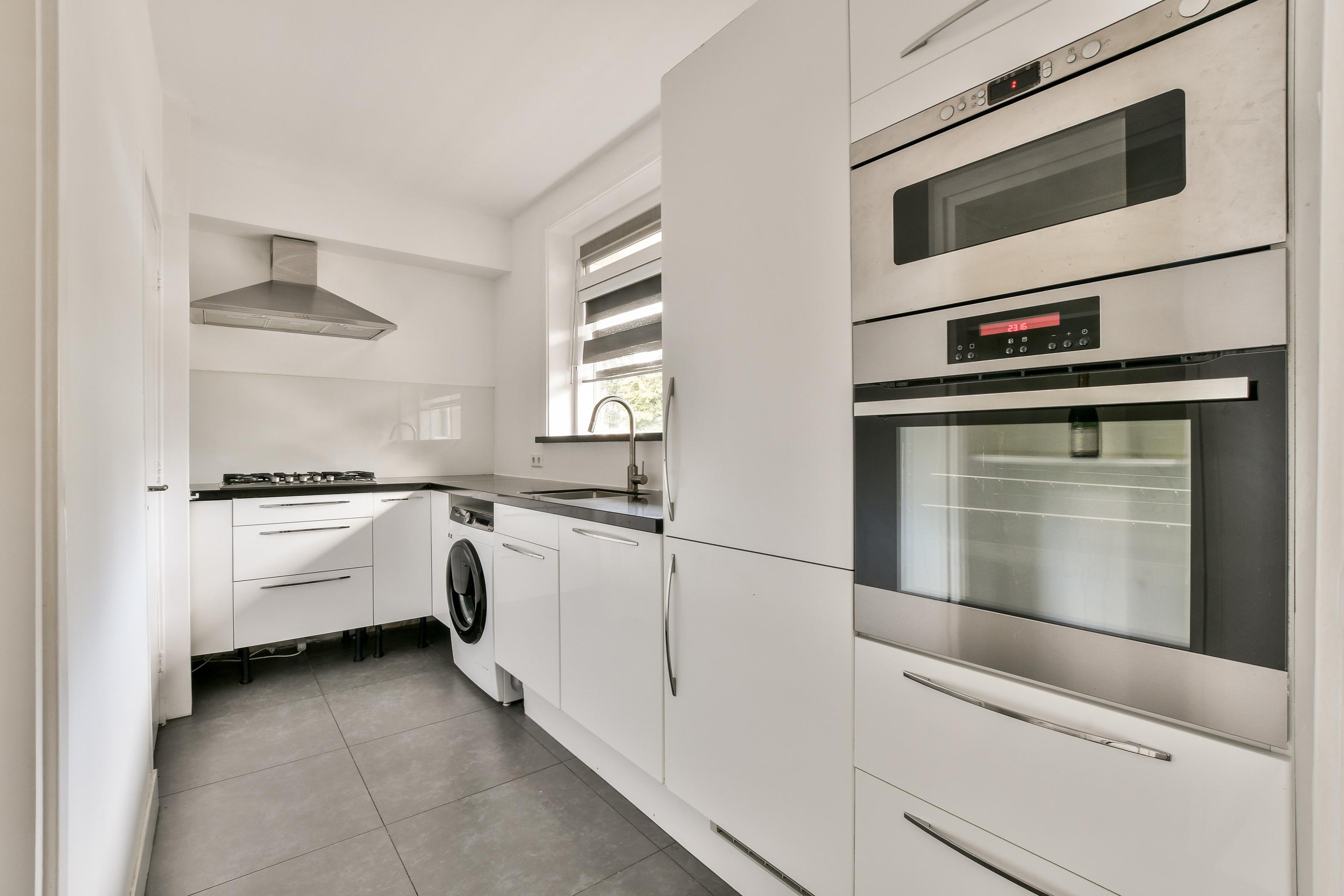 De moderne lichte keuken is voorzien van inbouwapparatuur zoals een oven, magnetron, rvs afzuigkap, 5-pits gaskookplaat, koel-vriescombinatie, en een wasmachine.