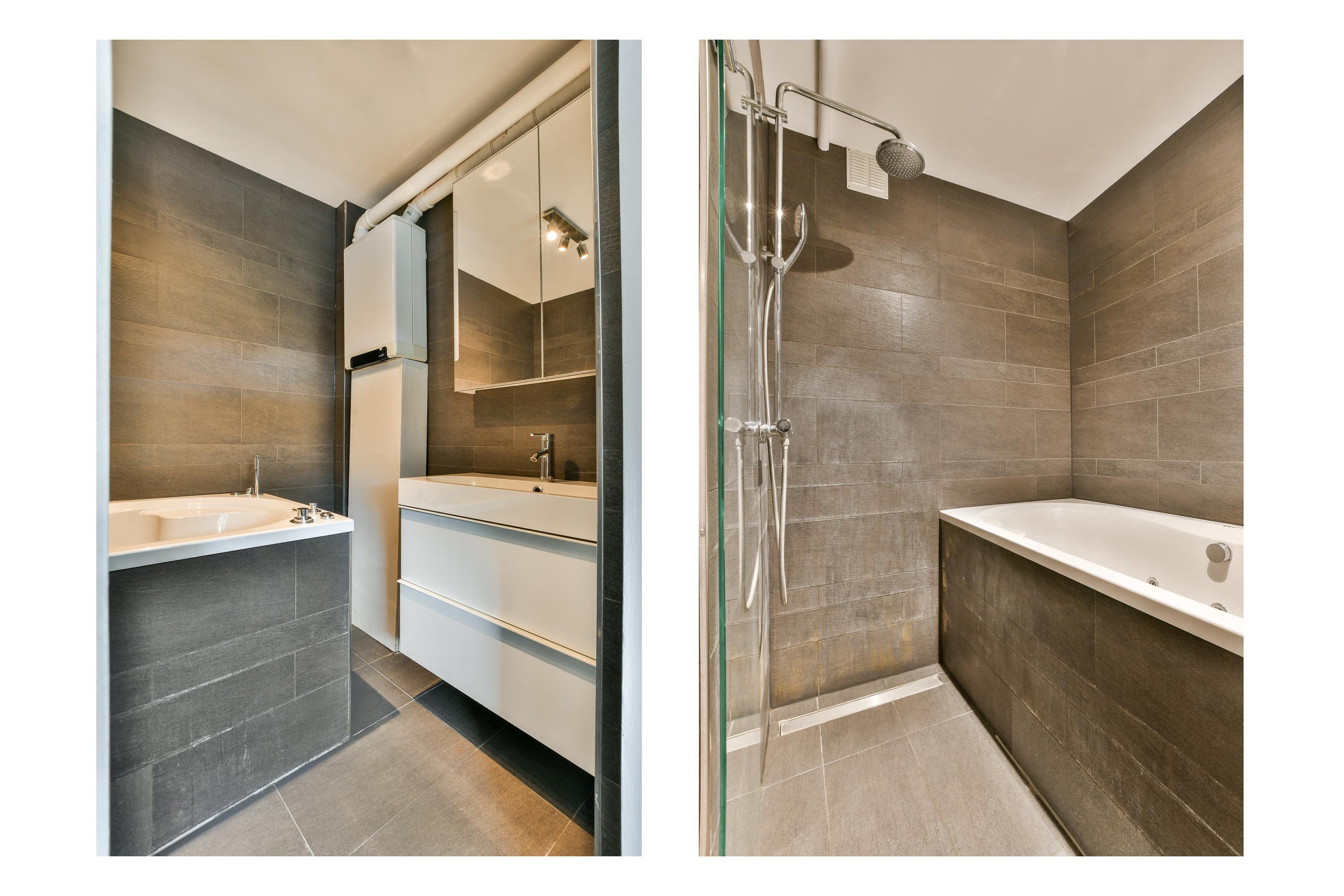 De luxe badkamer is modern uitgevoerd met een inloop regendouche, wastafelmeubel, spiegel met kast en ligbad. Geheel stijlvol betegeld tot aan het plafond. Daarnaast is er een apart modern zwevend toilet met fontijn.